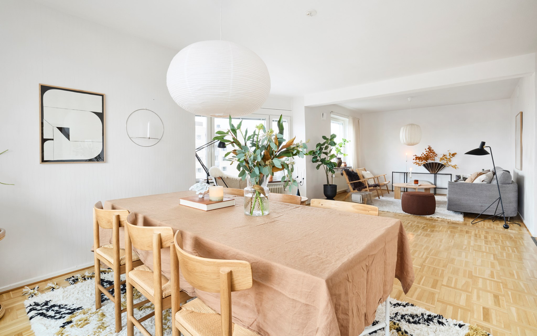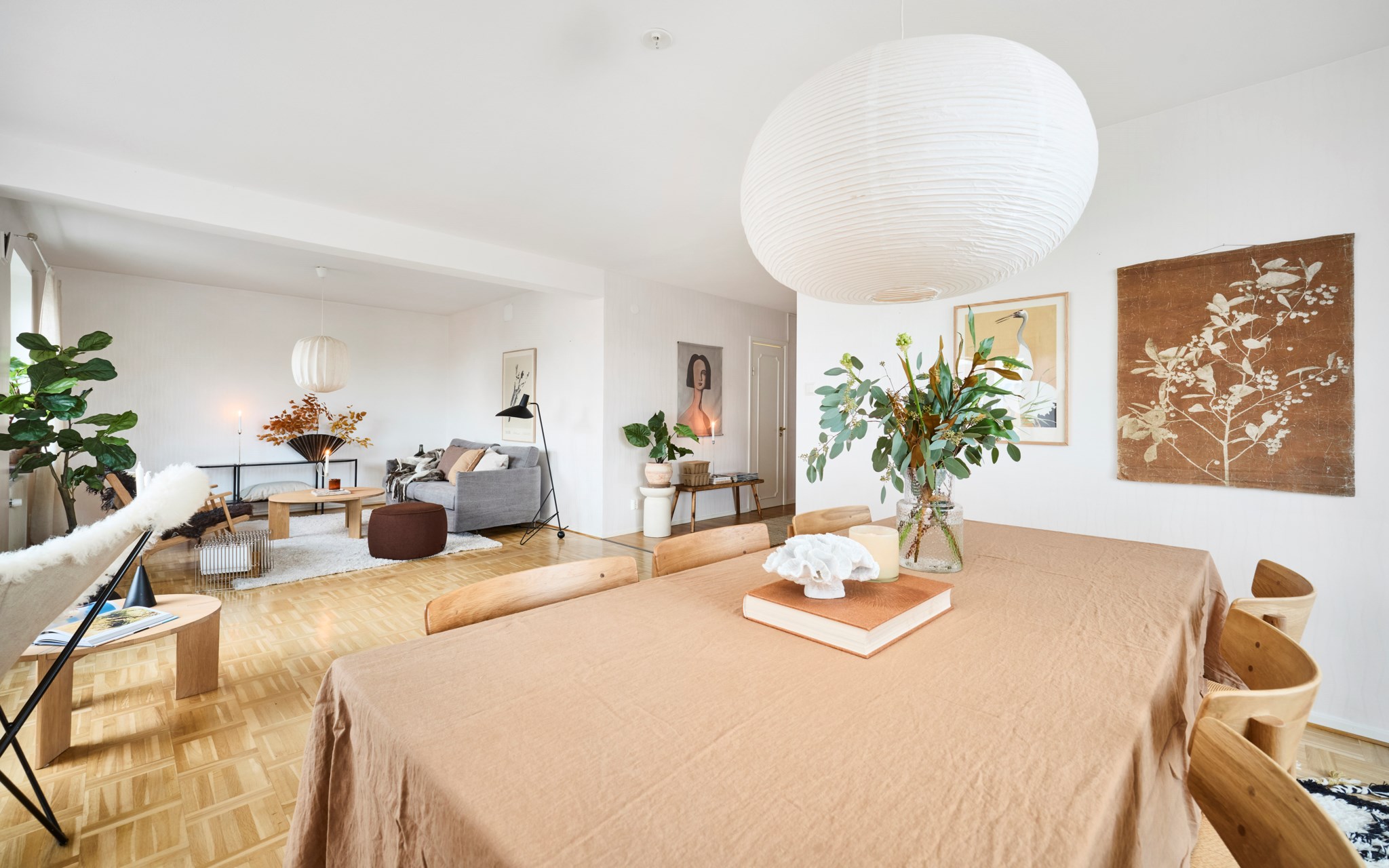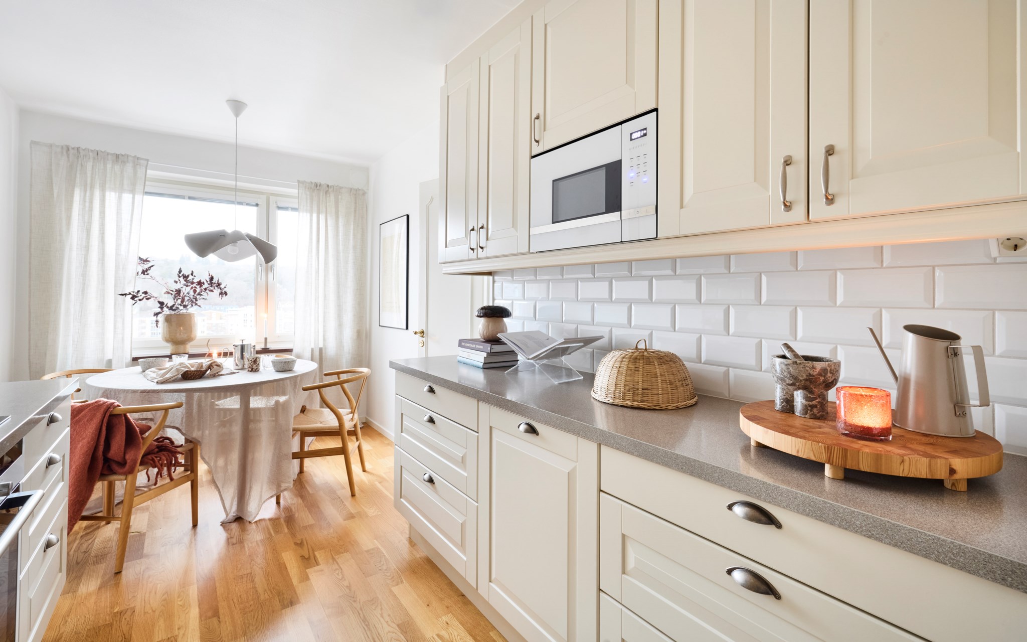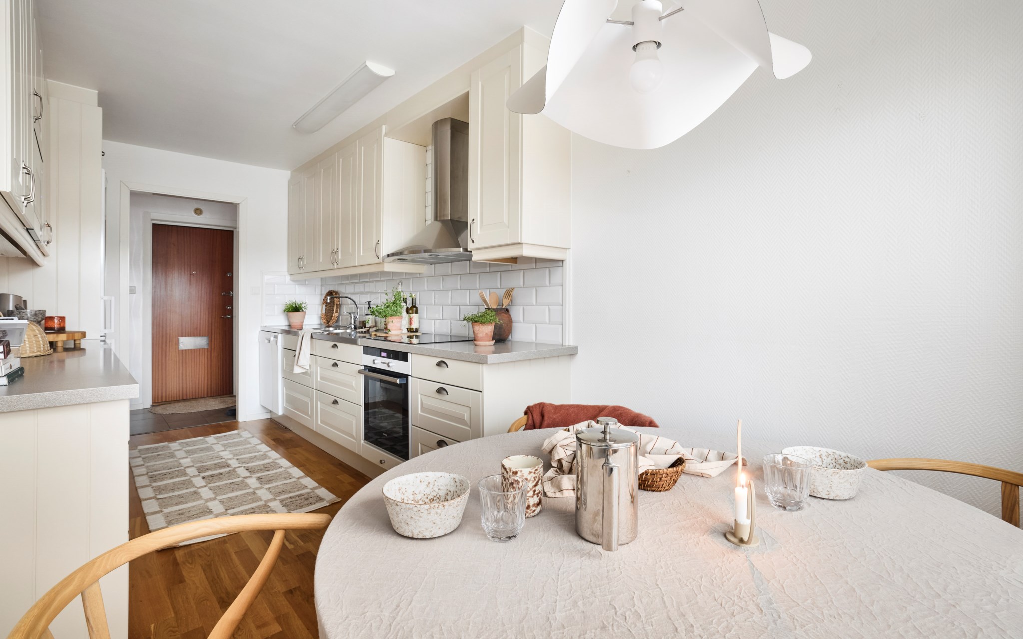 Köket är i paritet med lägenheten, med arbetsbänkar på båda sidor och förvaringspotential som i en smärre villa. Arbetsbänkar i laminat och lådor och skåp med diskret antikprofil. Allt i mycket fint välvårdat skick, vilket också gäller vitvarorna. Här har morgonägget lika perfekt gula som kvällssolen över Bymarken. Fönstret vetter alltså in mot föreningens gröna gård långt där ner, men kanske känner du dig mer som granne med grönskan i Stadsparken. Matbordet kan vara både runt eller kantigt, och ledigt plats för 4-5 till bords. Golvet samma enhetliga som i hall och sovrum.