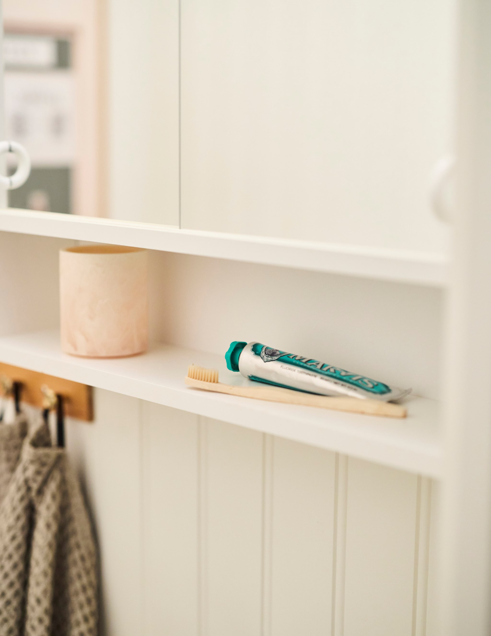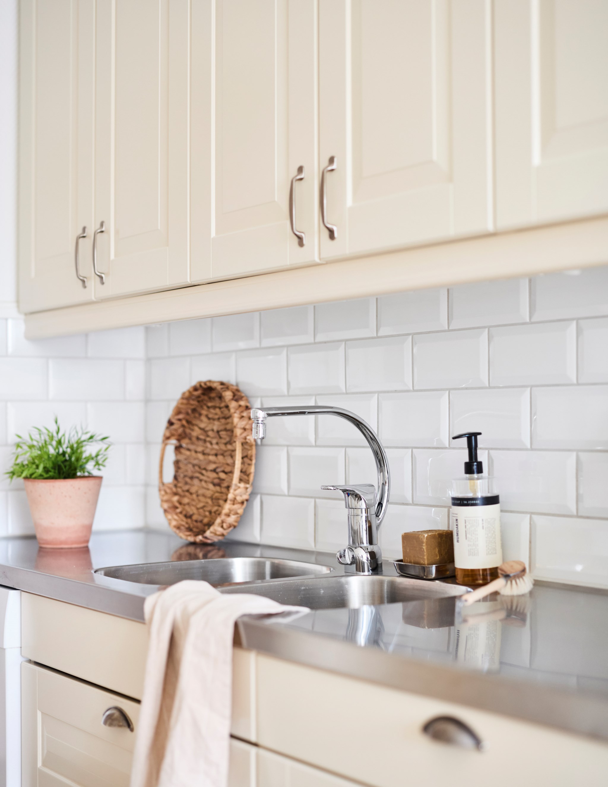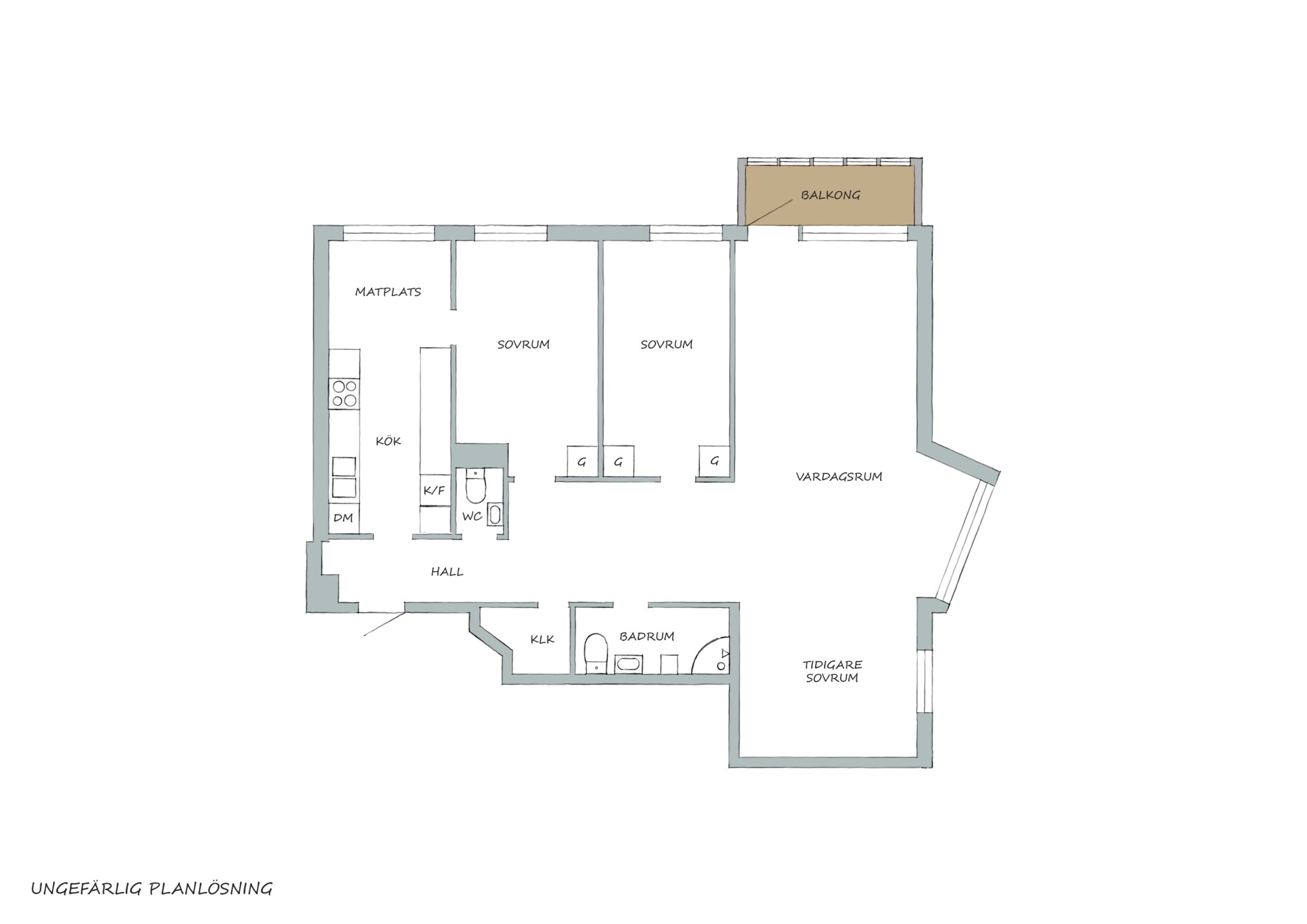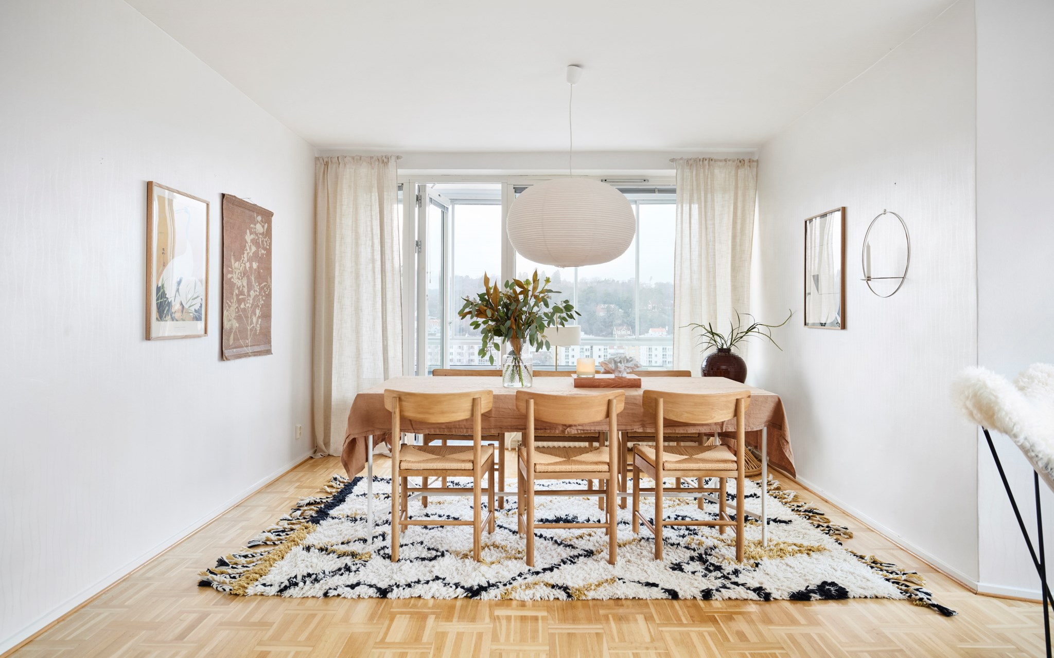 Köket är i paritet med lägenheten, med arbetsbänkar på båda sidor och förvaringspotential som i en smärre villa. Arbetsbänkar i laminat och lådor och skåp med diskret antikprofil. Allt i mycket fint välvårdat skick, vilket också gäller vitvarorna. Här har morgonägget lika perfekt gula som kvällssolen över Bymarken. Fönstret vetter alltså in mot föreningens gröna gård långt där ner, men kanske känner du dig mer som granne med grönskan i Stadsparken. Matbordet kan vara både runt eller kantigt, och ledigt plats för 4-5 till bords. Golvet samma enhetliga som i hall och sovrum.