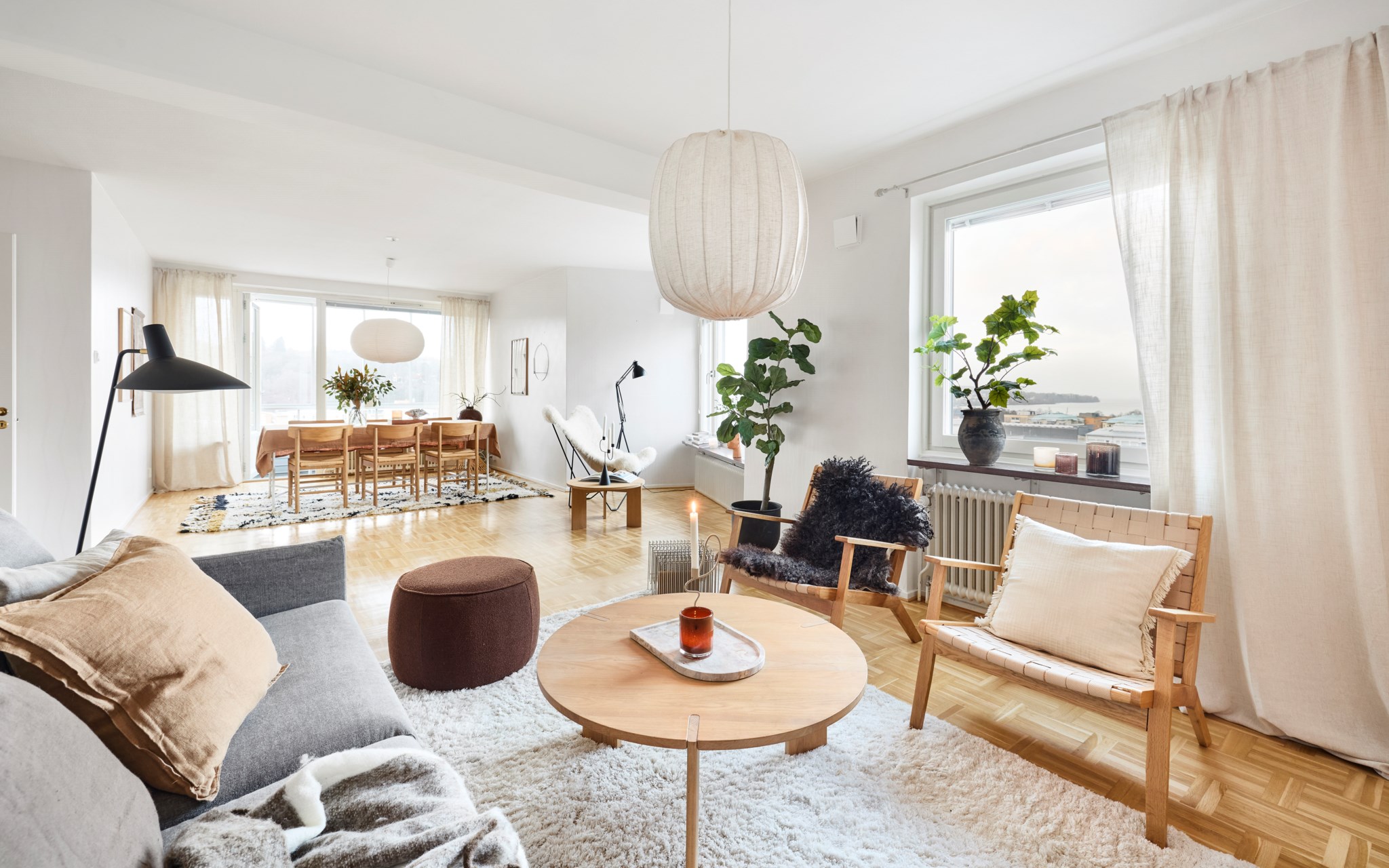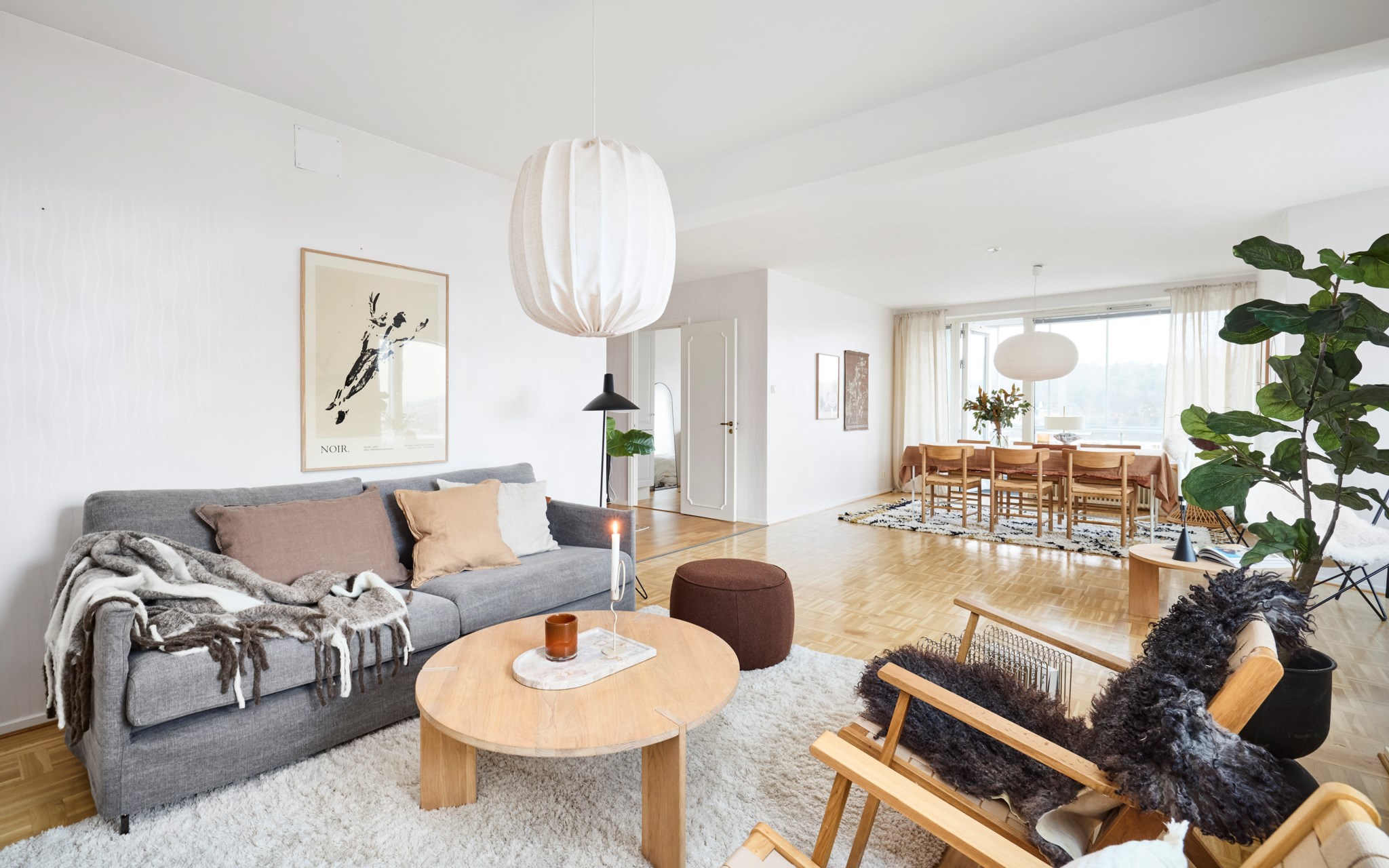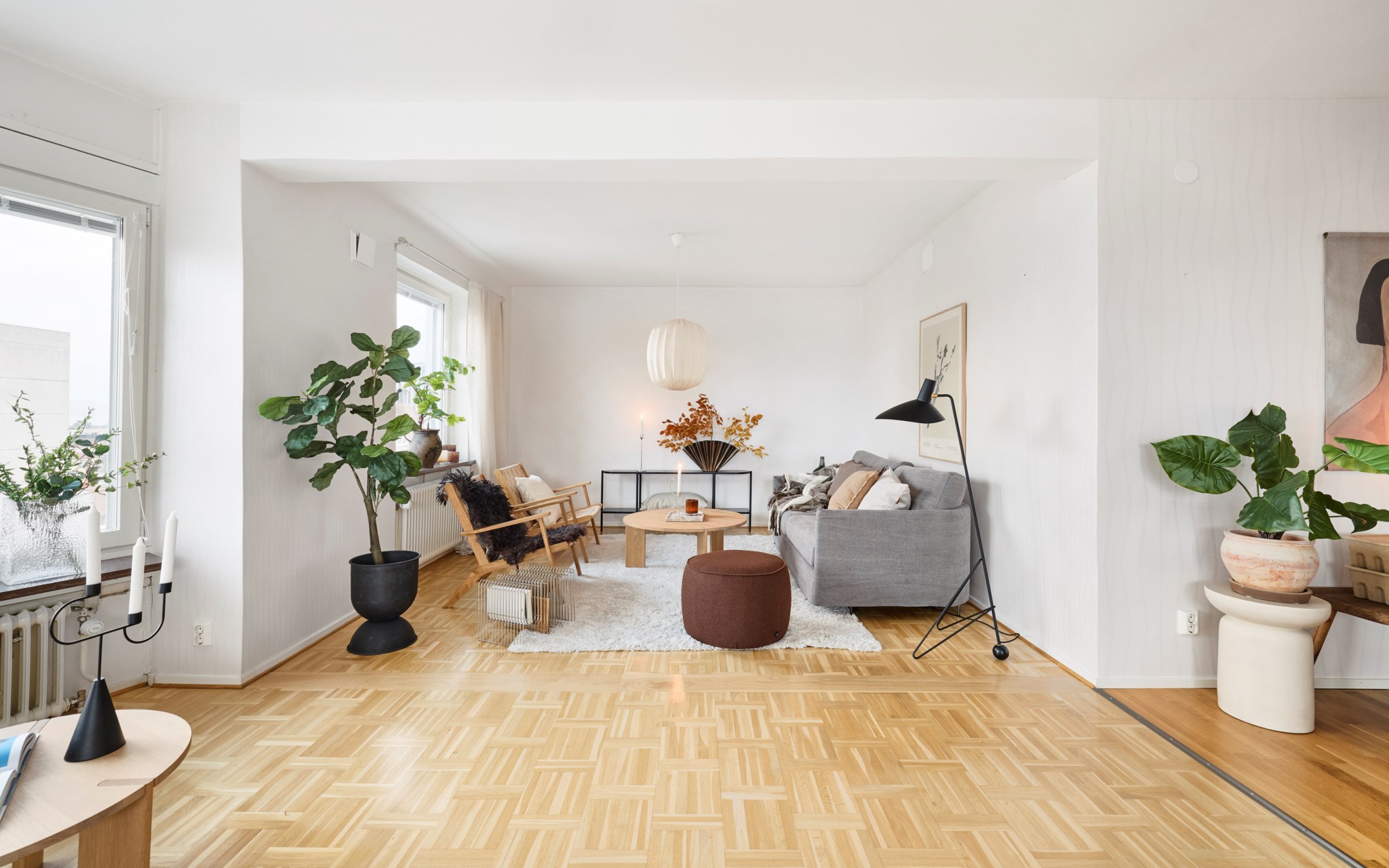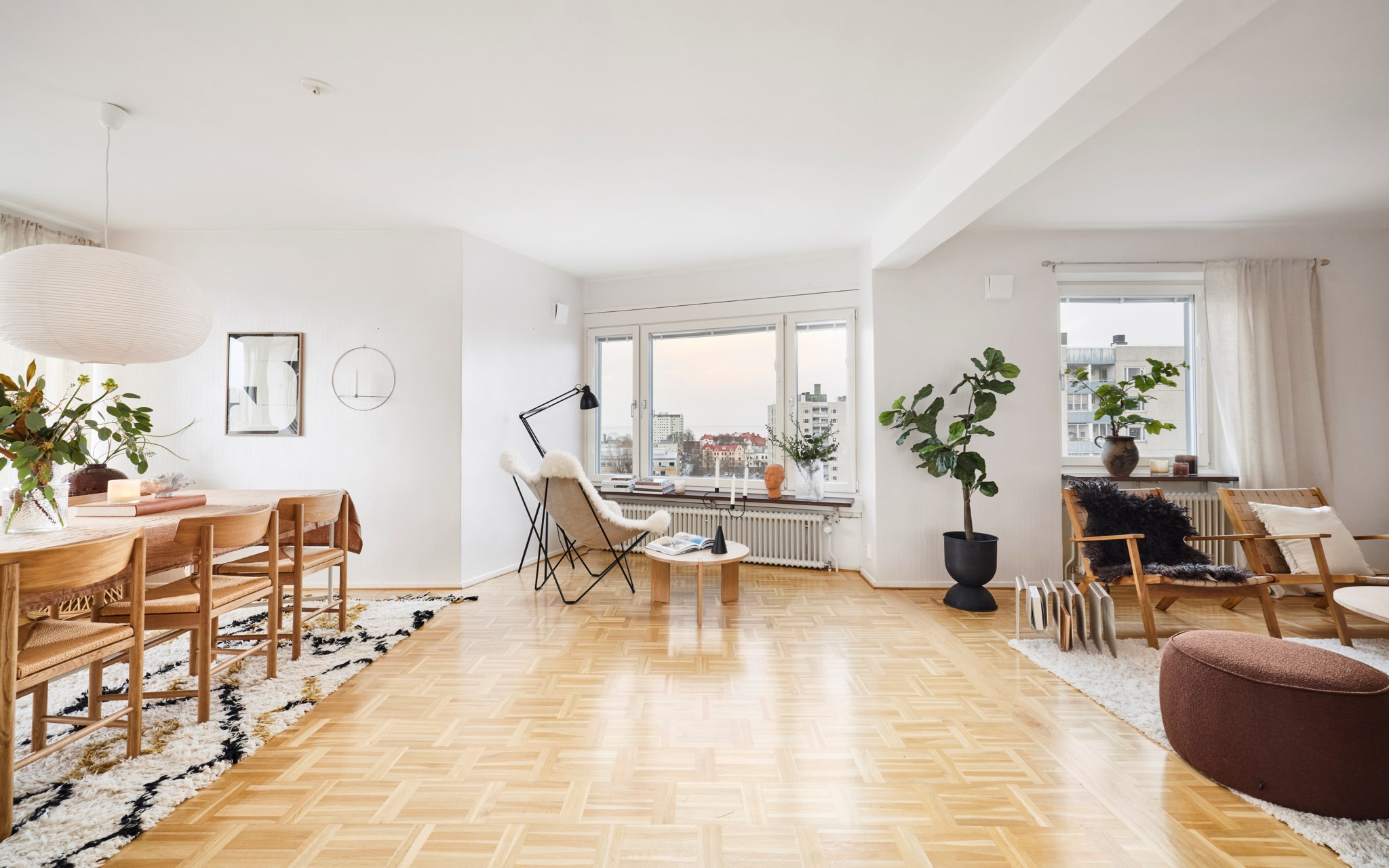 Den möblerbara hallen tar dig bort till vardagsrummet och du får det stora panoramafönstret i siktlinje direkt, vilket visar sig vara ett burspråk som vinklar ut från fasaden för maxat synfält. Den mörkröda kalkstensbänken lite extra djup här dessutom. Dagens stora vardagsrum har varit delat till ett sovrum tidigare, men det är nog inget du längtar tillbaka till. Magnifik storlek som det är i dag med plats för både pampigt matbord och både en och två stora soffor om du vill. Parketten är den ursprungliga och matchar den nyare i övriga lägenheten bra. Solnedgångarna kommer spela i en division för sig. Och mitt på sommaren kan du även få se solen stiga upp om du är morgonpigg. Insyn endast från Fågelmuseet i Stadsparken.