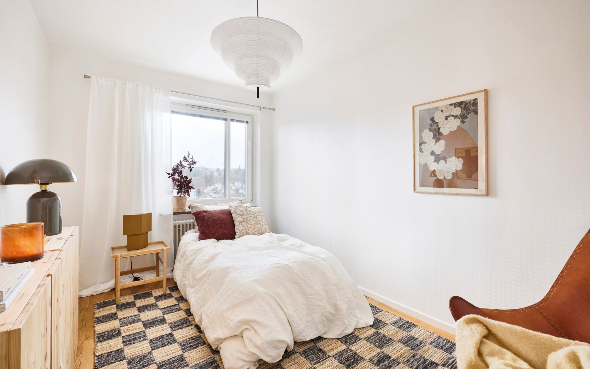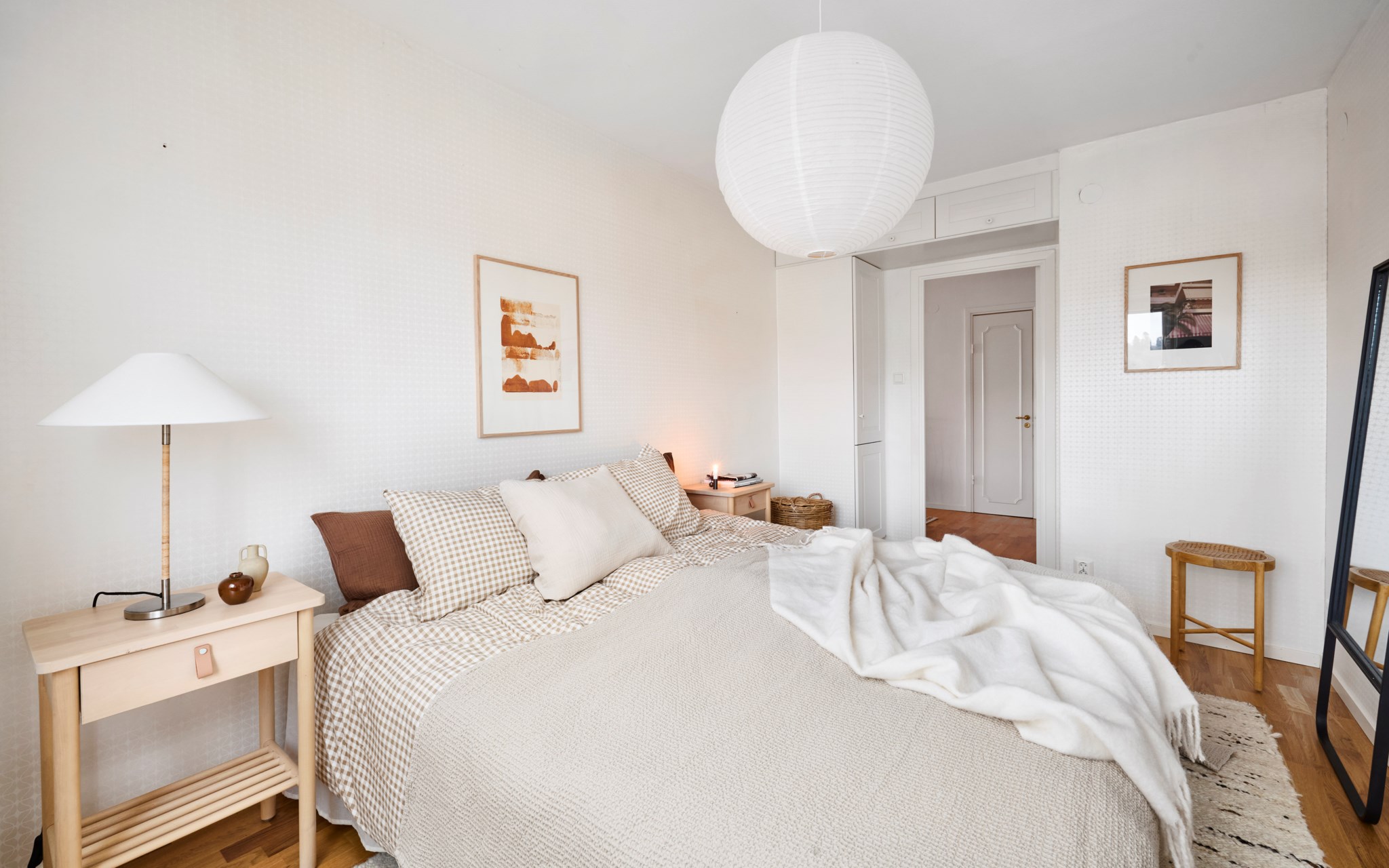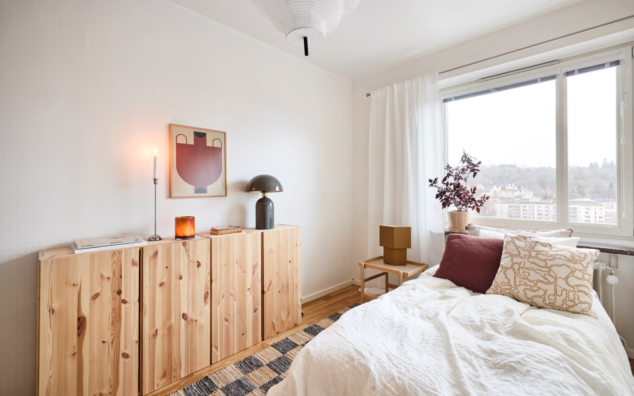 De två sovrummen är lika stora och har fönstren mot gården, samma håll som köket. Rummet närmast har direktpassage in dit dessutom. Fasta garderober i båda rummen. Nyare ekparkett här och fönstren bytta i hela föreningen. Lägg märke till de gamla ursprungliga fönsterbänkarna i tjock dimension som tack och lov fått vara kvar. Båda rummen bereder plats för en dubbelsäng. Från början fanns ett ytterligare sovrum i en del av dagens vardagsrum, vilket så klart skulle gå att återställa.