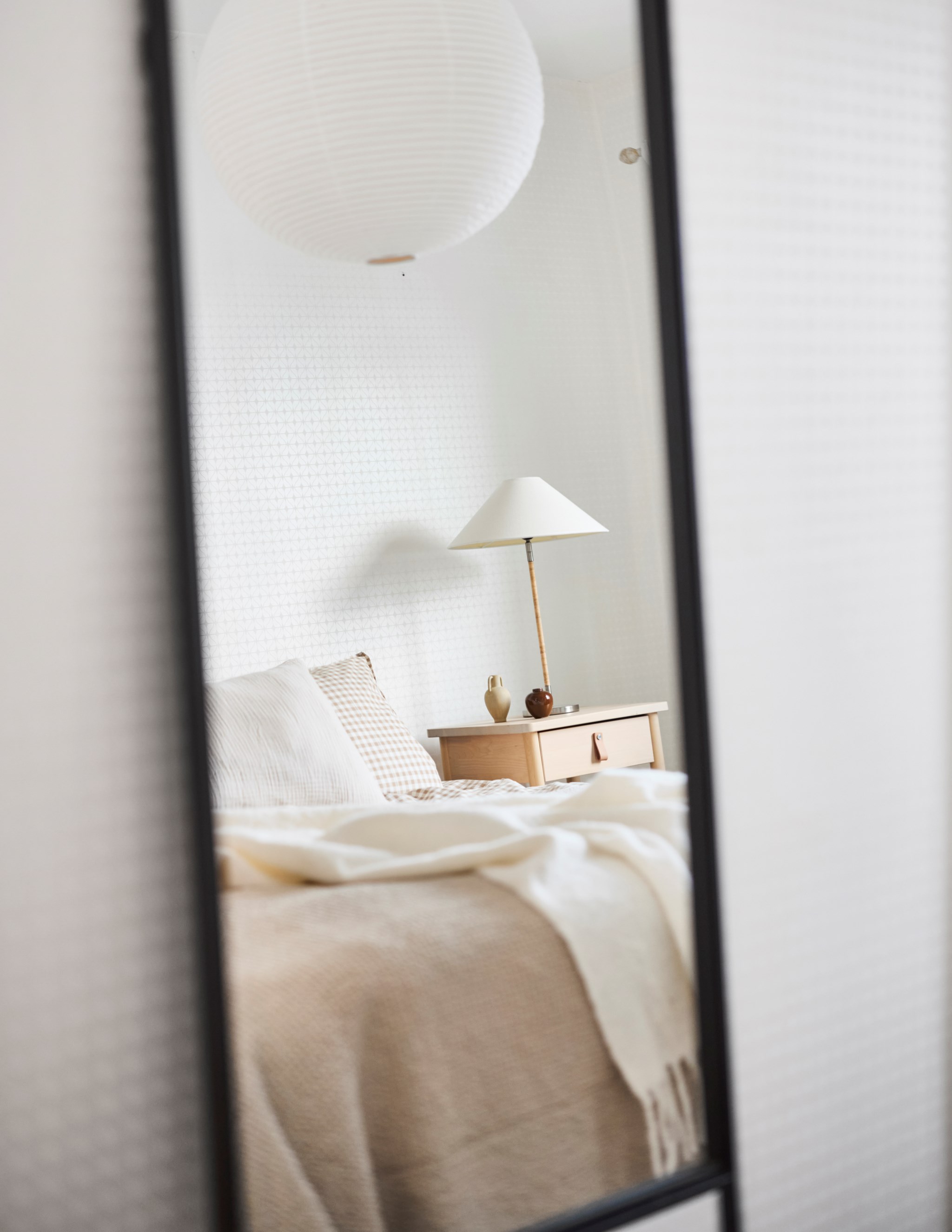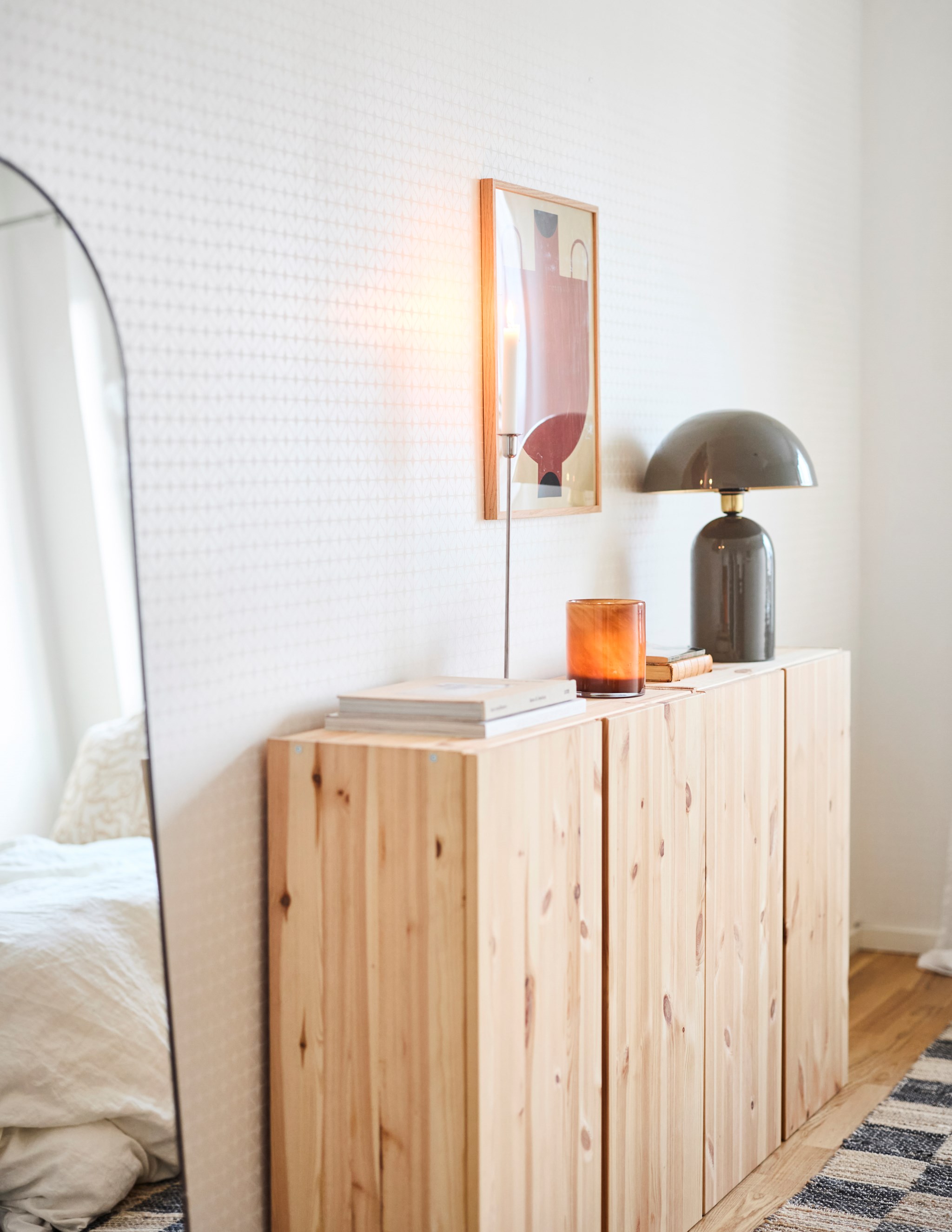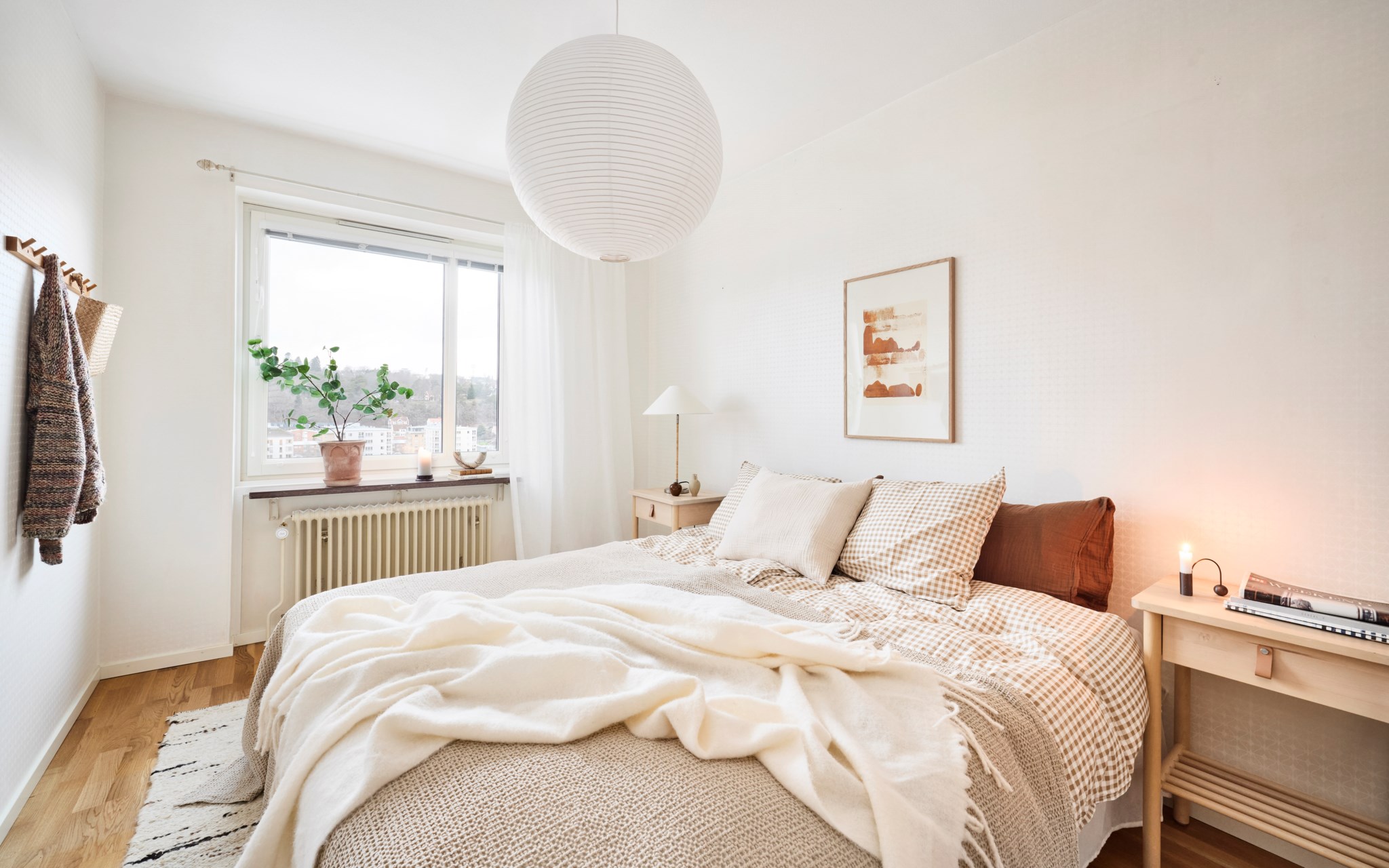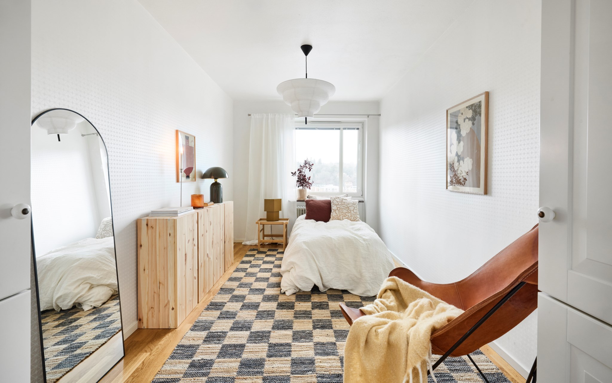 De två sovrummen är lika stora och har fönstren mot gården, samma håll som köket. Rummet närmast har direktpassage in dit dessutom. Fasta garderober i båda rummen. Nyare ekparkett här och fönstren bytta i hela föreningen. Lägg märke till de gamla ursprungliga fönsterbänkarna i tjock dimension som tack och lov fått vara kvar. Båda rummen bereder plats för en dubbelsäng. Från början fanns ett ytterligare sovrum i en del av dagens vardagsrum, vilket så klart skulle gå att återställa.