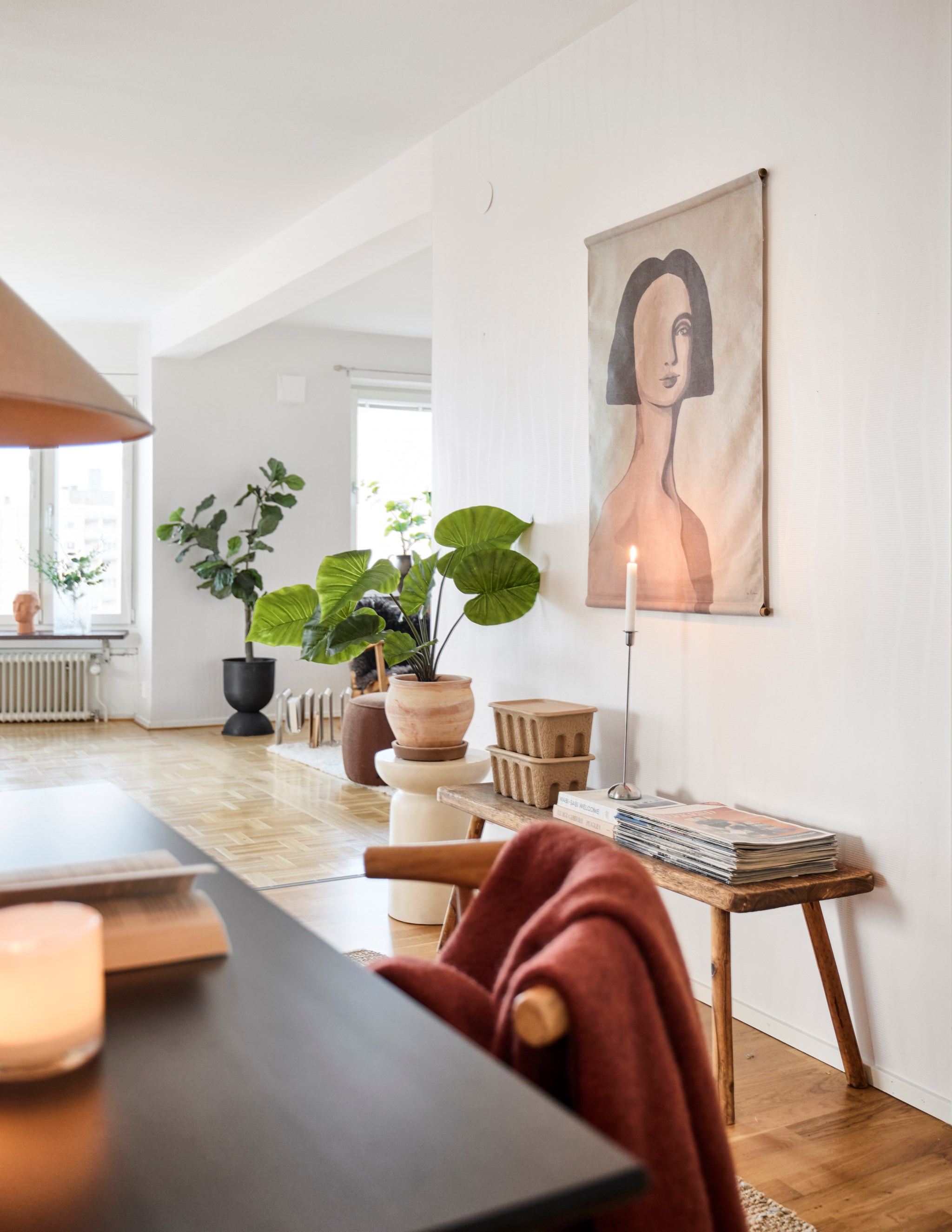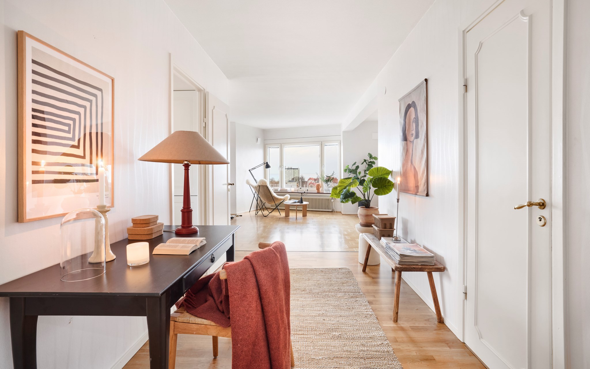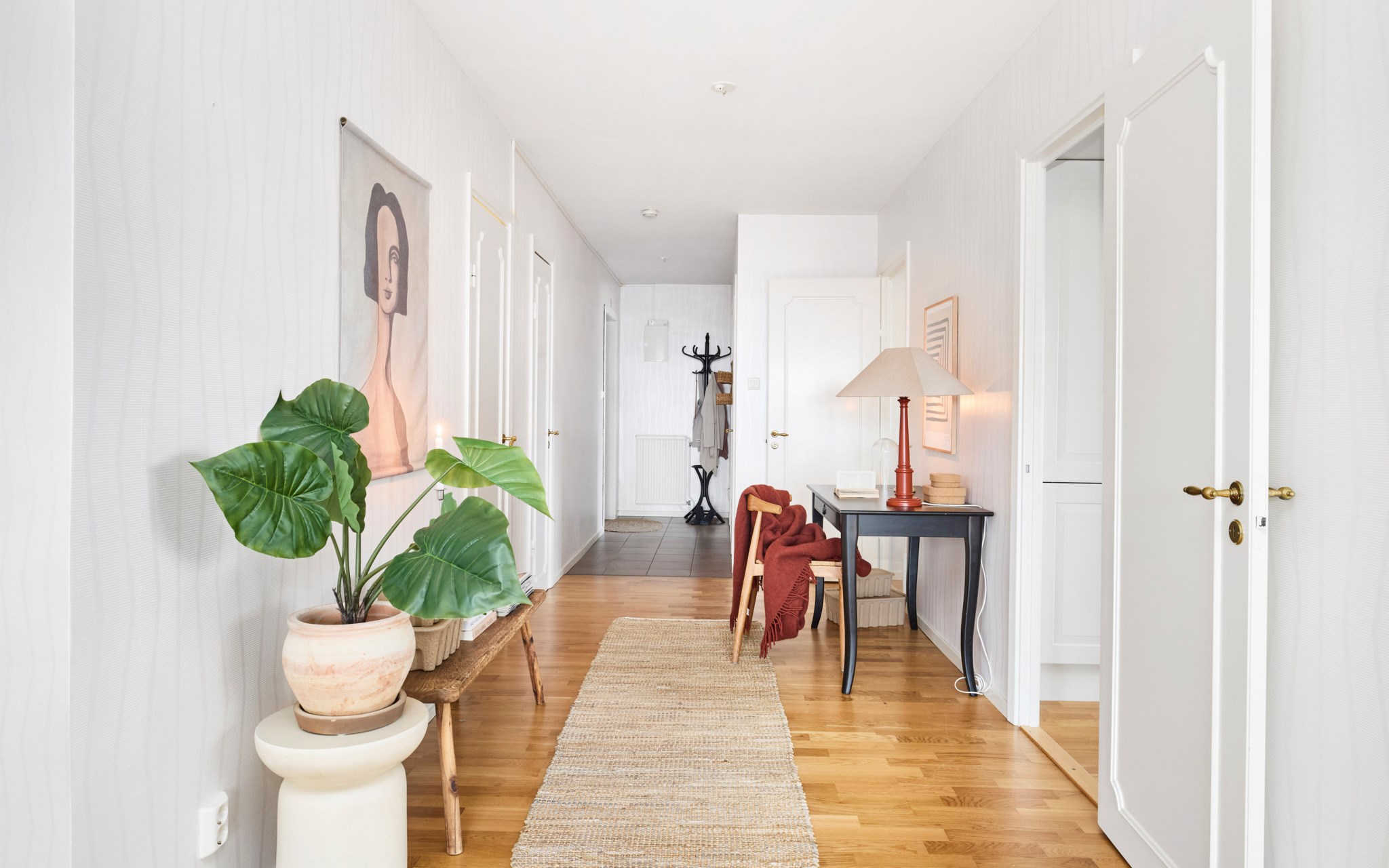 Stort rymligt trapphus med bred svängd trapp ner genom huset. Den röda kalkstenen har inte tappat i lyster och djup på 60 år, tvärt om. Din ytterdörr är både tyst och tät. Innanför dörren ligger stengolv en bra bit in, men i form av klinker. Du får ganska omgående siktlinje genom lägenheten, och du anar att detta kommer bli ljusterapi i finaste form både via köket och borta i vardagsrummet. Tog du trapporna ända upp kommer du inte behöva mer träning idag.