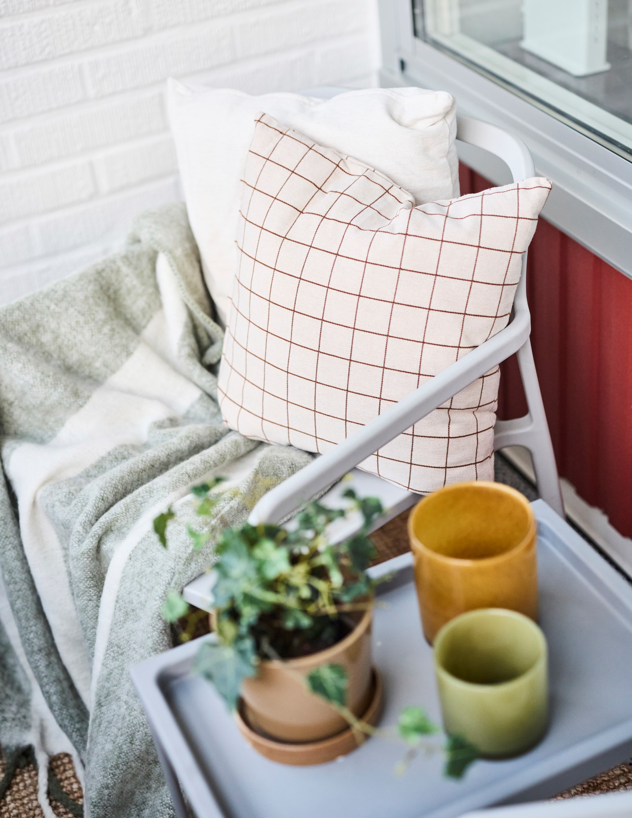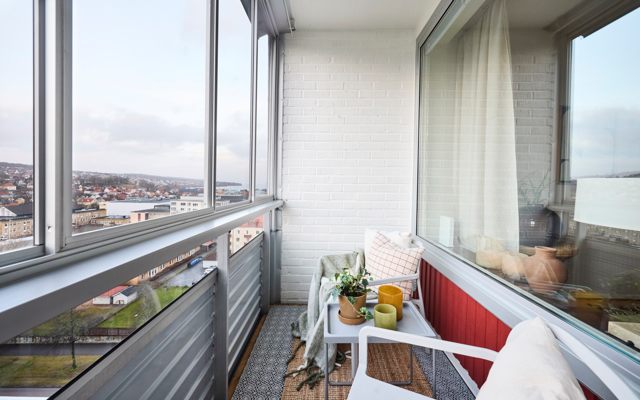 Här sitter du skyddad och nischad in i huskroppen och garanterat ett läge i lä, eftersom du alltid kan stänga till skjutdörrarna i glas. Här har du solen in från lunch ungefär, och sen ger hon sig inte förrän till sena kvällen. Du och dina tomater kan rodna i takt under sommaren. Dra för inglasningen till kvällen även på sommaren så bevarar du solenergin hela natten. Mer ömtåliga växter kan säkert övervintra här ute, om det inte blir allt för mycket under nollan.