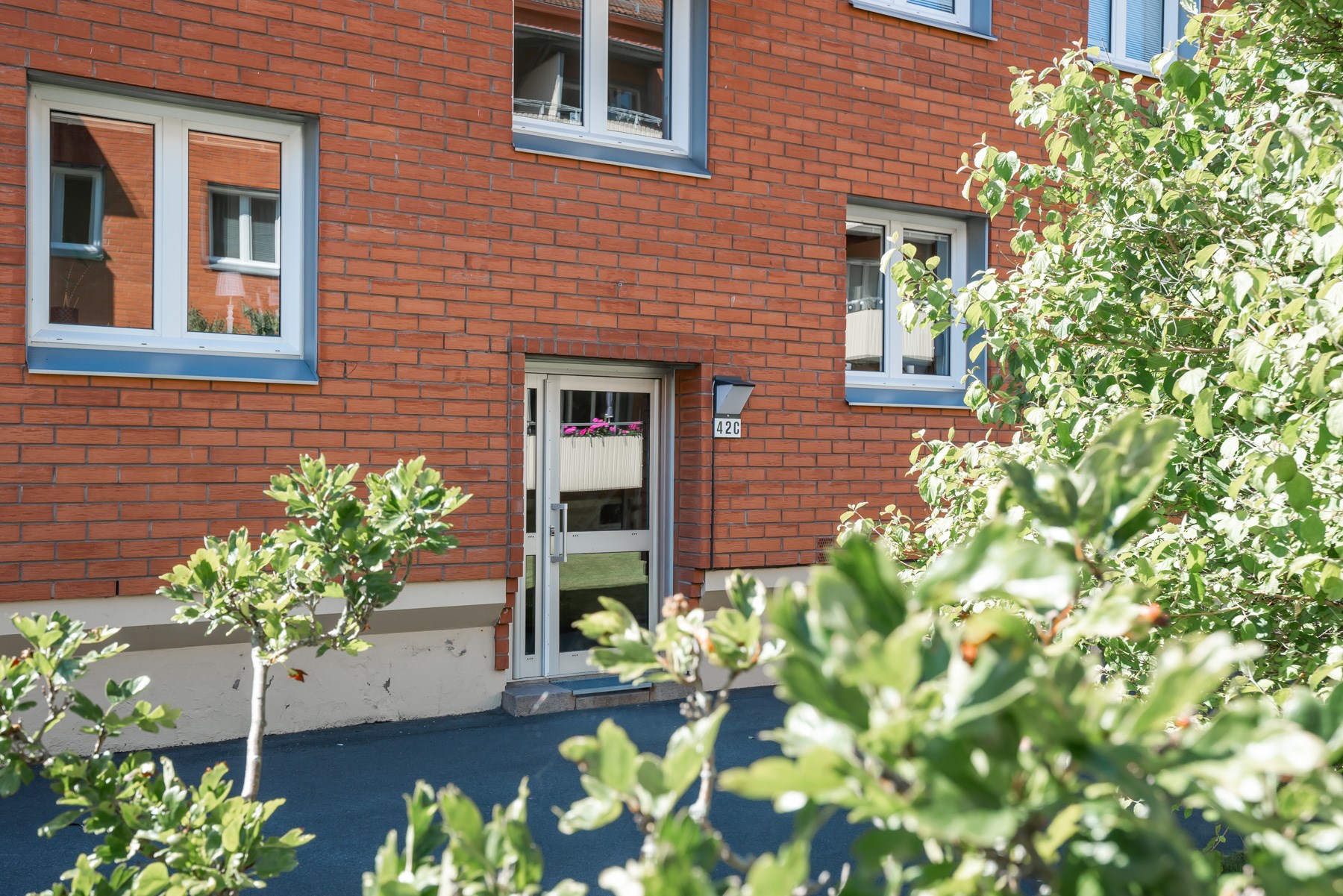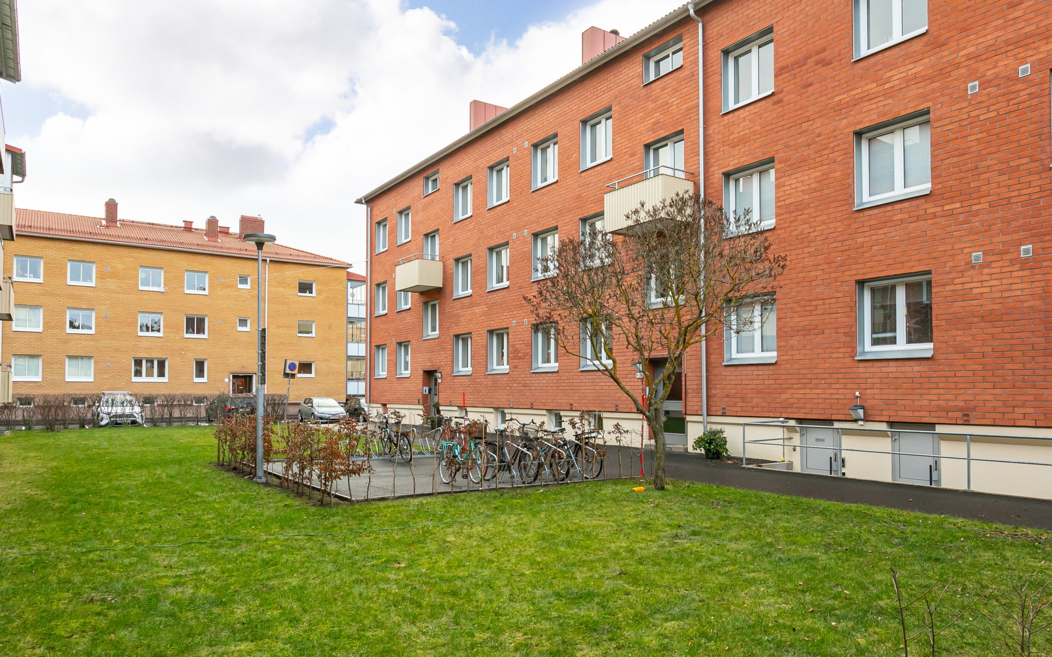 Gården är välskött med gräsmatta och bra cykelparkering. Hit är det trevligt att komma hem.