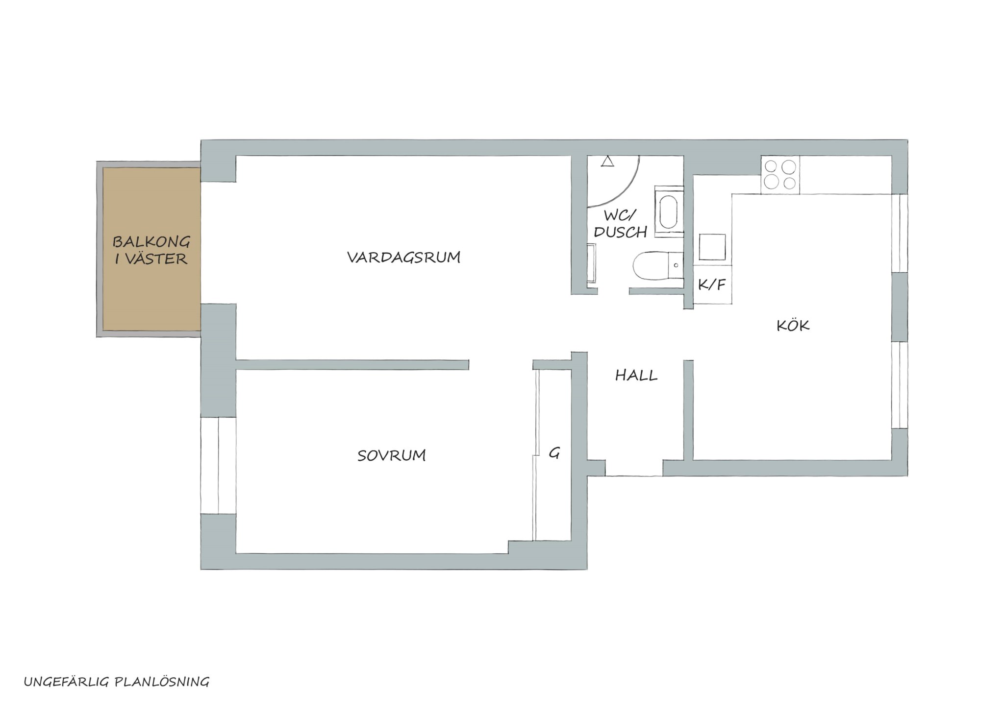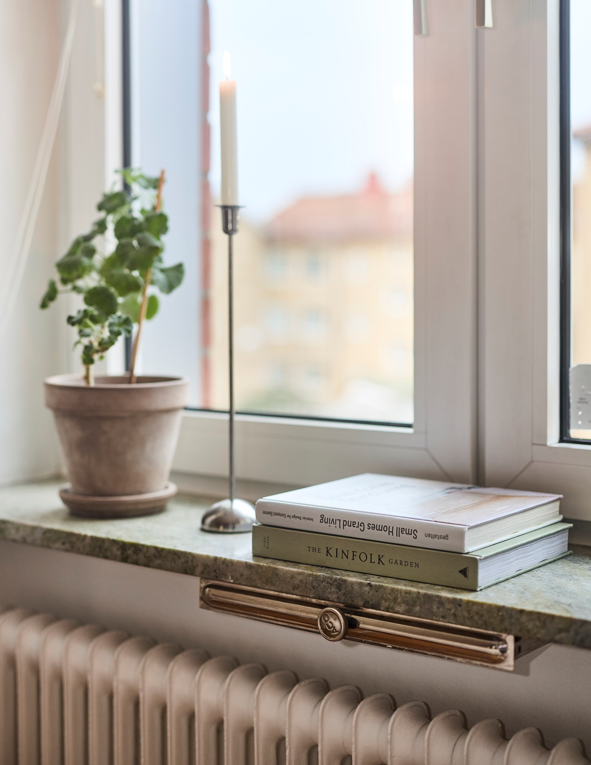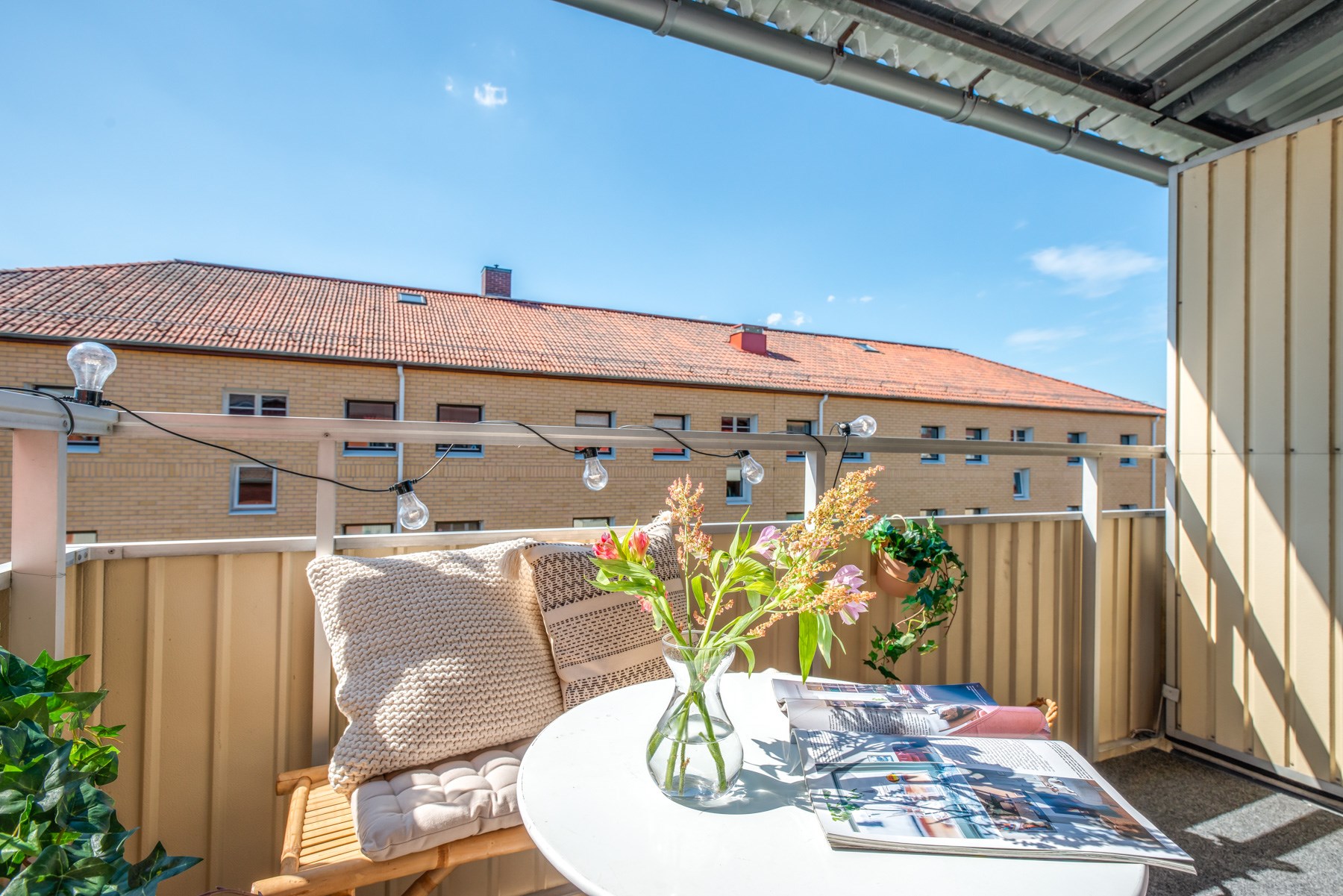 Balkongen är oväntat stor och kan rymma både sittgrupp och solstol om du vill. Eller en hel hög med vänner. Soliga dagar kommer strålarna runt hörnet mitt på dagen och stannar till en bra bit in på kvällen. Regnar det? Då kan du fika här i alla fall, du har ju ett ordentligt tak som skyddar. En garanterad favorit i extrarum-kategorin.