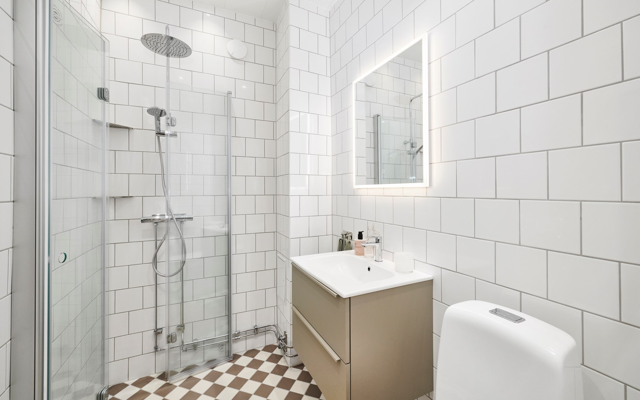 Badrummet är nyrenoverat 2025. Här hålls dina fötter varma tack vare den elburna golvvärmen. Våtrumsintyg efter utfört arbete finns.
