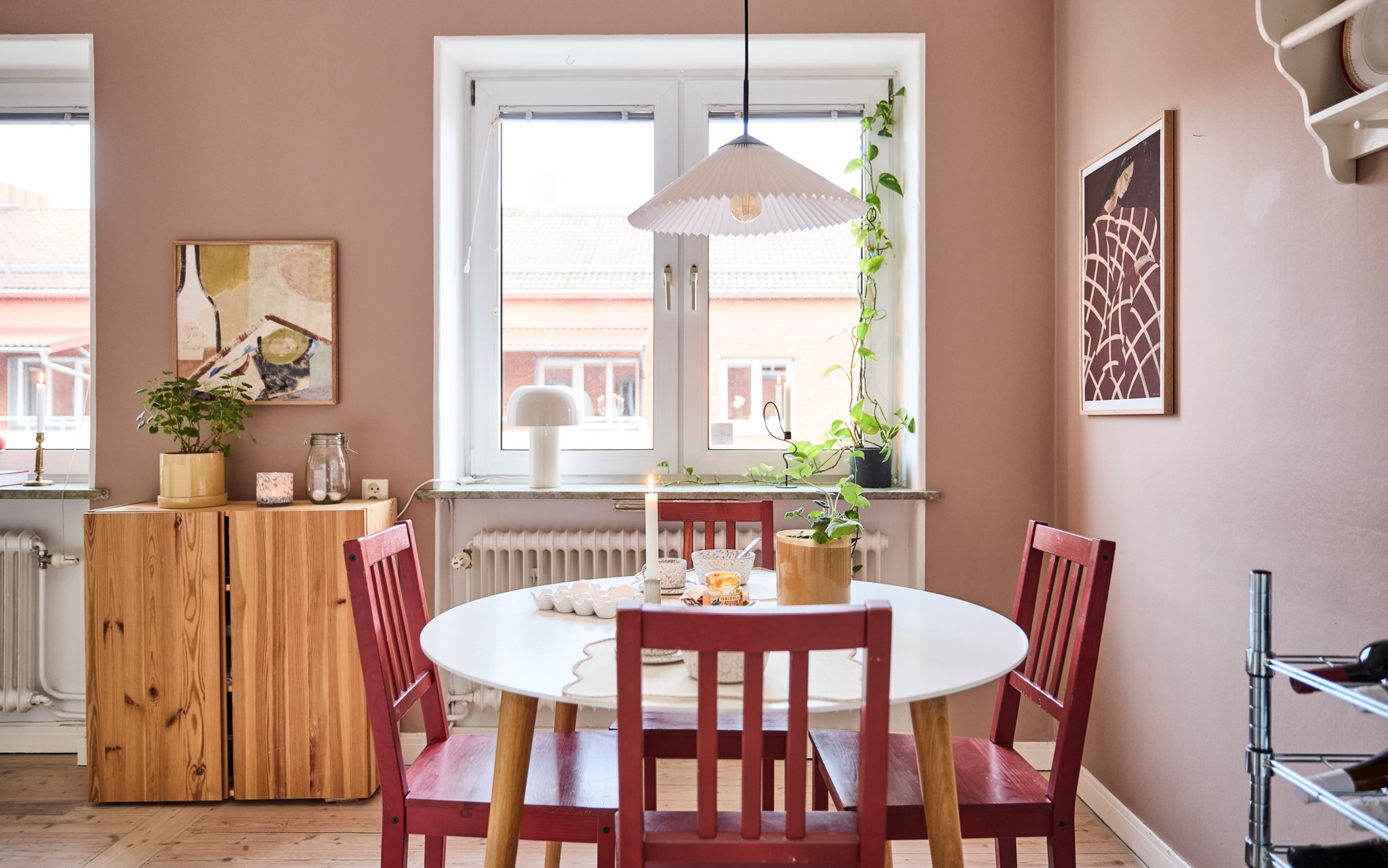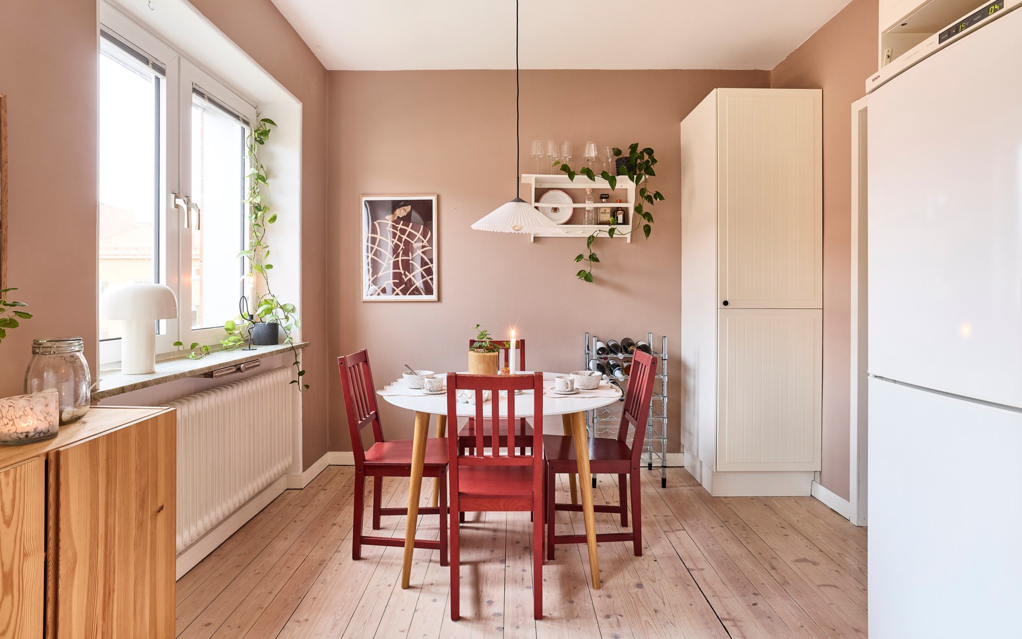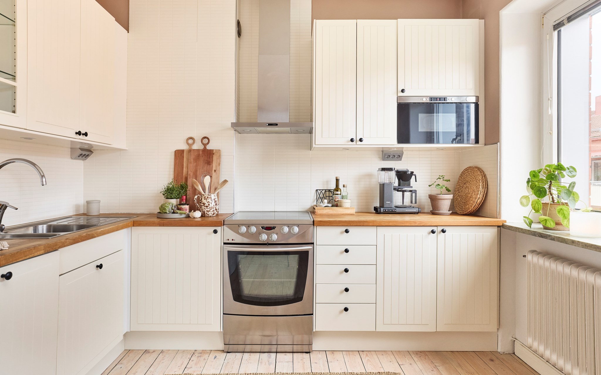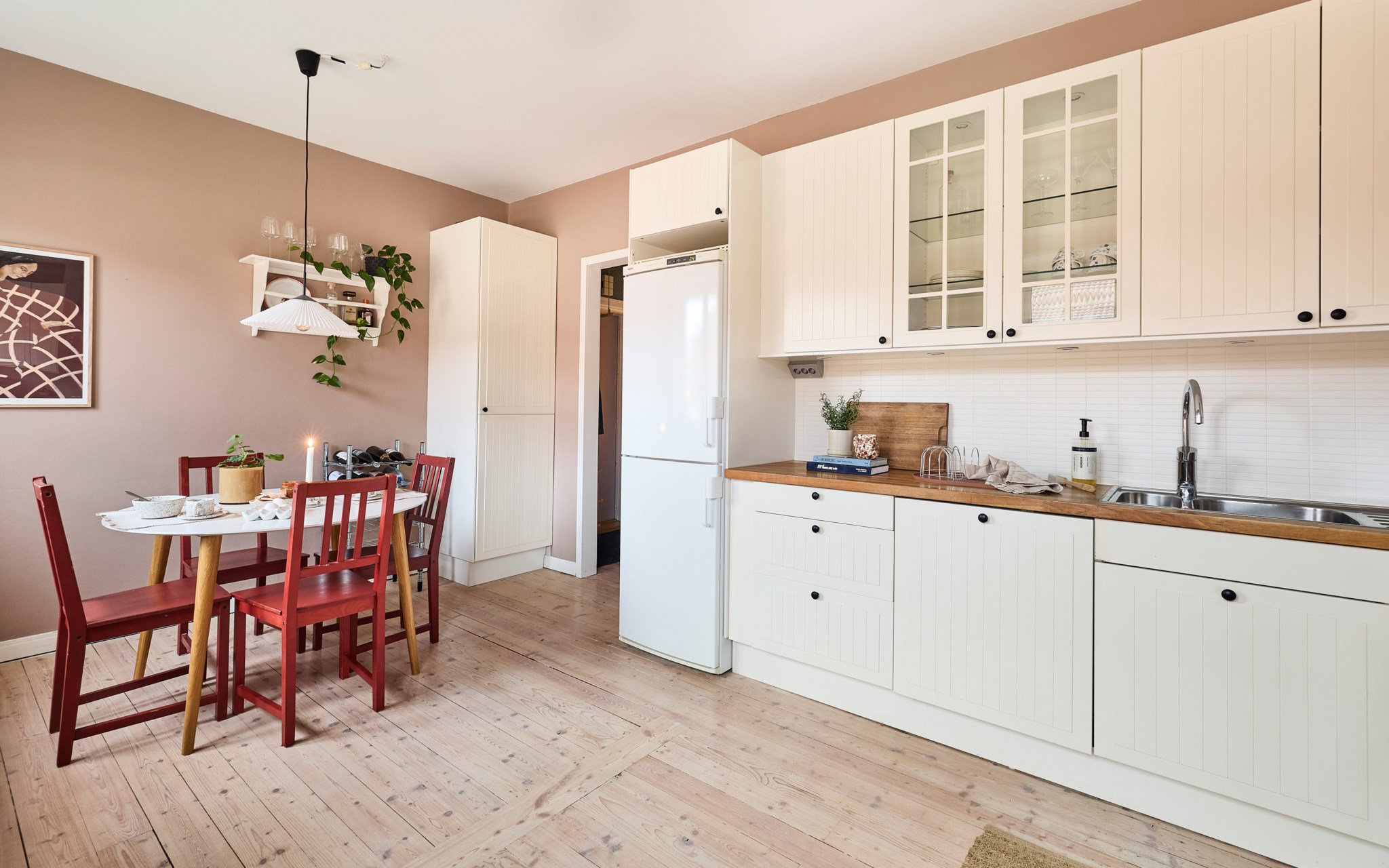 Oh la la, snacka om kök med svängrum! En gång i tiden delades rummet av en vägg, men ingen är ledsen för att den togs ner. Nej, här kan du ju duka långbord om du vill. Takhöjden gör att du kan maxa förvaringen på höjden, men det finns redan mycket skåp så de kanske räcker till. Även arbetsytan är osnålt tilltagen, men vill du ha ännu mer plats, ställ en köksö i rummets mitt.