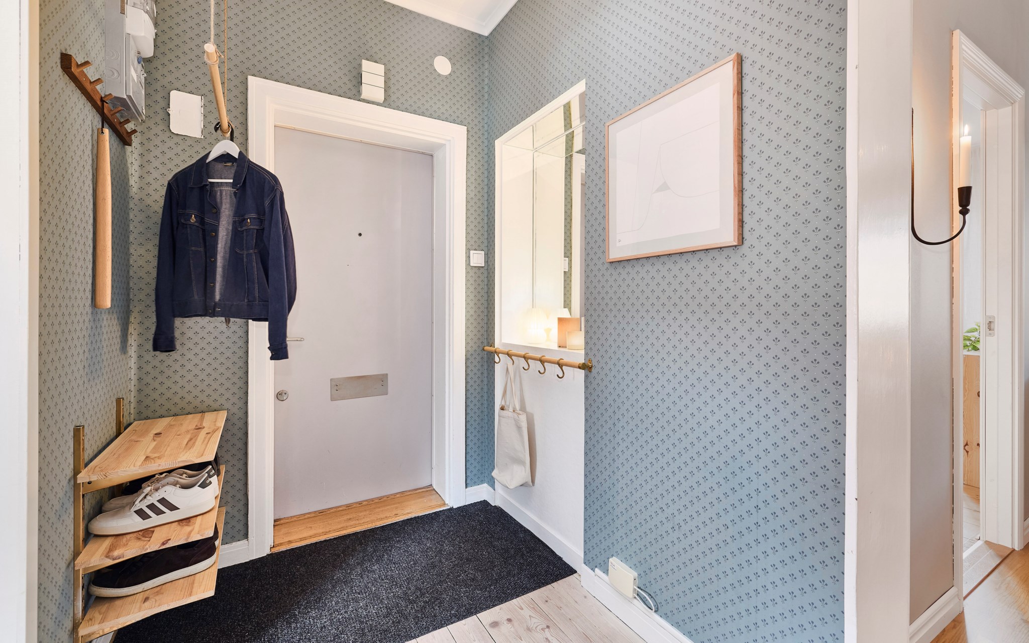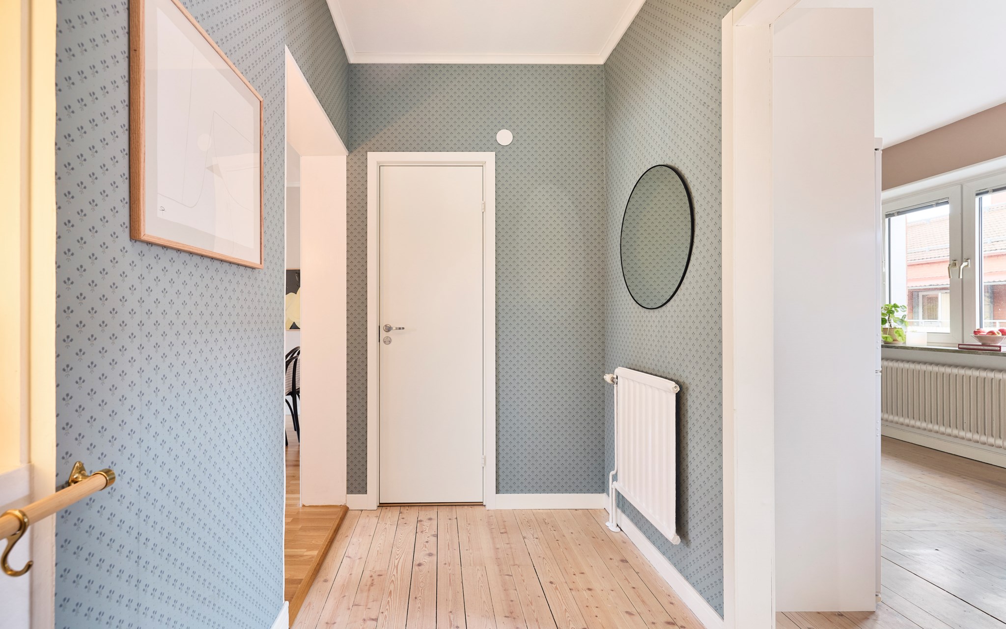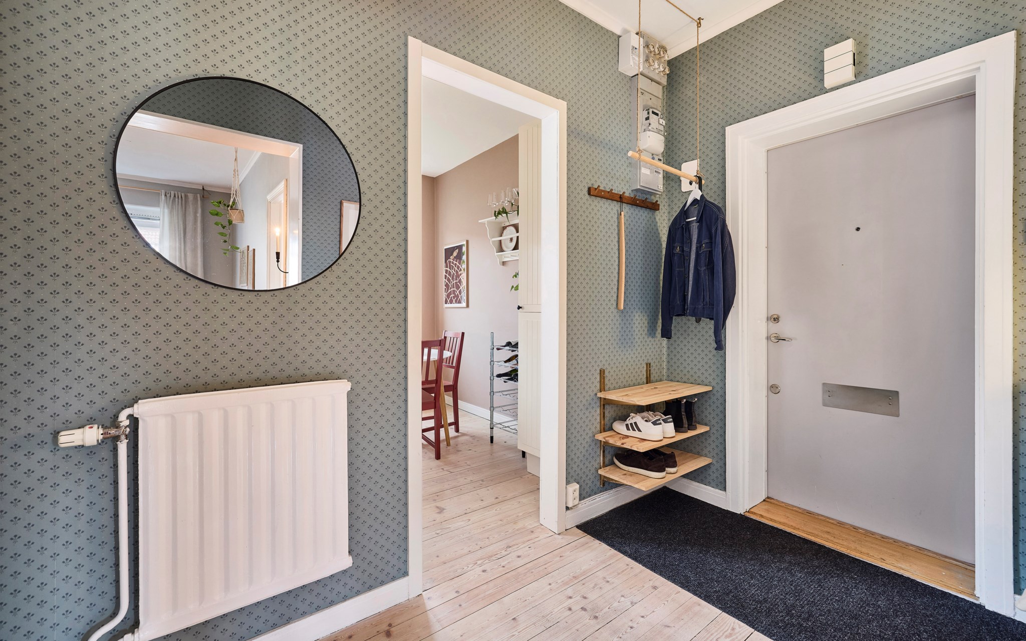 Välkommen in! Här kan du gärna ta av både skor och strumpor, gamla trägolv som det här är ju så skönt att gå barfota på. Från början fanns en ingång till sovrummet direkt till vänster, men den är flyttad och den lilla smatten har blivit en bra lägga-nycklarna-hylla när du kommer hem och en sista-koll-på-frisyren-spegel innan du sticker ut igen.