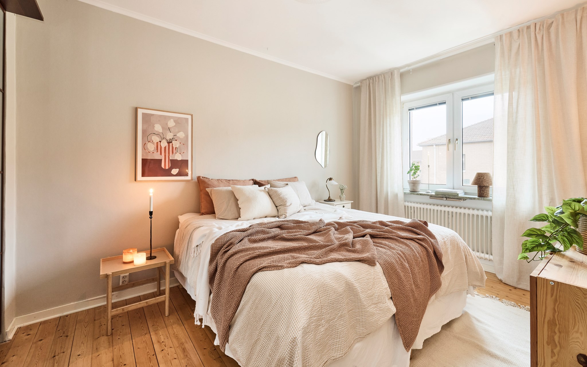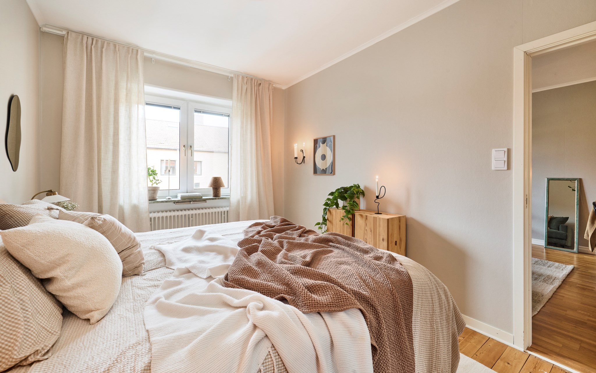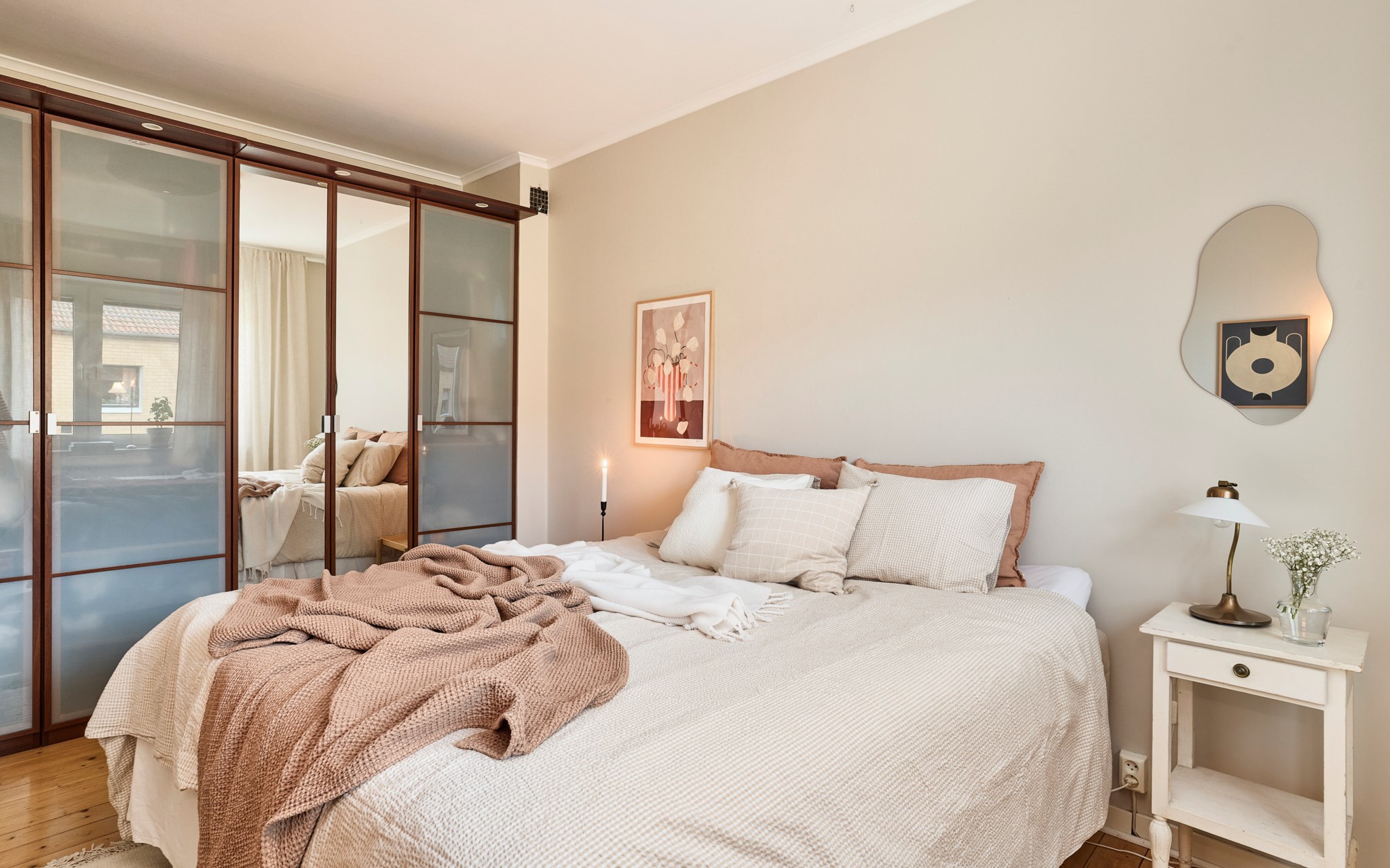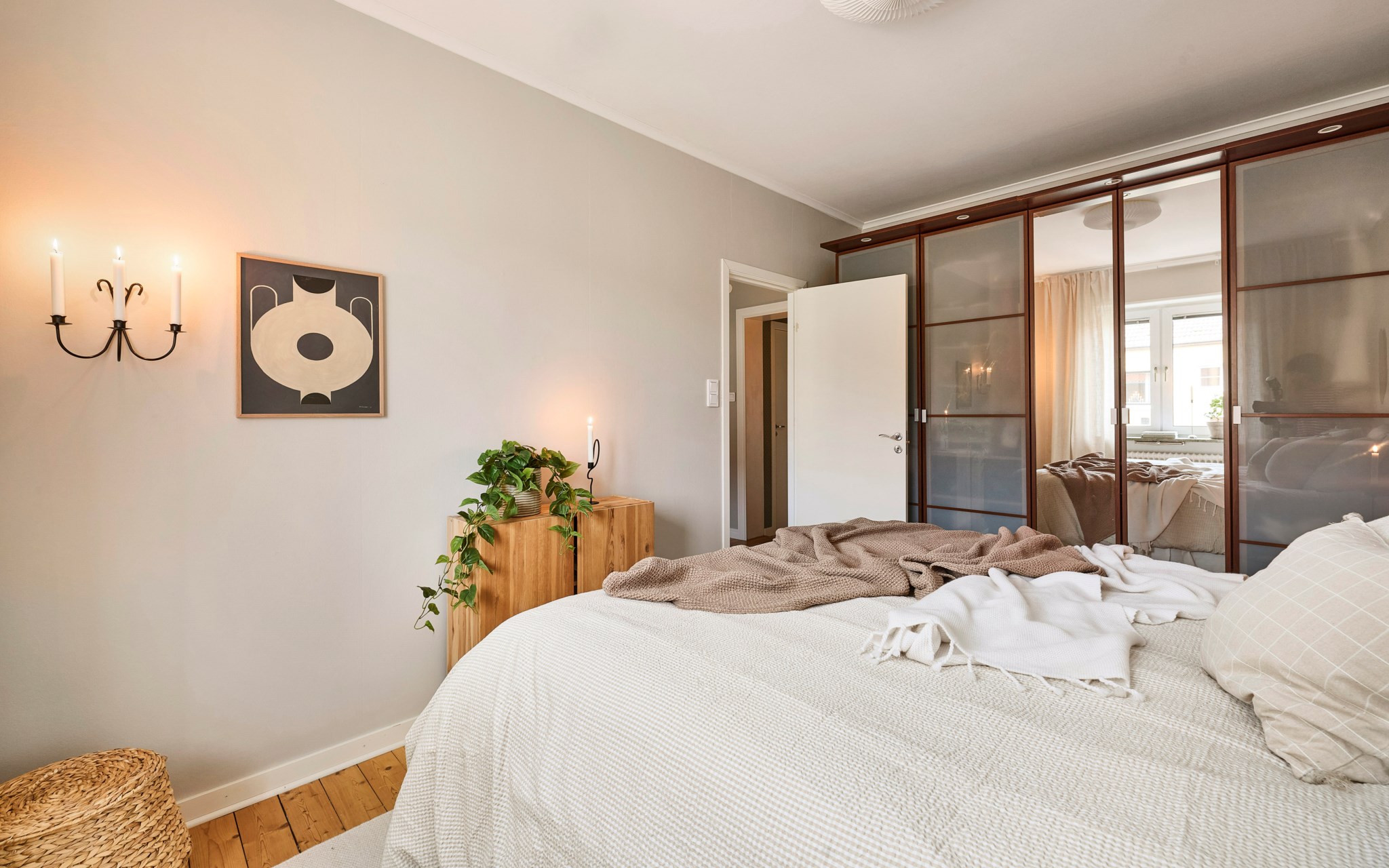 Sovrummet har bra storlek med gott om plats för en dubbelsäng och några mindre möbler. Klädförvaringen är redan fixad, med en rad höga garderober längs hela ena väggen. Får du inte plats med dina kläder här är det kanske dags att börja rensa lite.