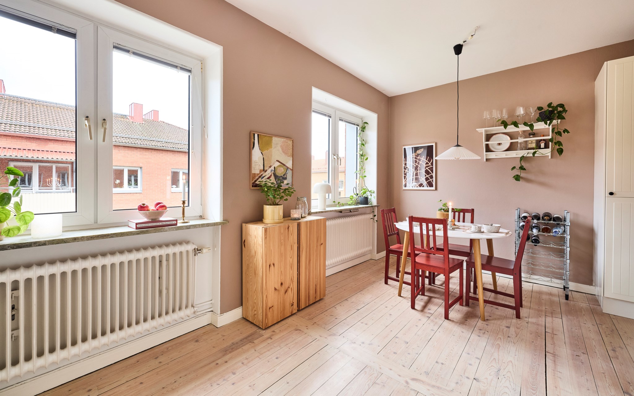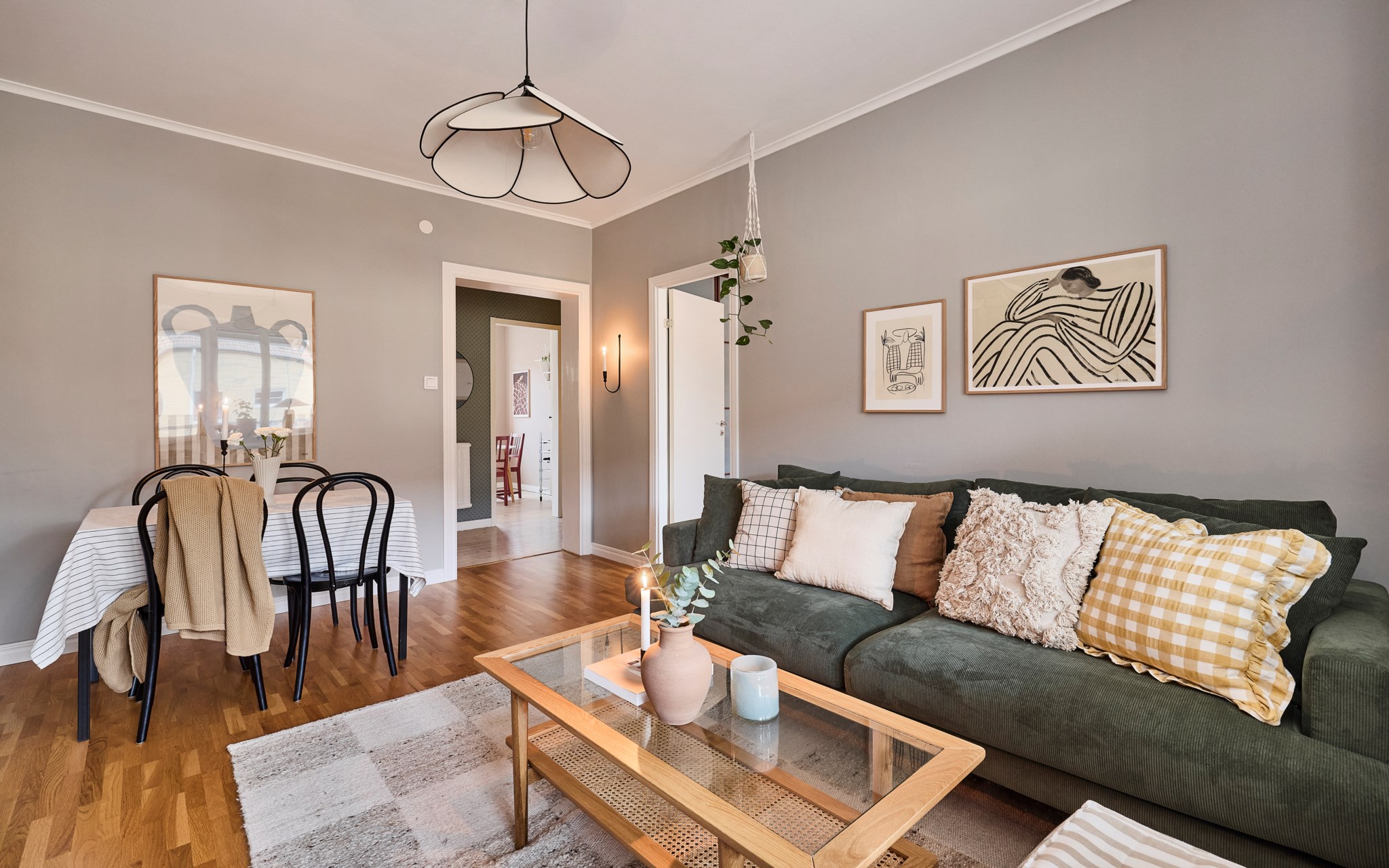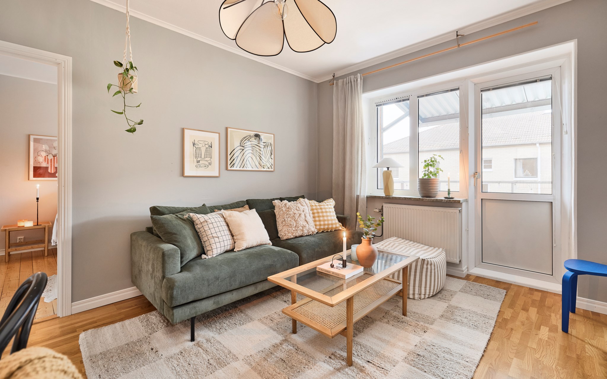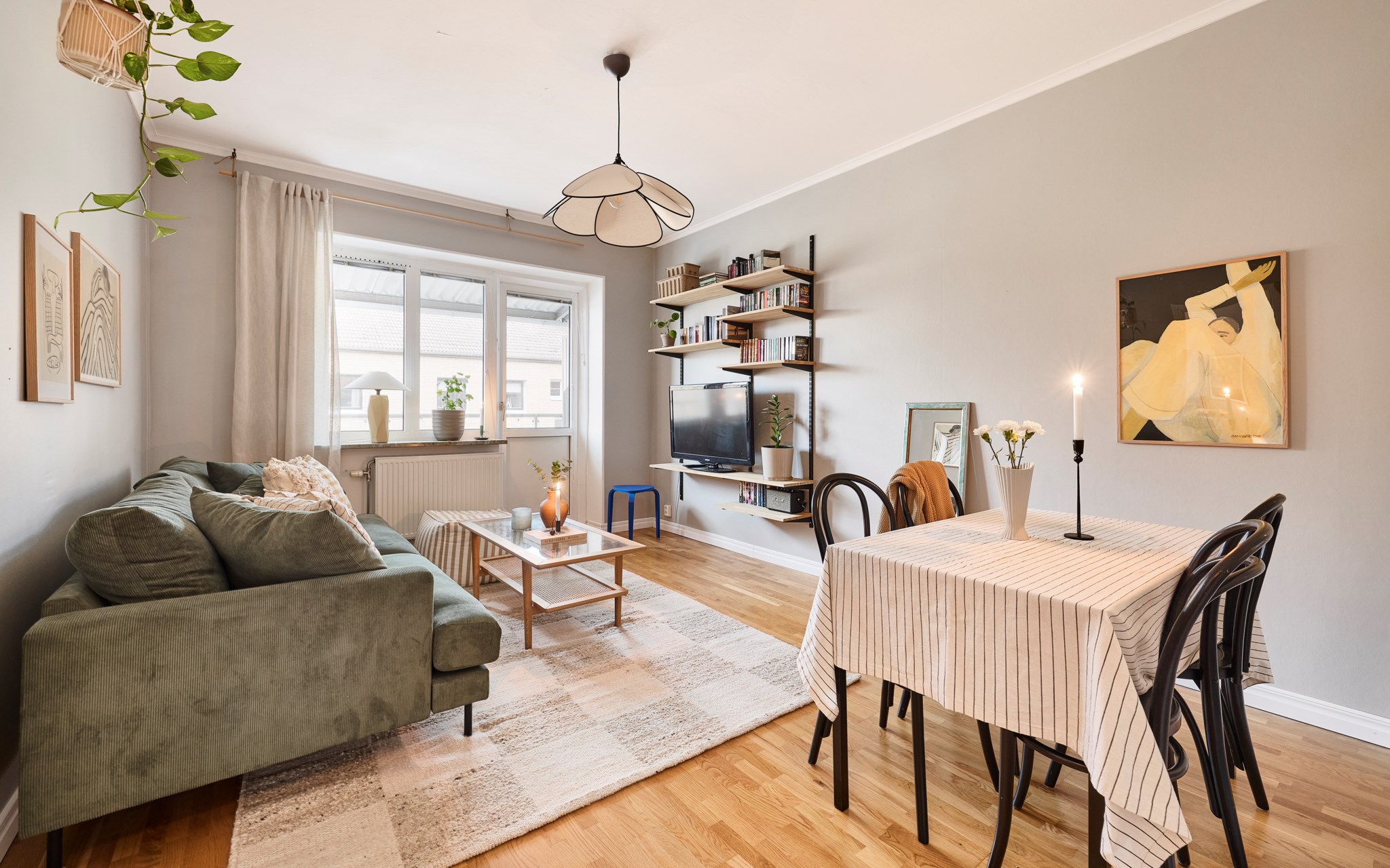 Vardagsrummet ligger mot väster och är svalt och skönt hela dagen. Först framemot sen eftermiddag kan solen kika in genom fönstret, kan hända att dörren till balkongen står öppen då också. Det är mysigt. Själva formen på rummet gör att det är lätt att möblera på olika sätt.