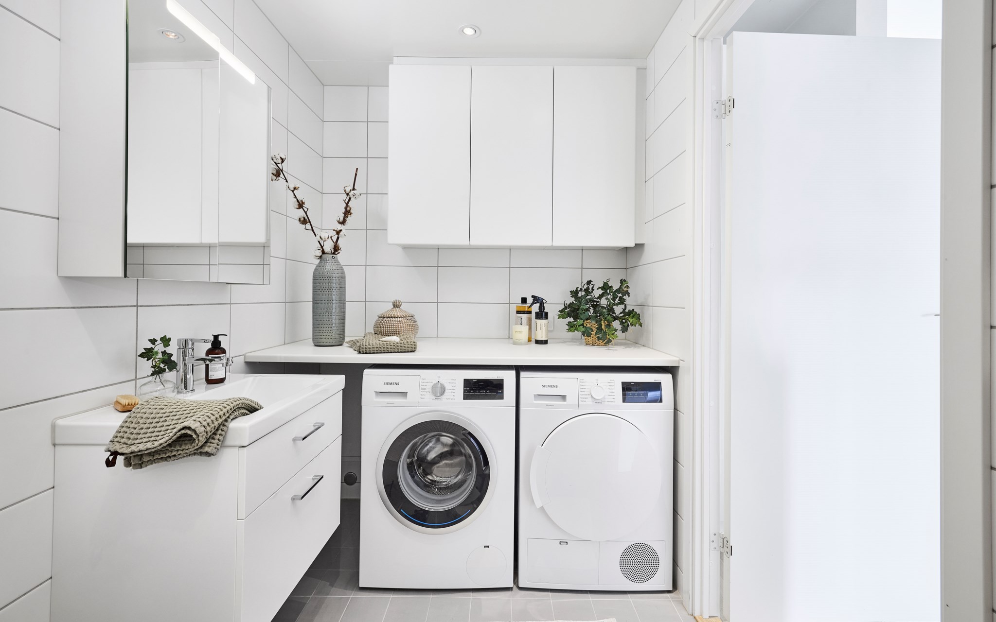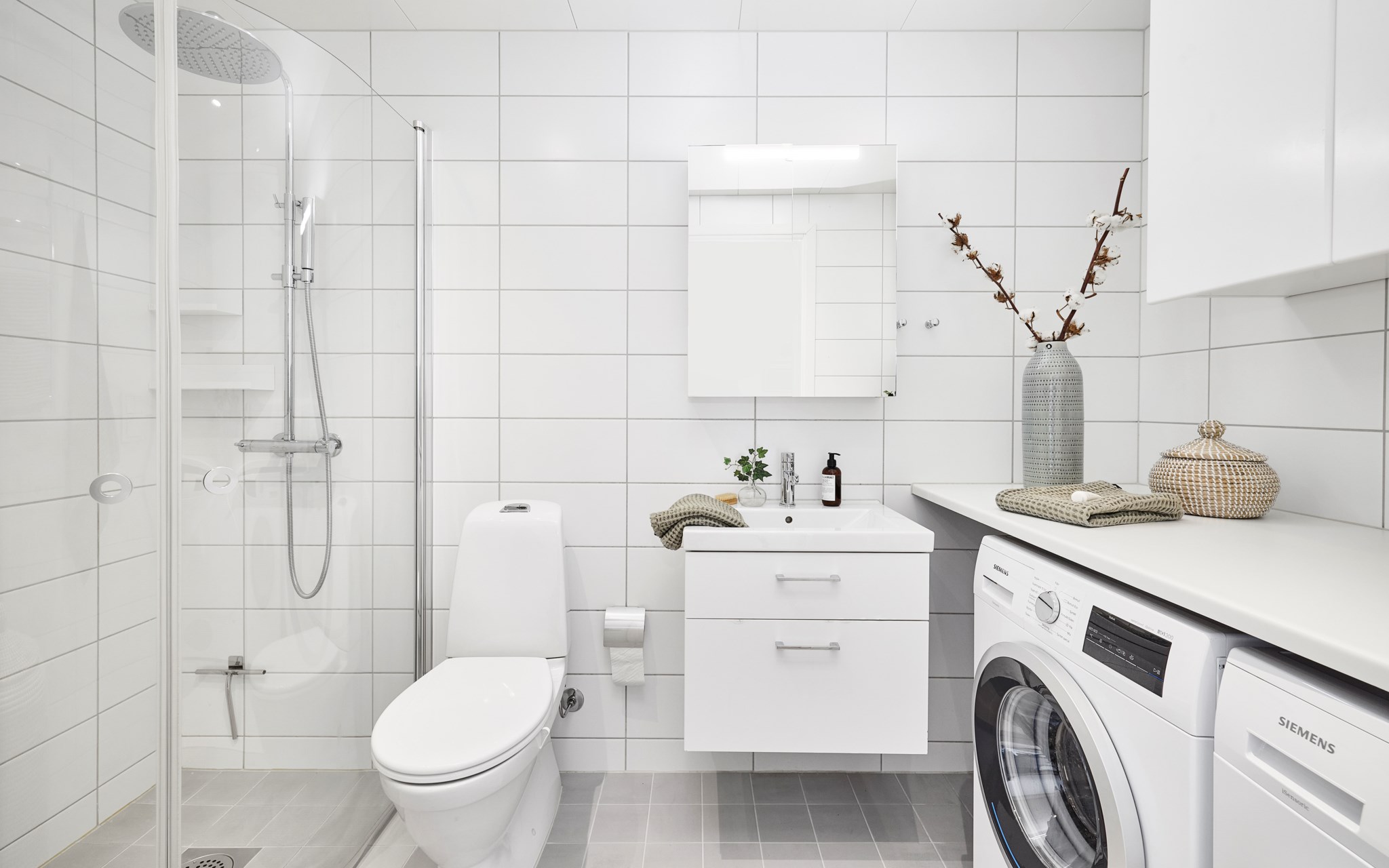Tvättmaskin och torktumlare som står i badrummet installerades 2019 och kommer från Bosch. I badrummet värms fötterna genom den vattenburna golvvärmen.