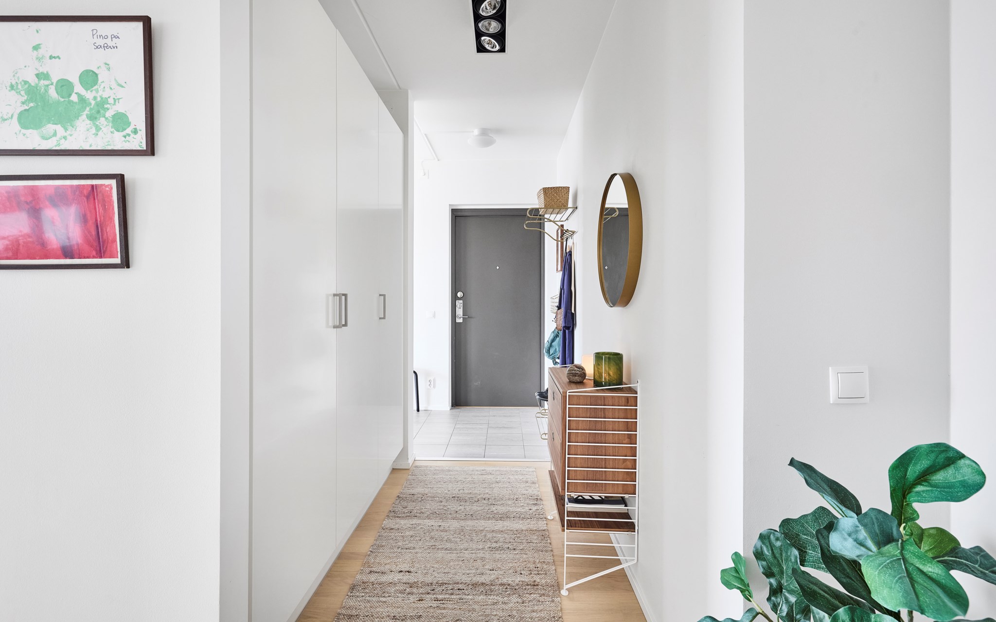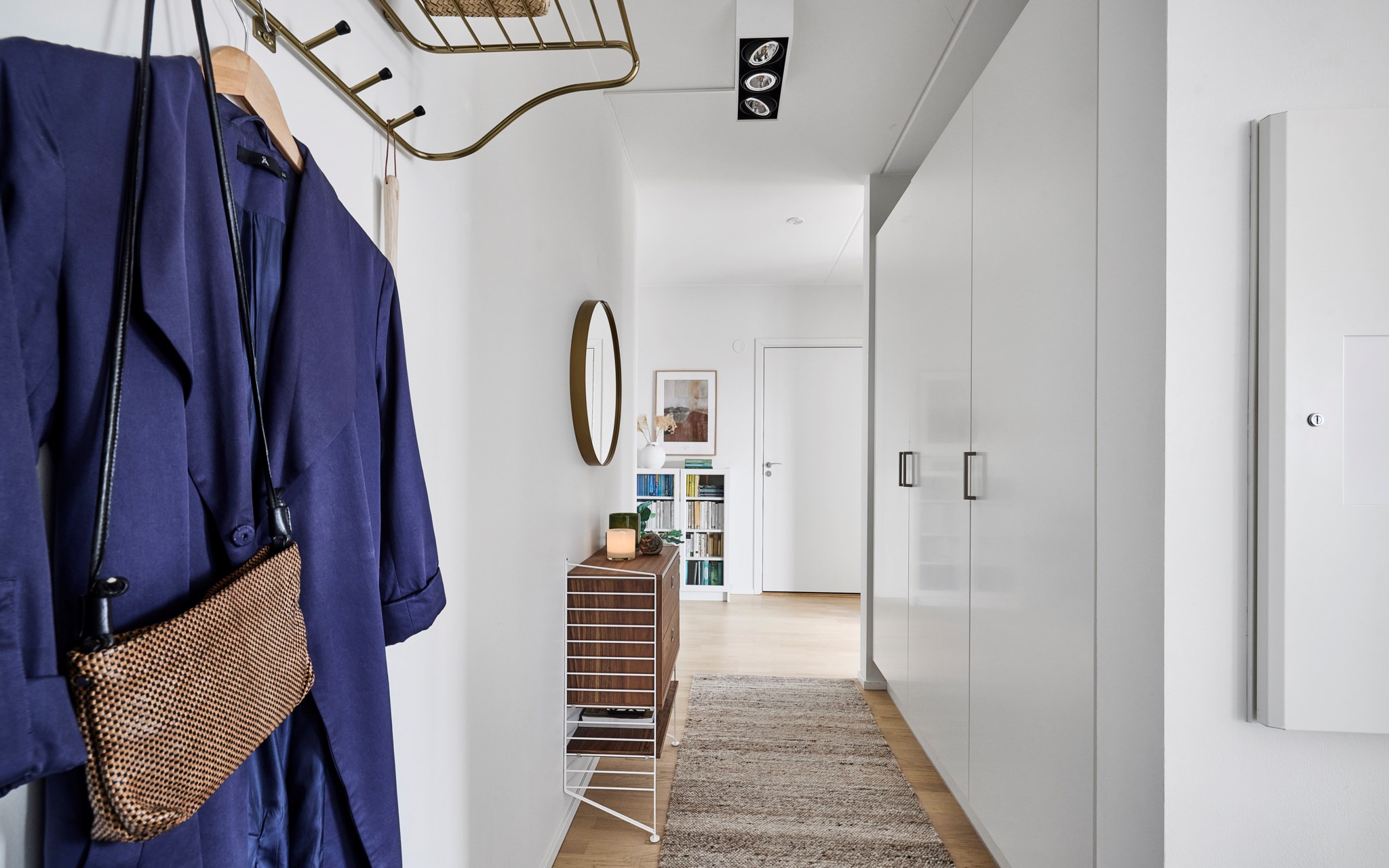 Fördelarna med att bo i ett nybyggt hus är många, och här hamnar hissen högt upp på listan. Du dig snabbt upp till sjätte våningen och två steg från ditt eget paradis. Entrén är optimalt planerad och rymmer massor av smart förvaring bakom garderobsdörrarna. Här har du städskåp och klädförvaring på längden och höjden. Ordning och reda!