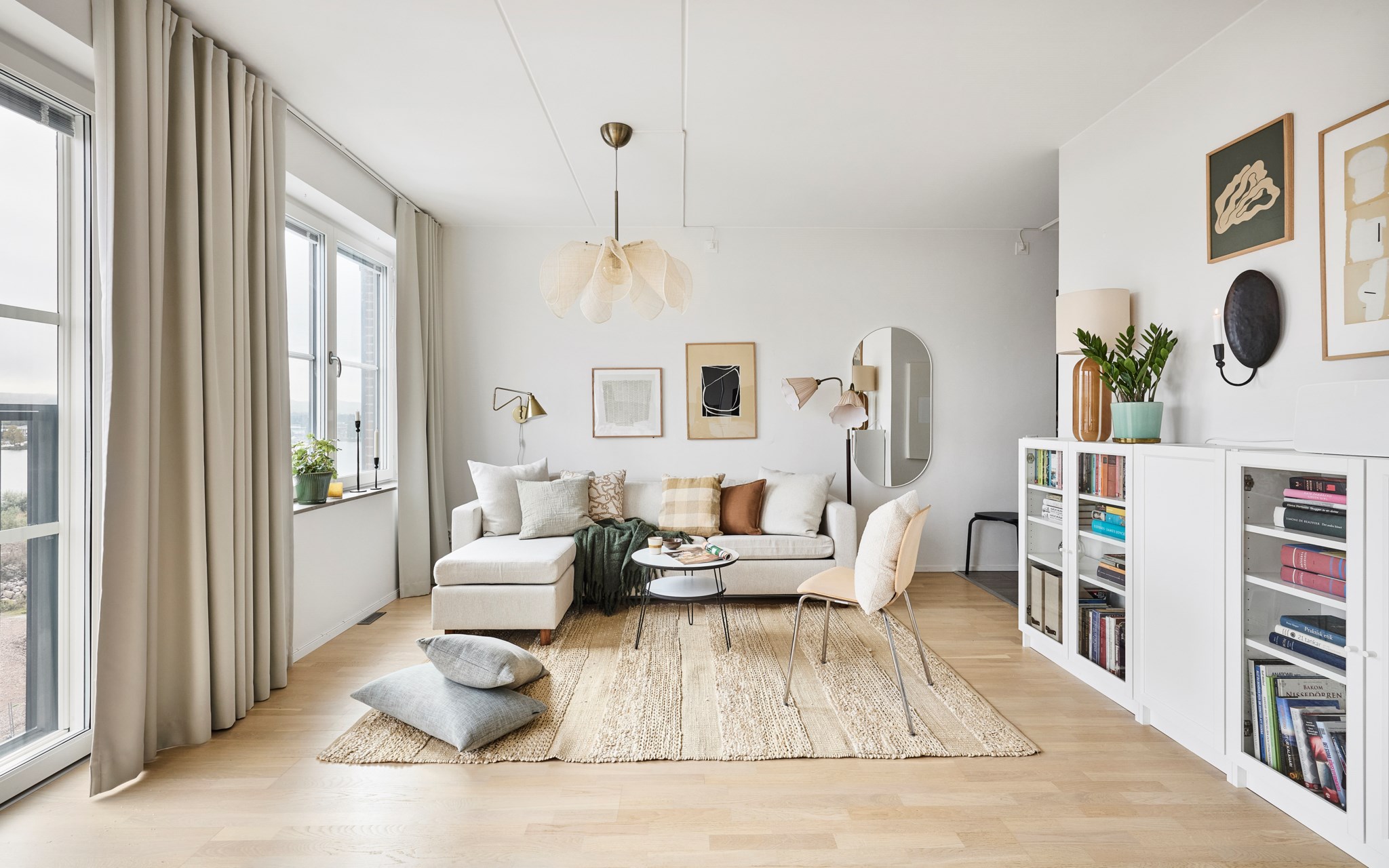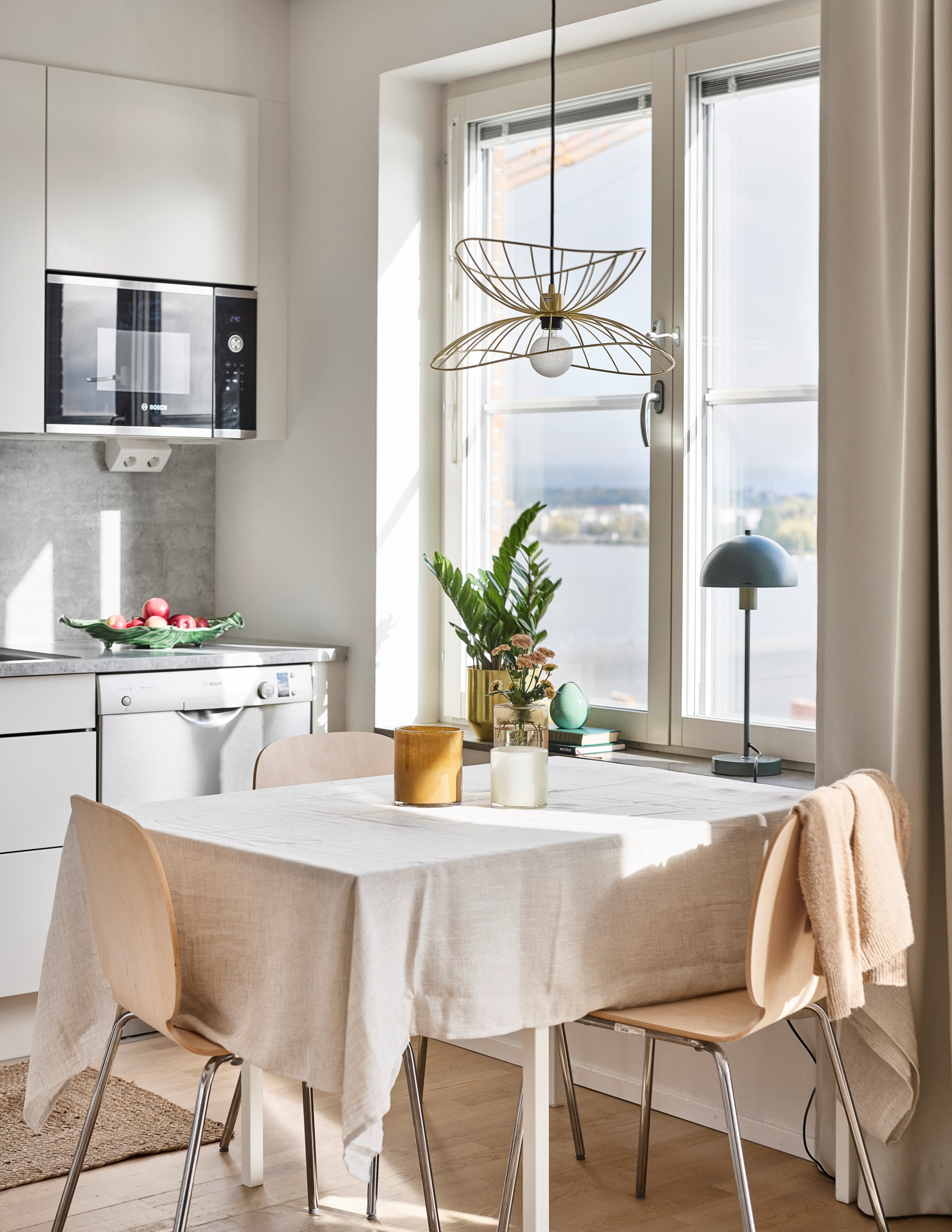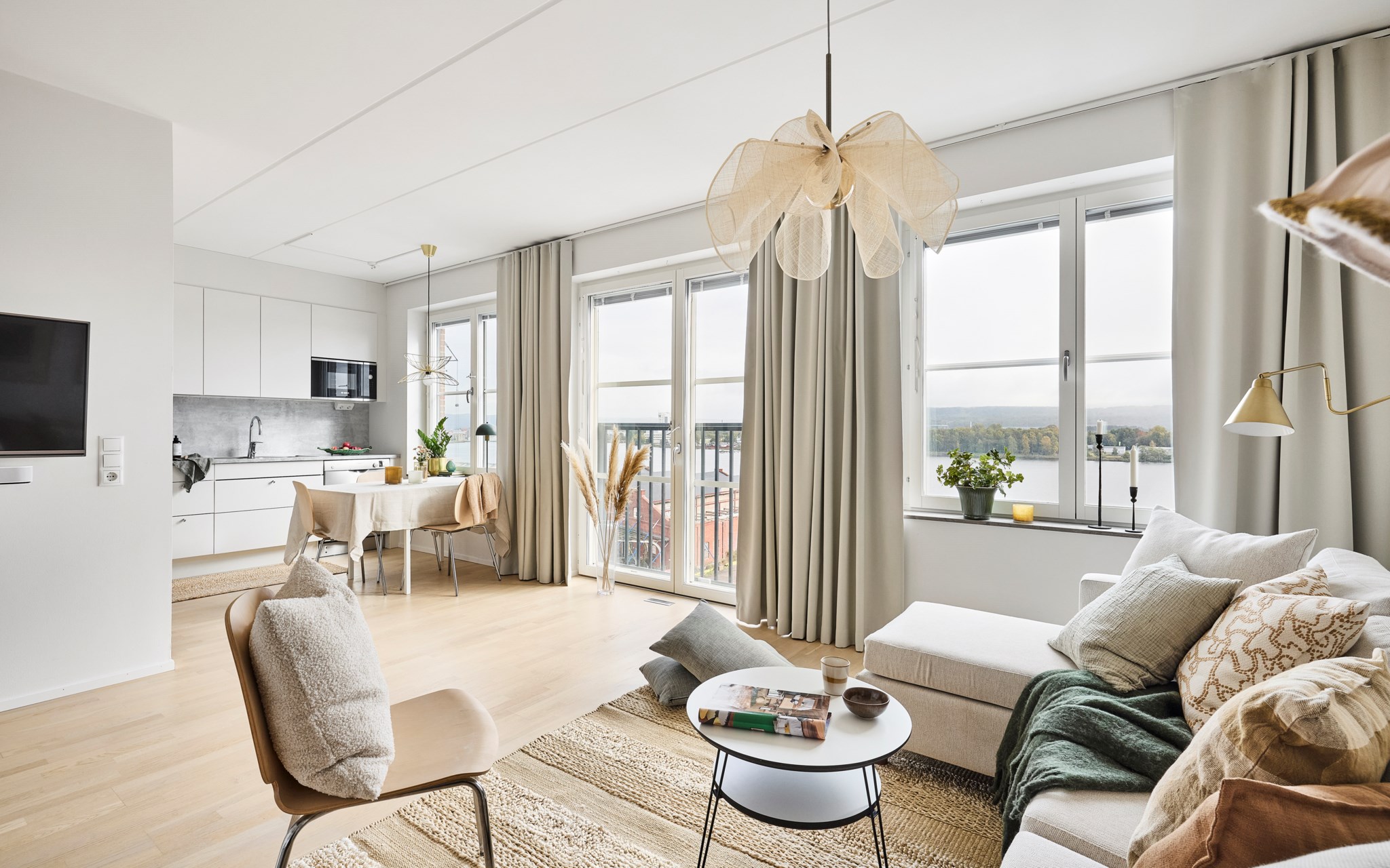 Här är det fritt fram mellan vardagsrum och kök. De stora fönstren och de dubbla – extra breda – dörrarna till den franska balkongen gör det underbart komplicerat att avgöra vad som egentligen är ute och inne. Utanför pågår vardagen, med människor på väg runt Munksjön och till eller från stan. Liv och rörelse, fast på precis lagom avstånd. Nedanför kommer ett torg och en park byggas framöver – och livskvaliteten kommer tillta ytterligare, gissar vi.