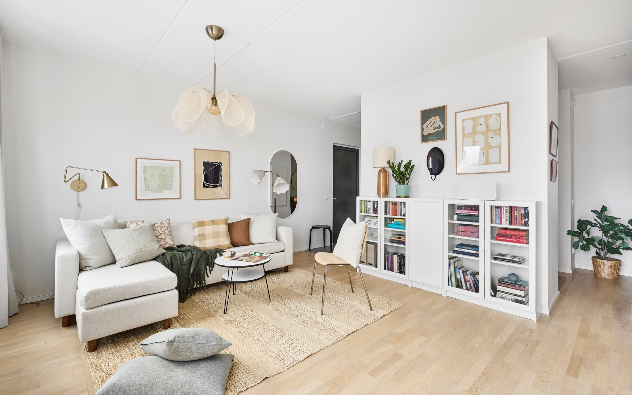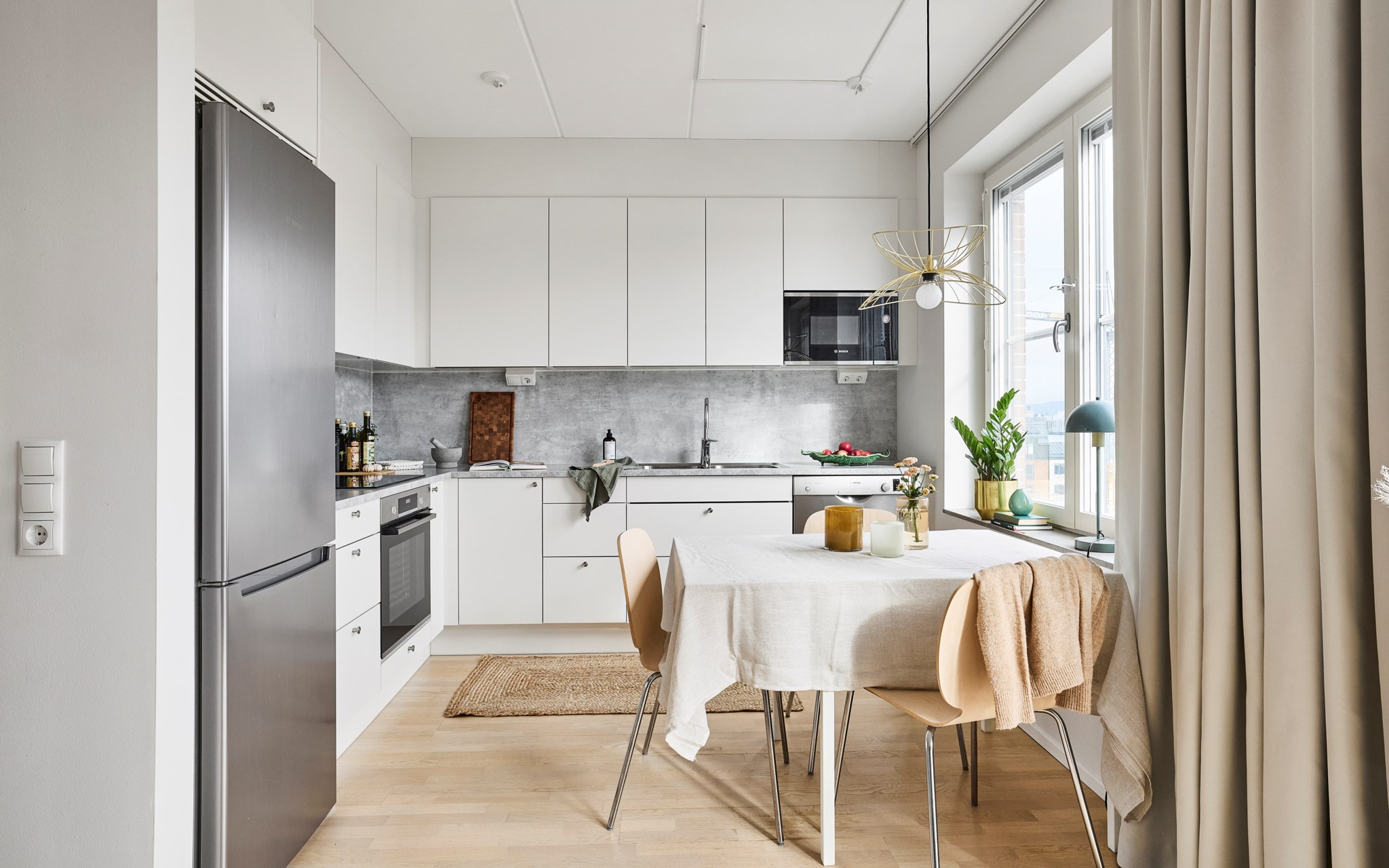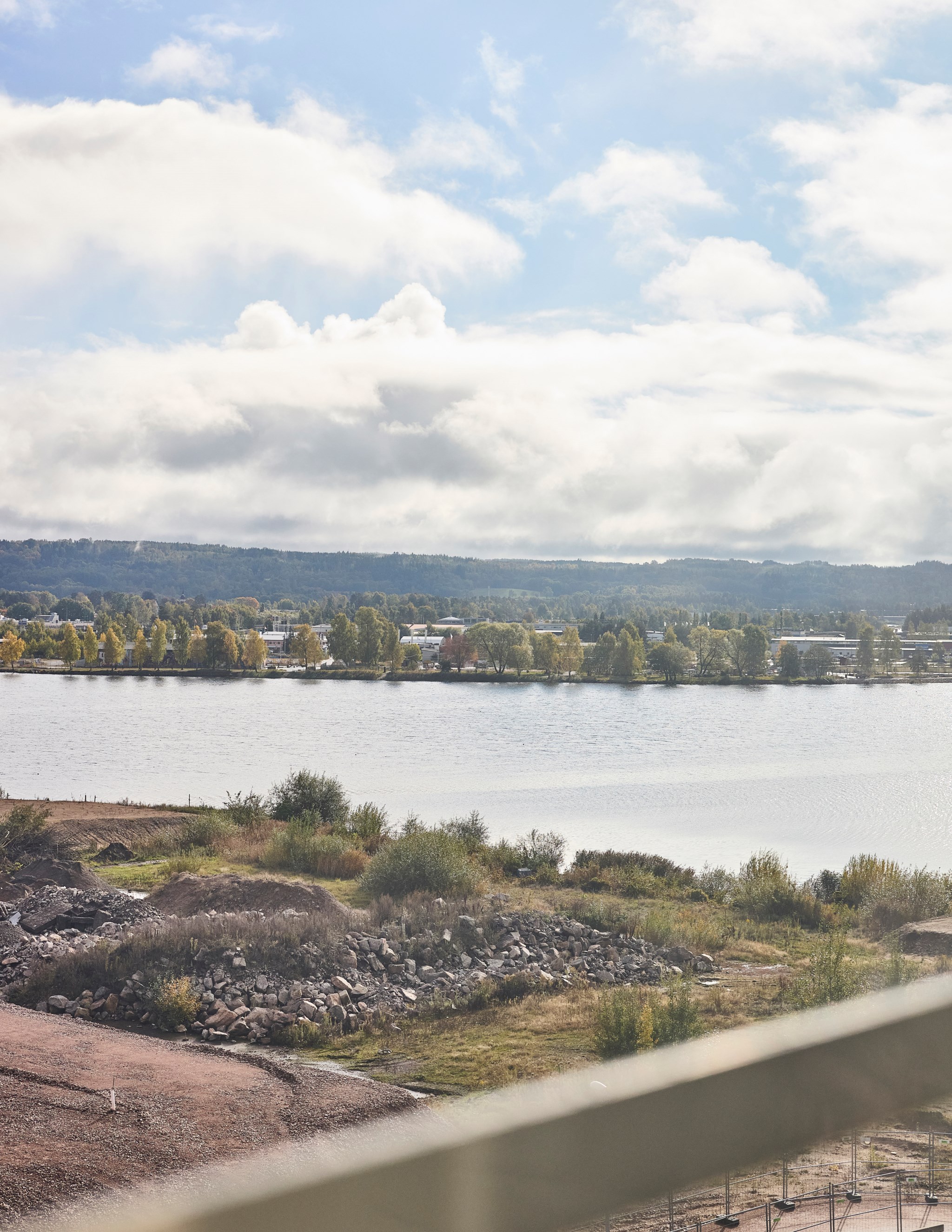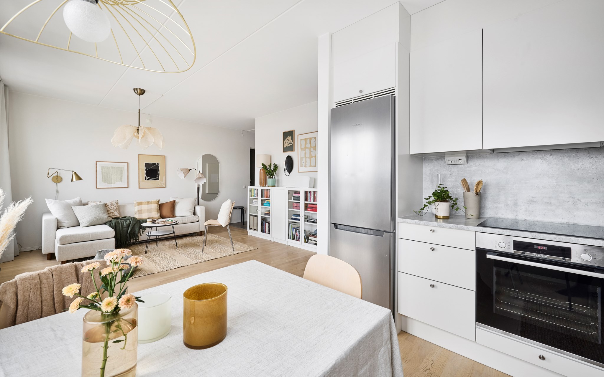 Här är det fritt fram mellan vardagsrum och kök. De stora fönstren och de dubbla – extra breda – dörrarna till den franska balkongen gör det underbart komplicerat att avgöra vad som egentligen är ute och inne. Utanför pågår vardagen, med människor på väg runt Munksjön och till eller från stan. Liv och rörelse, fast på precis lagom avstånd. Nedanför kommer ett torg och en park byggas framöver – och livskvaliteten kommer tillta ytterligare, gissar vi.