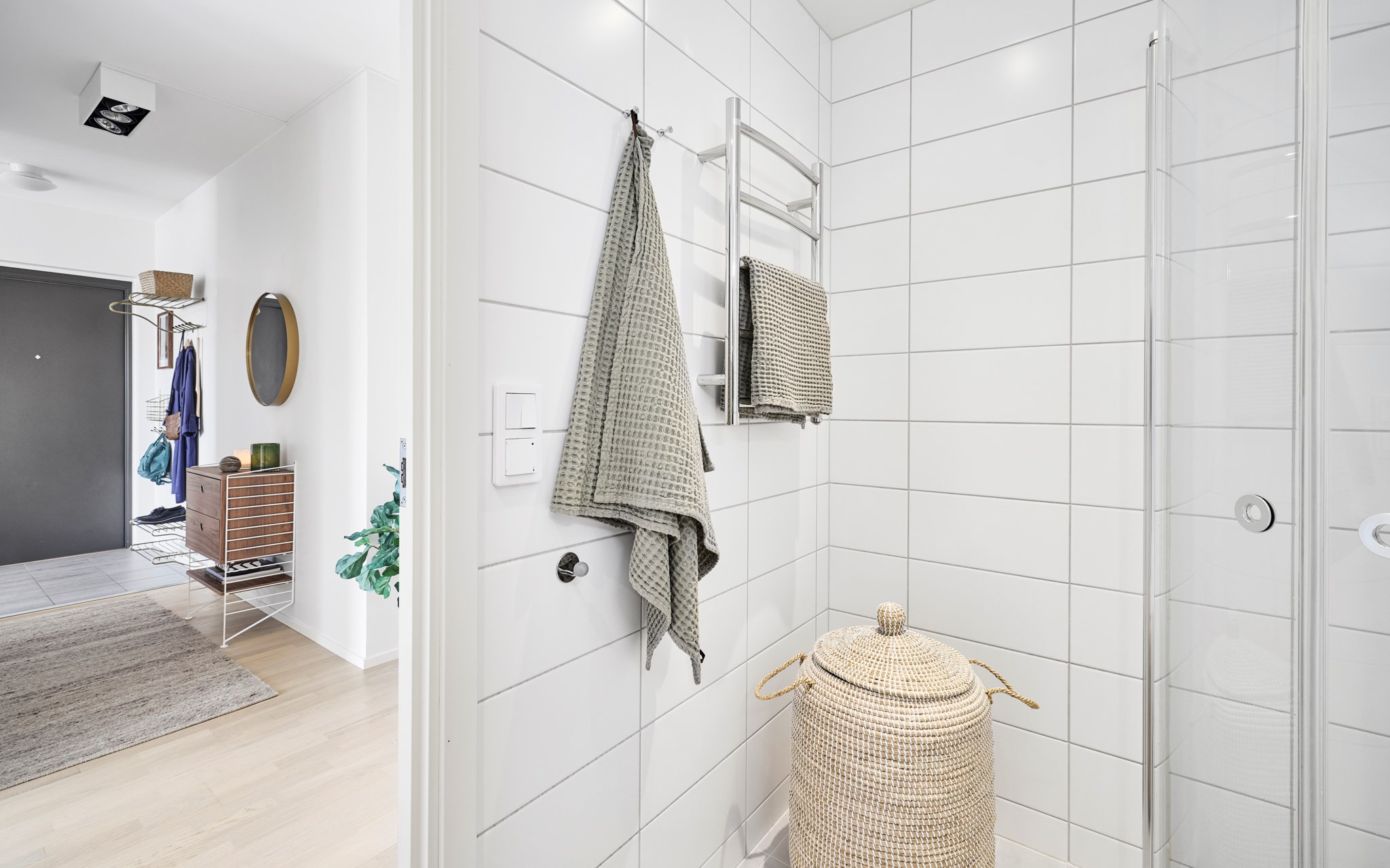 Ljust, fräscht, nytt och stilrent. Här finns egentligen inte så mycket att säga mer än att material- och färgval är sobra och av hög kvalitet – och att tvättmaskin och torktumlare jobbar på med sitt. Förvaringen gör vardagen smidigare, och golvvärmen och handdukstorken gör livet lite vardagslyxigare.