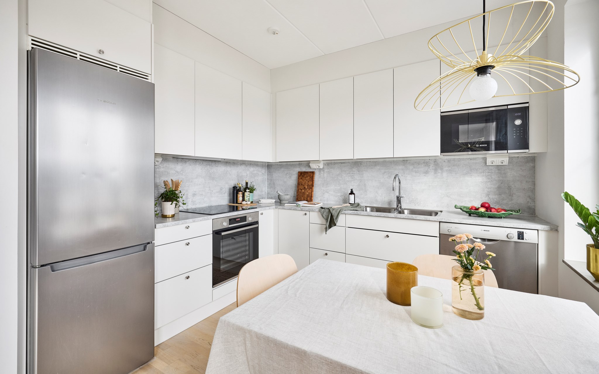 Köket kommer från HTH och är utrustat med följande vitvaror; induktionshäll, ugn, mikrovågsugn, fläkt, diskmaskin, kyl och frys. Samtliga vitvaror med undantag för fläkten (Swega) kommer från Bosch och installerades 2019.