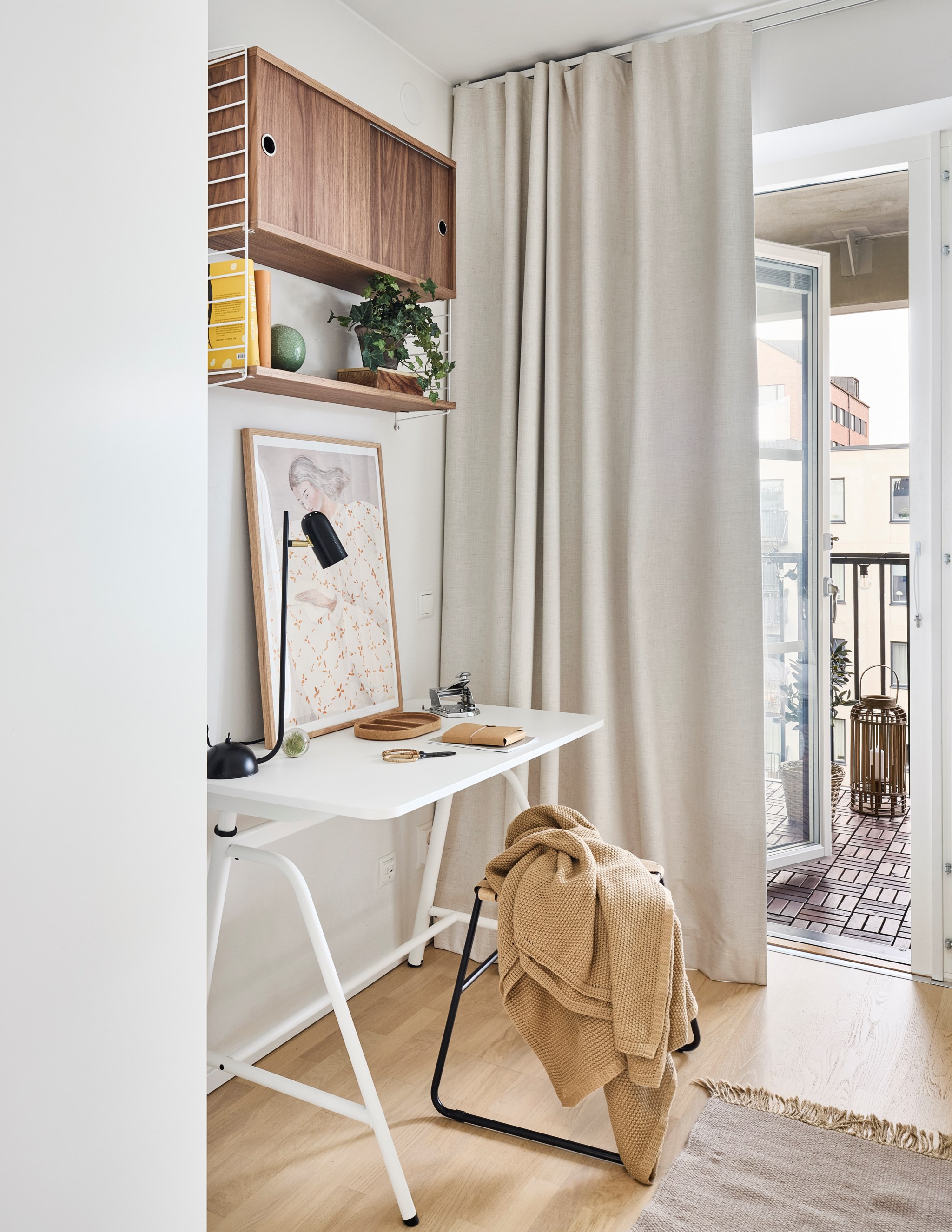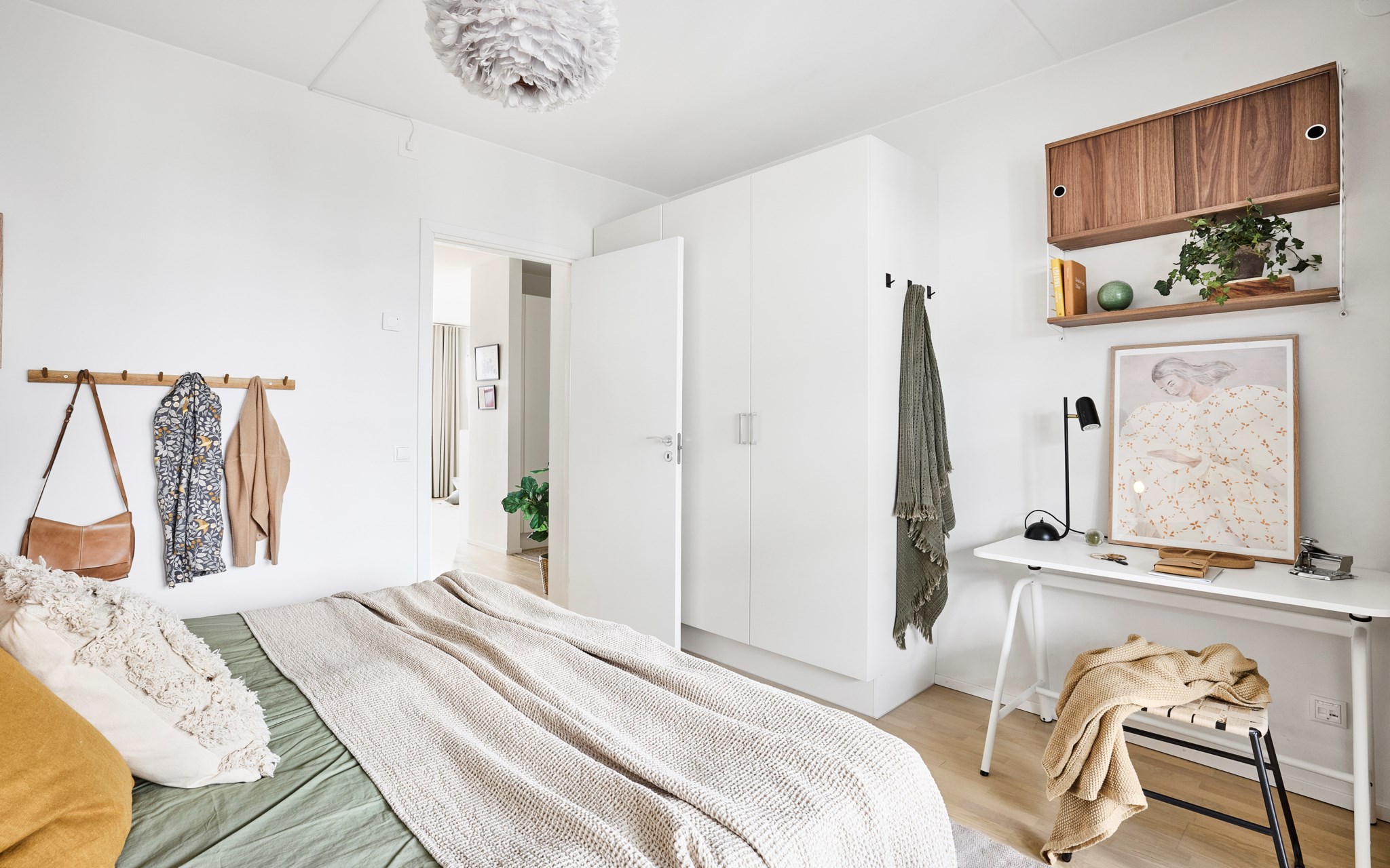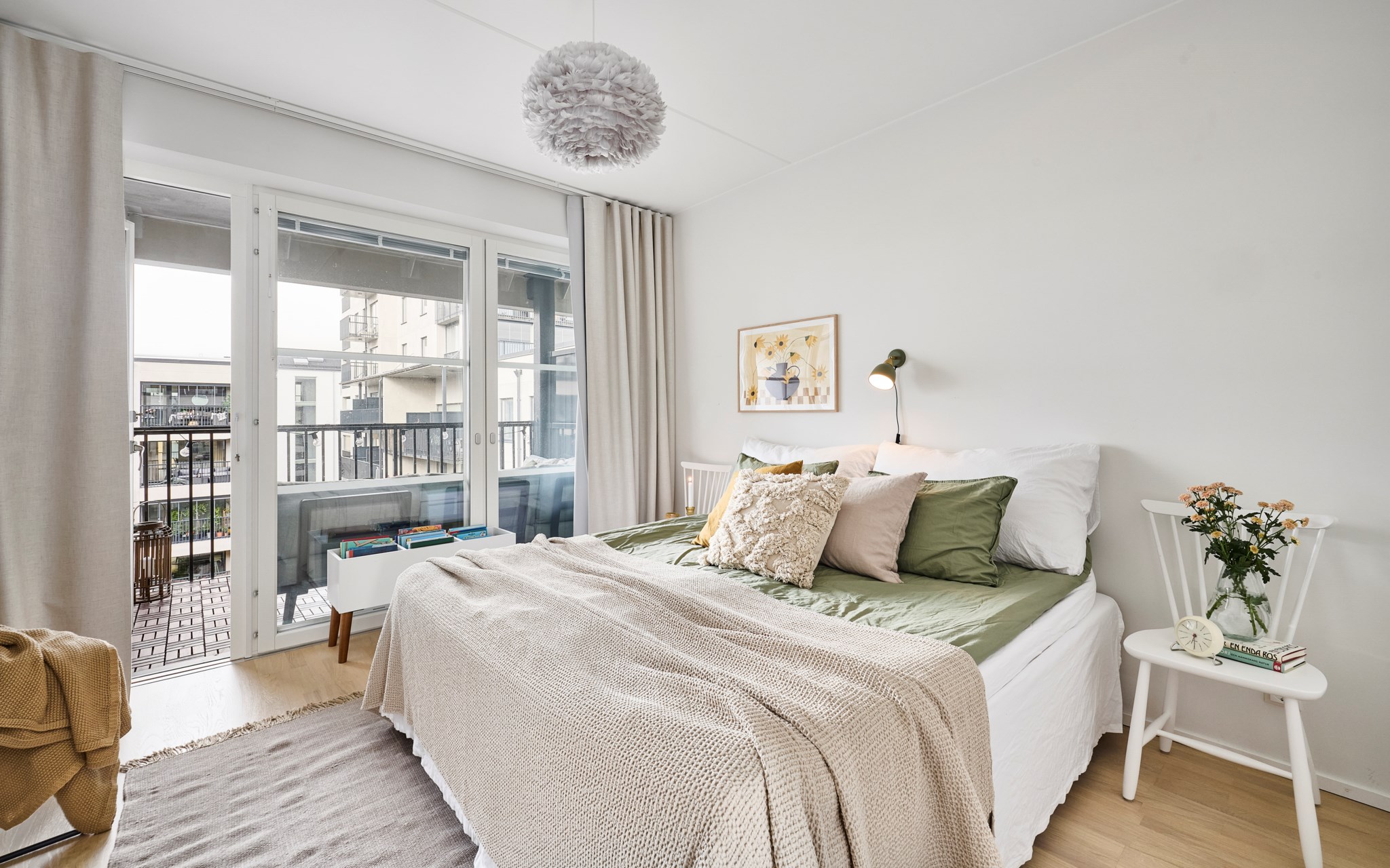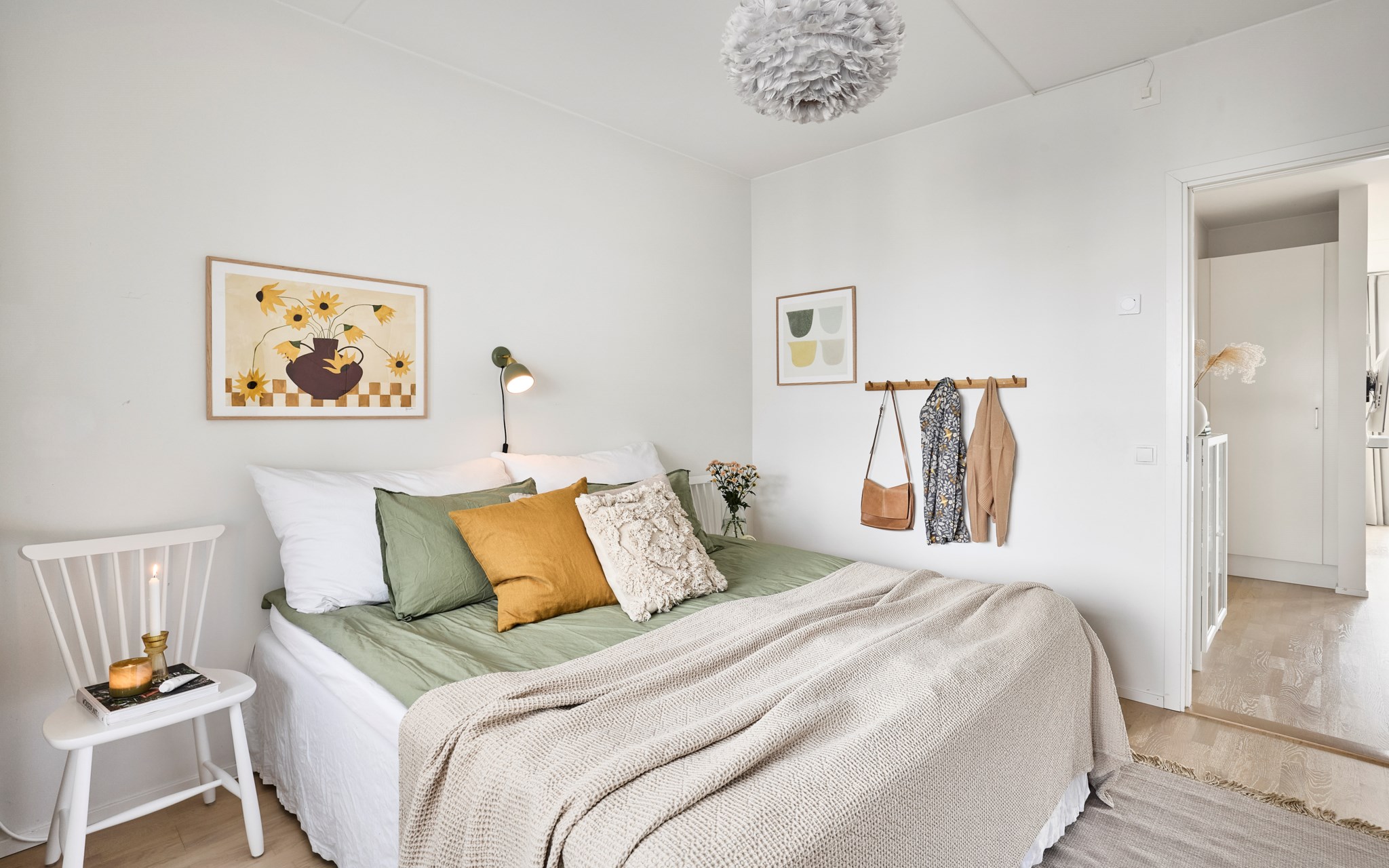 Ljust och luftigt, och inte omöjligt att låta balkongdörren stå öppen hela natten: stadens ljud når knappast hit. Dagtid finns det plats för ett litet hemmakontor eller läshörna och om du är morgontrött kan du sova gott utan att bli väckt av solen. Kvällen blir lång, med varma solnedgångar och innergårdens lugn utanför.