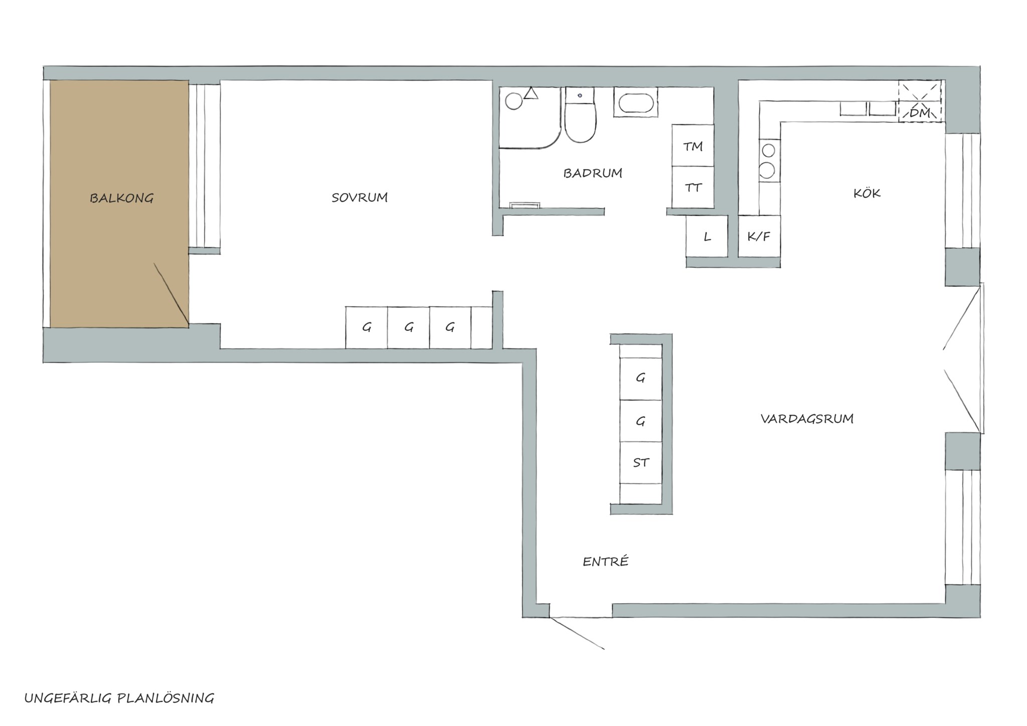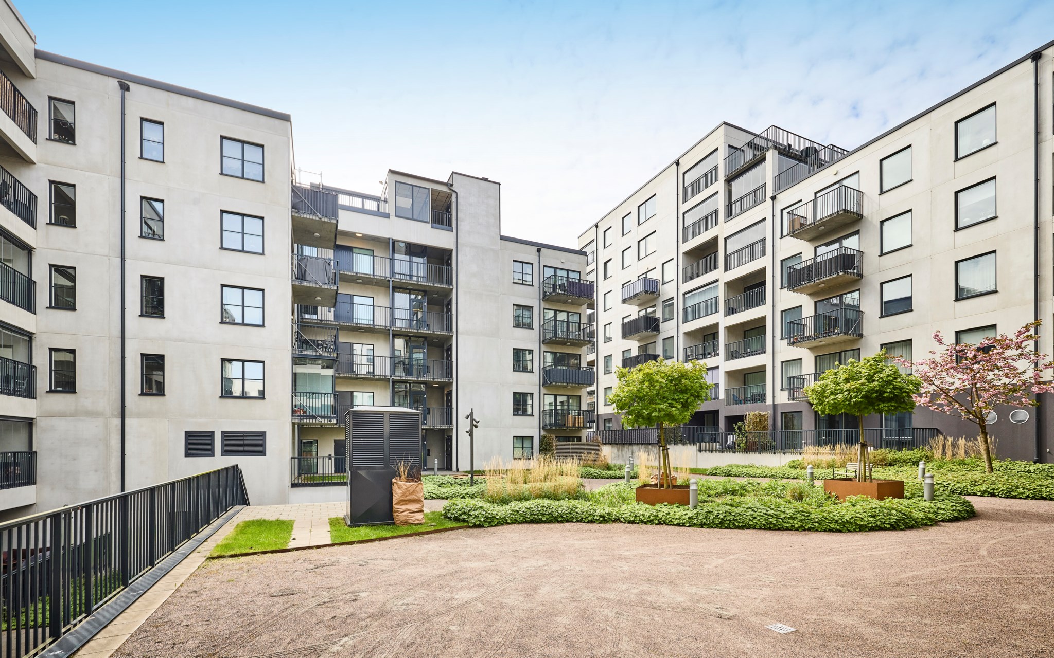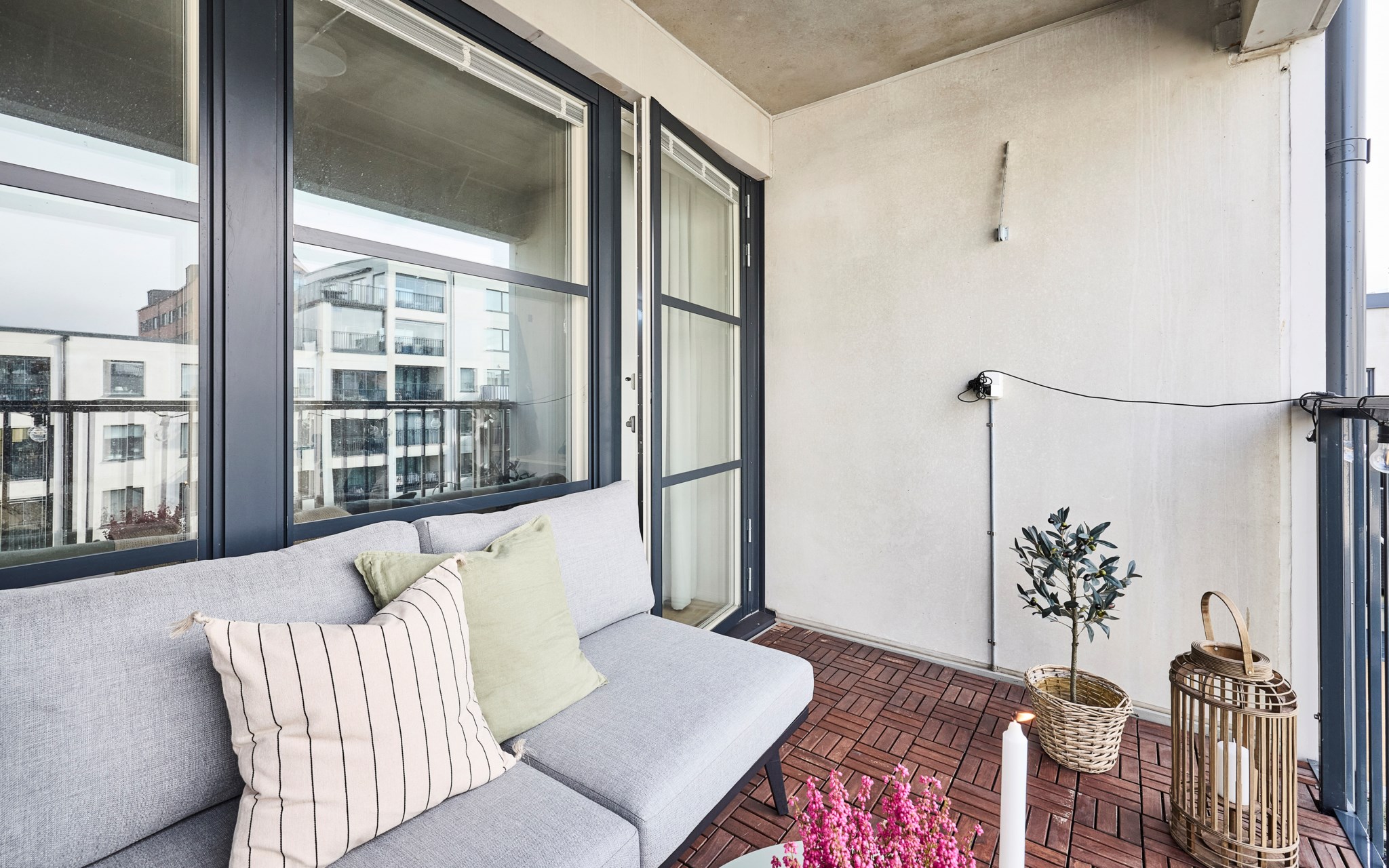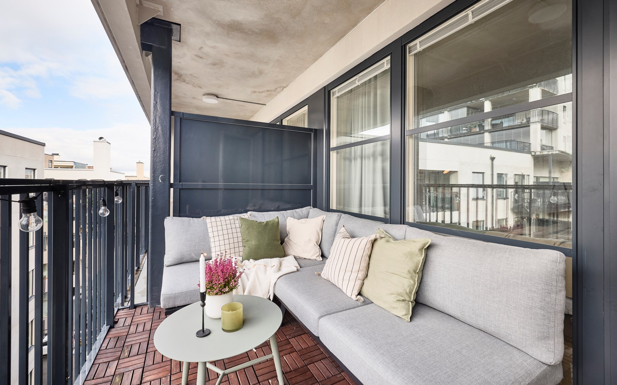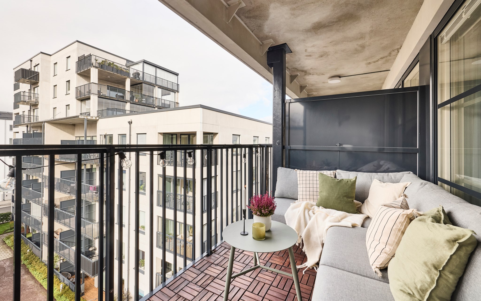 Rakt mot väster och direkt ut från sovrummet hittar du balkongen. Rejält tilltagen, med gott om plats för odling och möblemang. Ja, du väljer själv hur du vill inreda denna del av luftrummet. Men mysigt blir det hur du än gör, den gemensamma gården ger en hemtam stämning och grannarnas många ljusslingor bidrar också.
