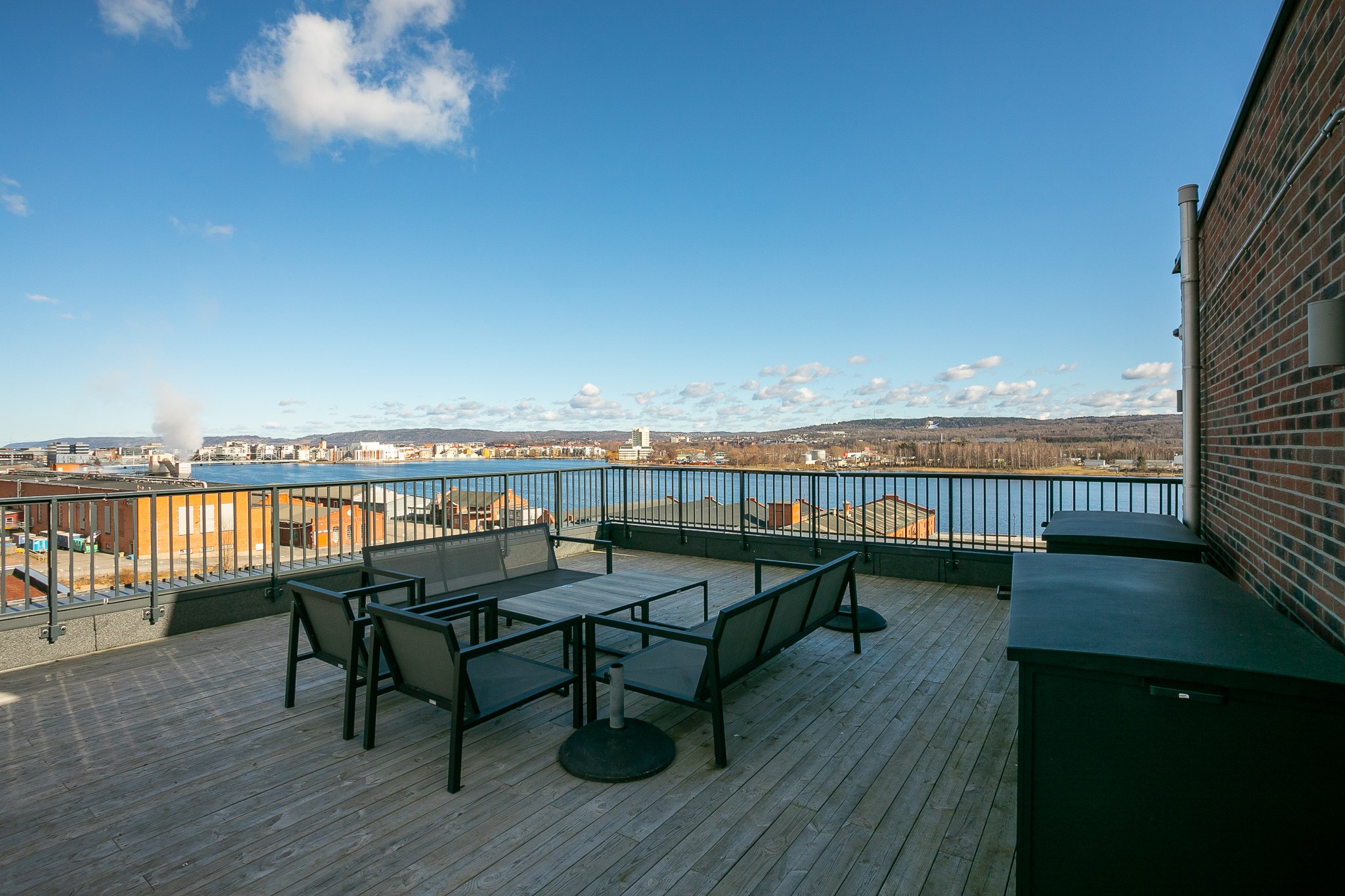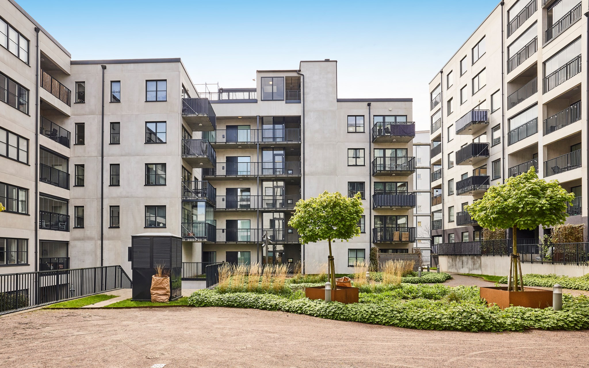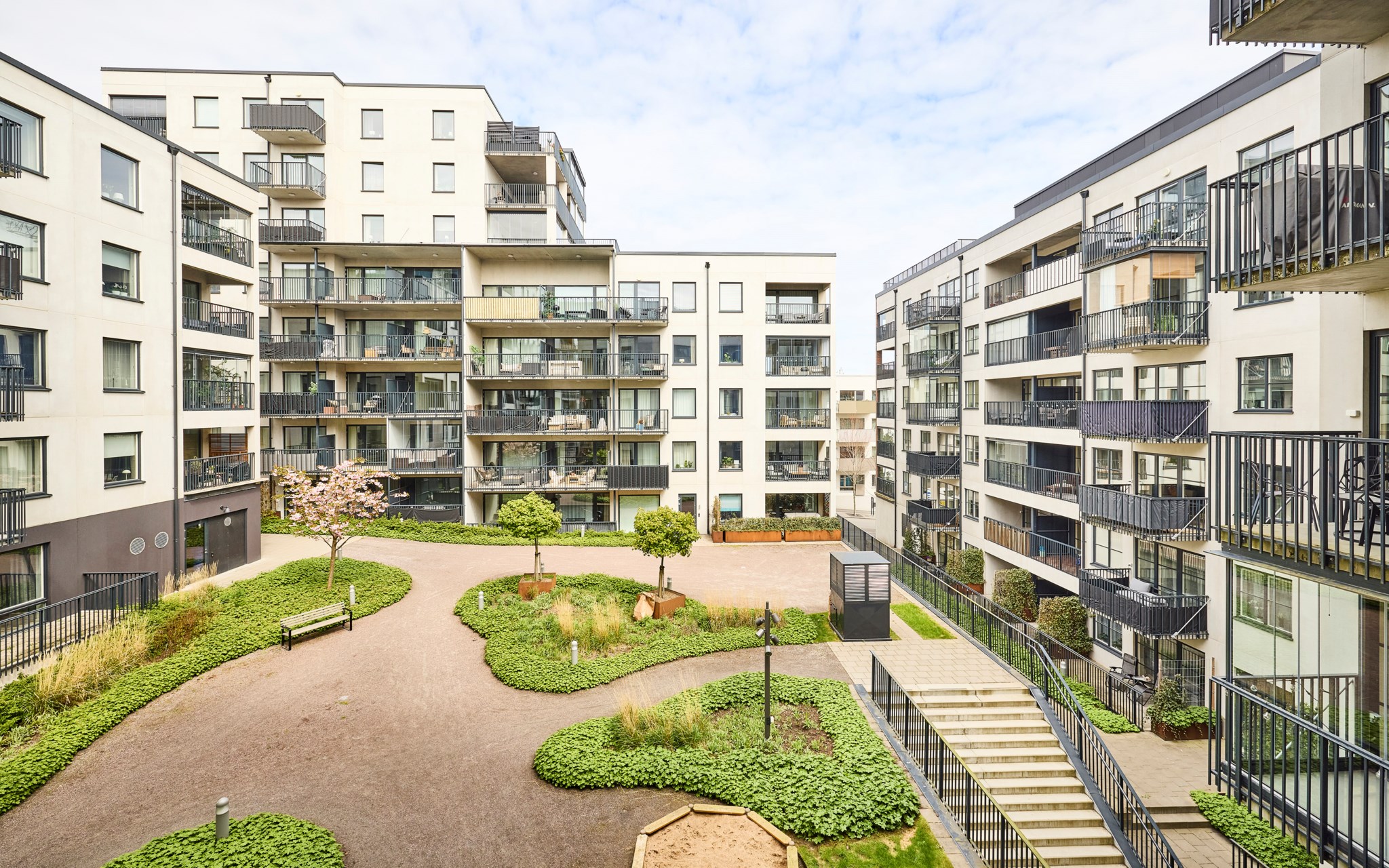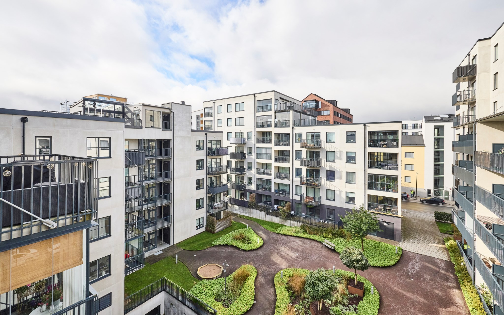 Från balkongen med utsikt kan solen avnjutas till efter lunchtid. Eftermiddags- och kvällssolen njuter du bäst av från balkongen mot innergården. Den gemensamma takterrassen, en våning upp erbjuder sol hela dagen.