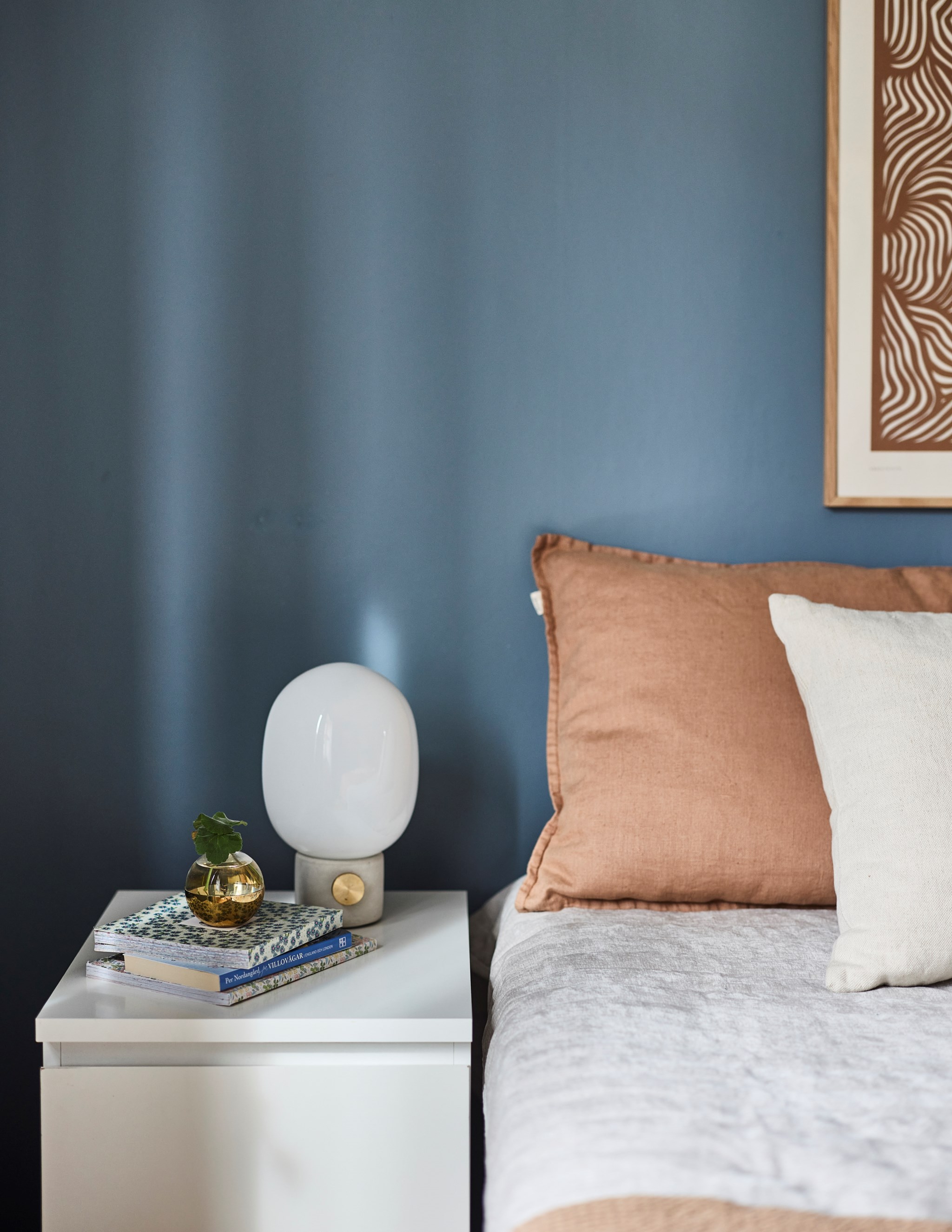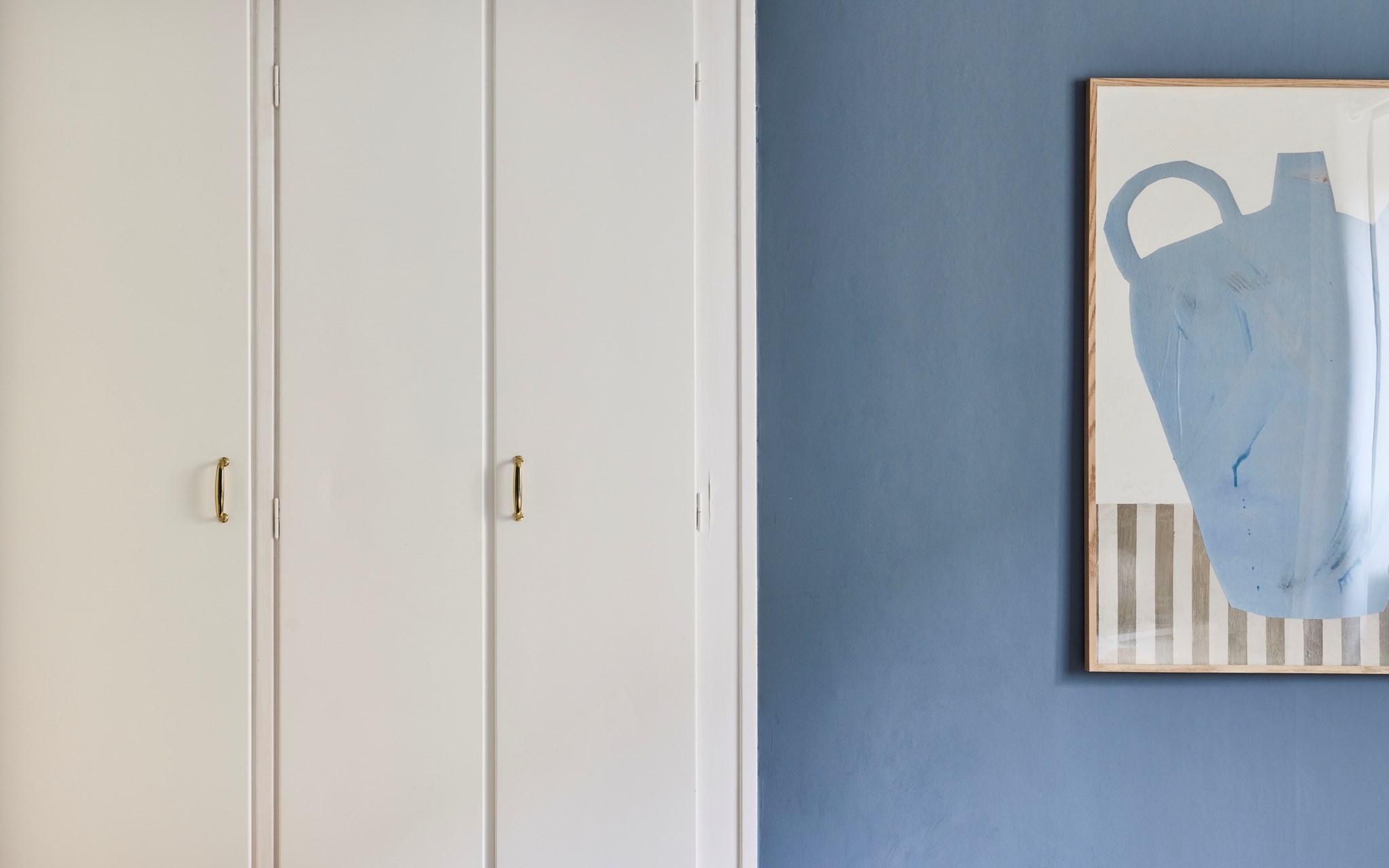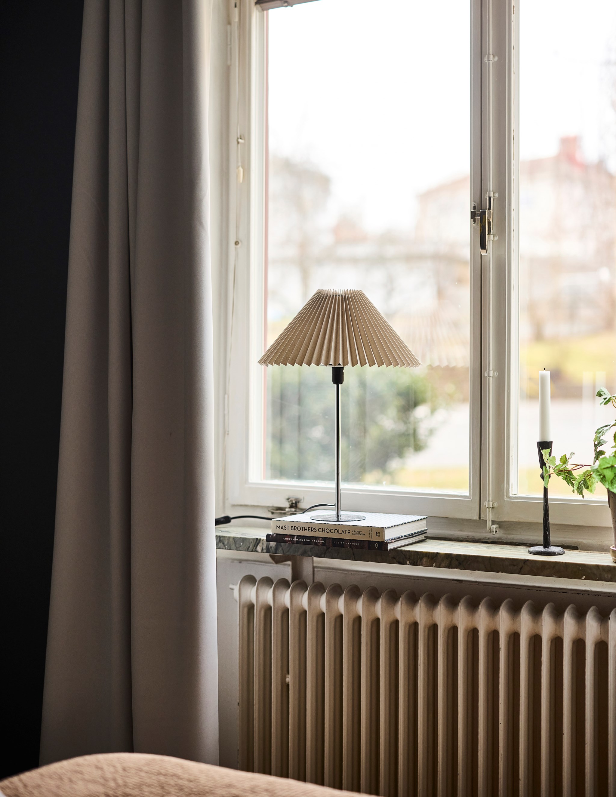 Sovrummet ligger mot den lugna baksidan, och det märks direkt när du kliver in. Här är det stilla på ett sätt som gör det lätt att varva ner, med ett mjukt ljus från fönstret och en grön vy ut mot gården. Rummet rymmer enkelt en dubbelsäng och lämnar ändå plats för annat, som en liten arbetsplats eller en fåtölj i hörnet. De inbyggda garderoberna tar hand om förvaringen och förstärker känslan av att allt är ordnat. Originaldetaljer som fönsterbrädan i sten och rummets proportioner ger en varm, självklar karaktär.