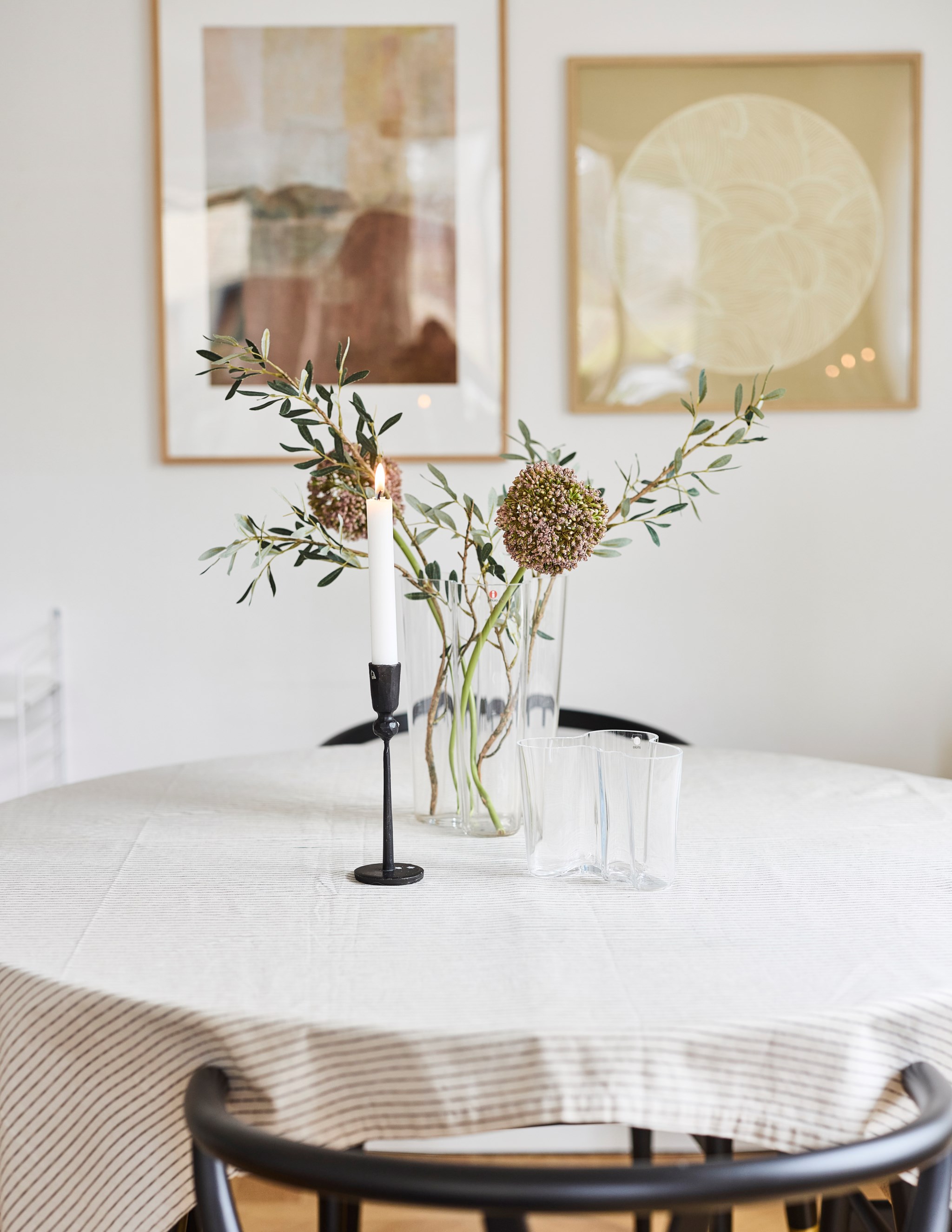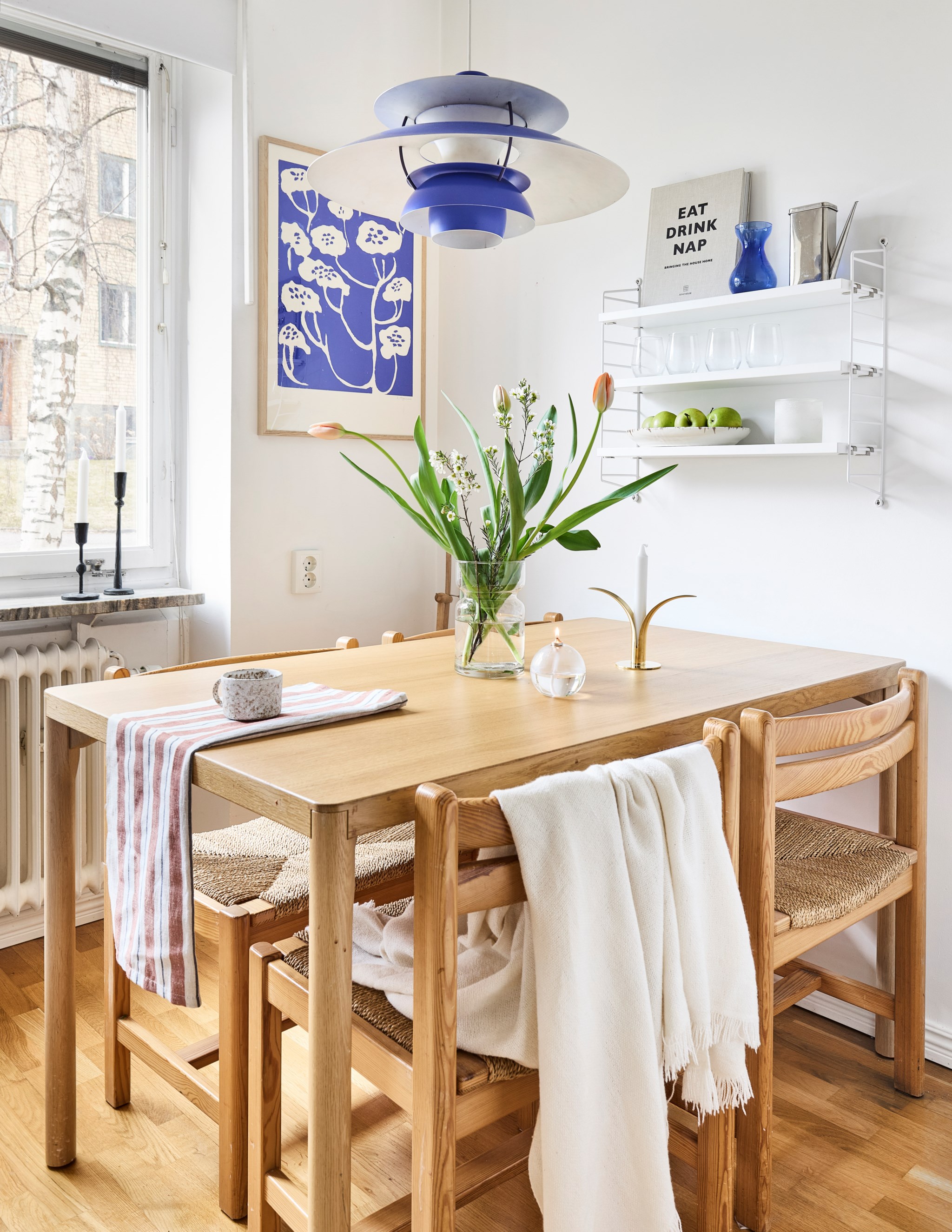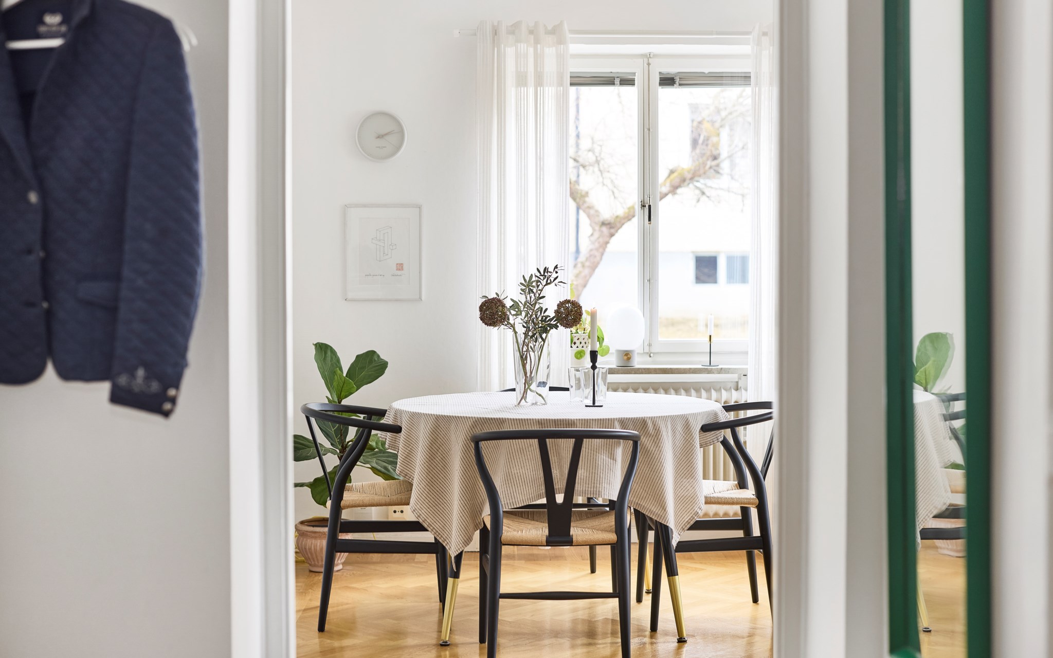 Vid fönstret finns utrymme för ett matbord för fyra, där hittar ljuset från väster in under eftermiddagen och kvällen. En enkel plats att börja dagen på. Eller landa i när du kommer hem.
