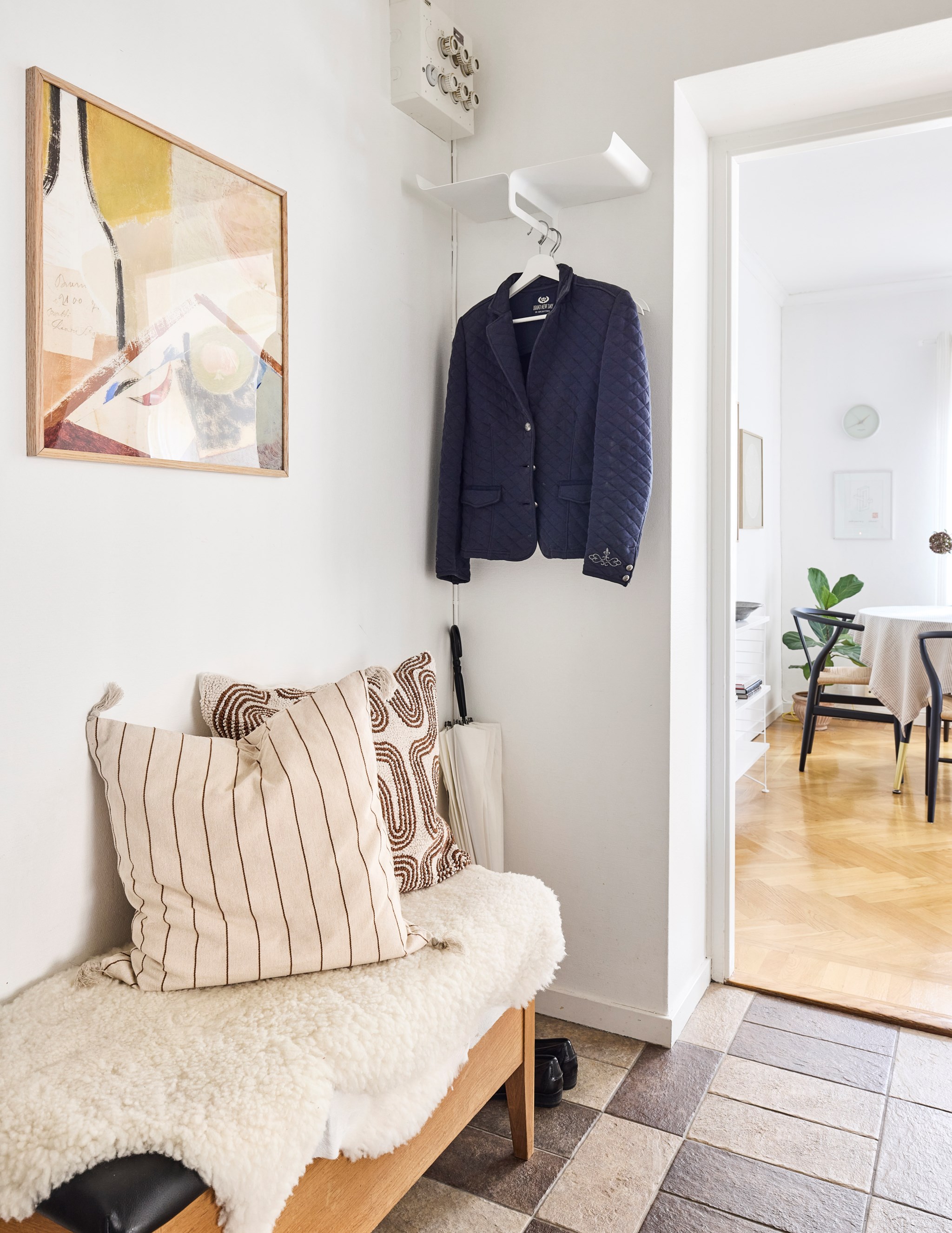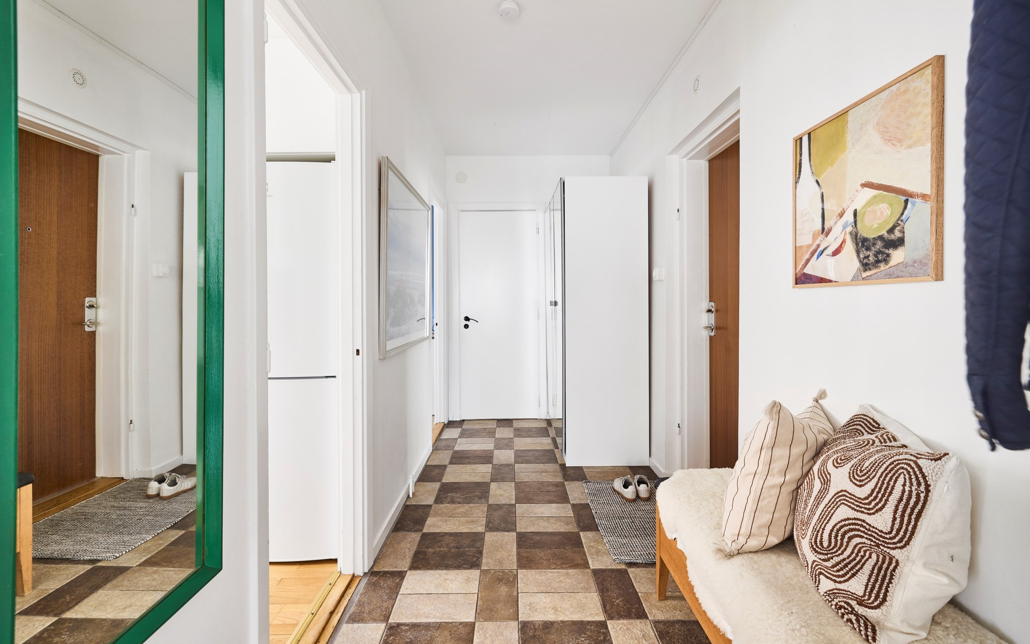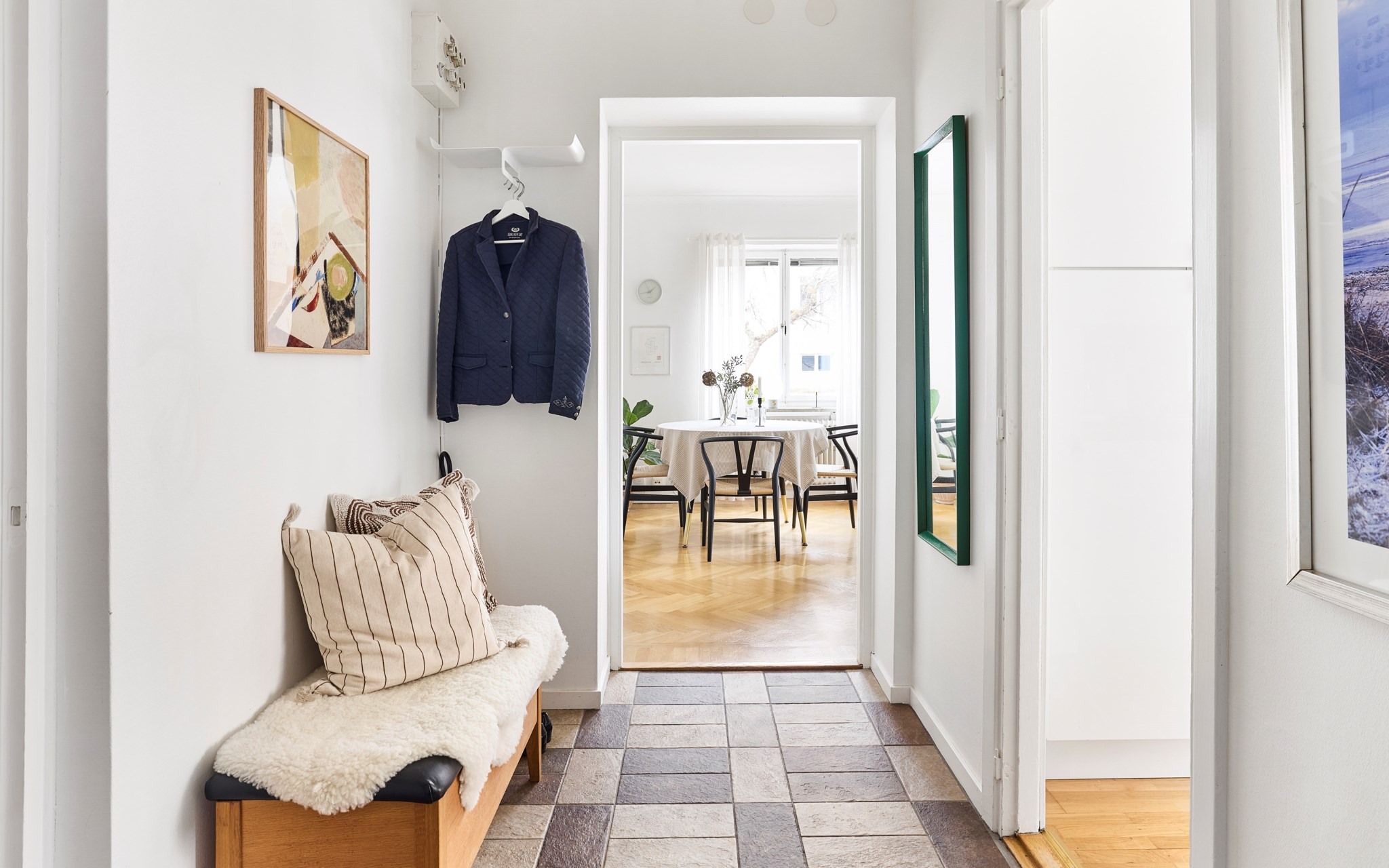 Du kliver in i en lång, lugn hall där allt har sin plats. Klinkergolvet tar hand om skorna direkt innanför dörren, och längs ena sidan finns garderober som sväljer ytterkläder och det du inte vill ha framme.