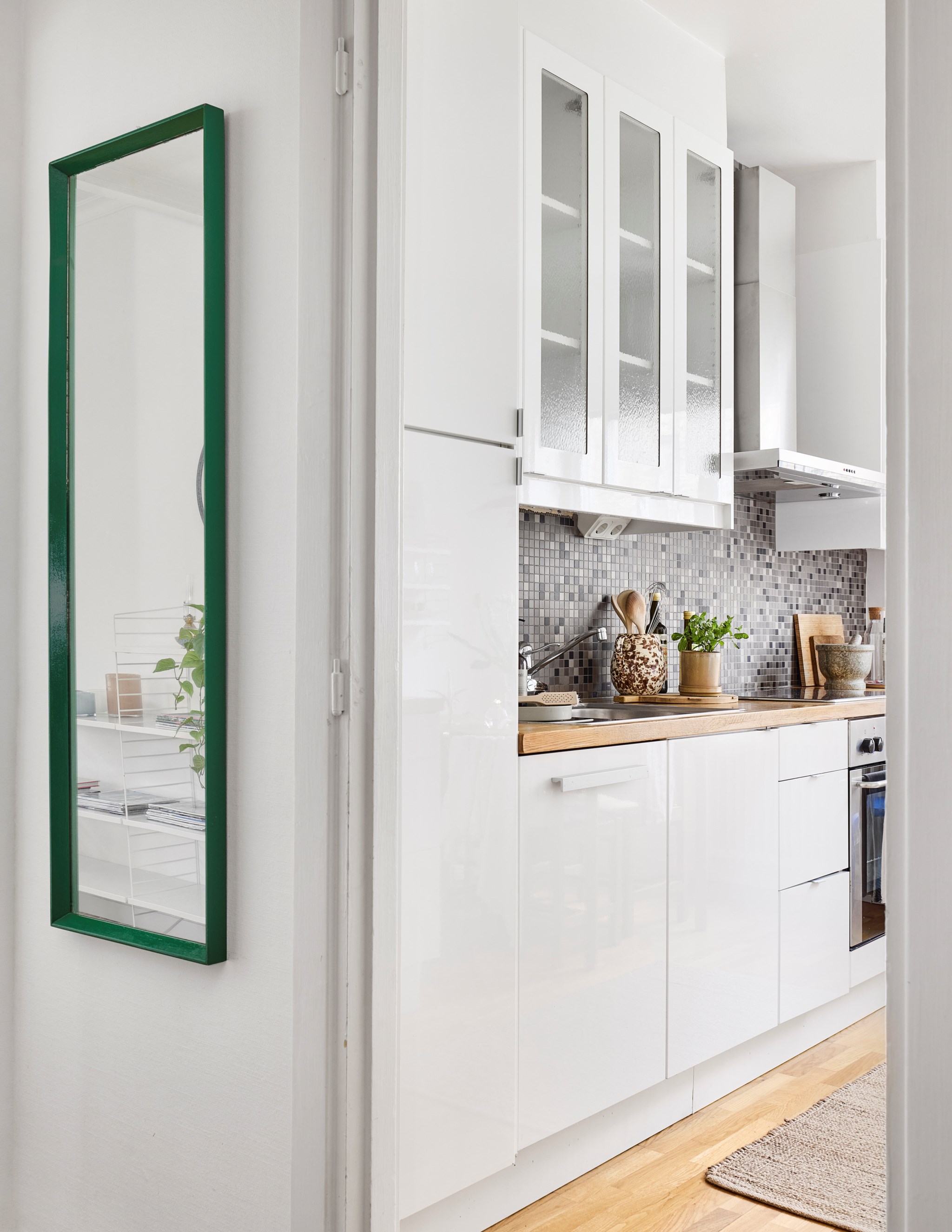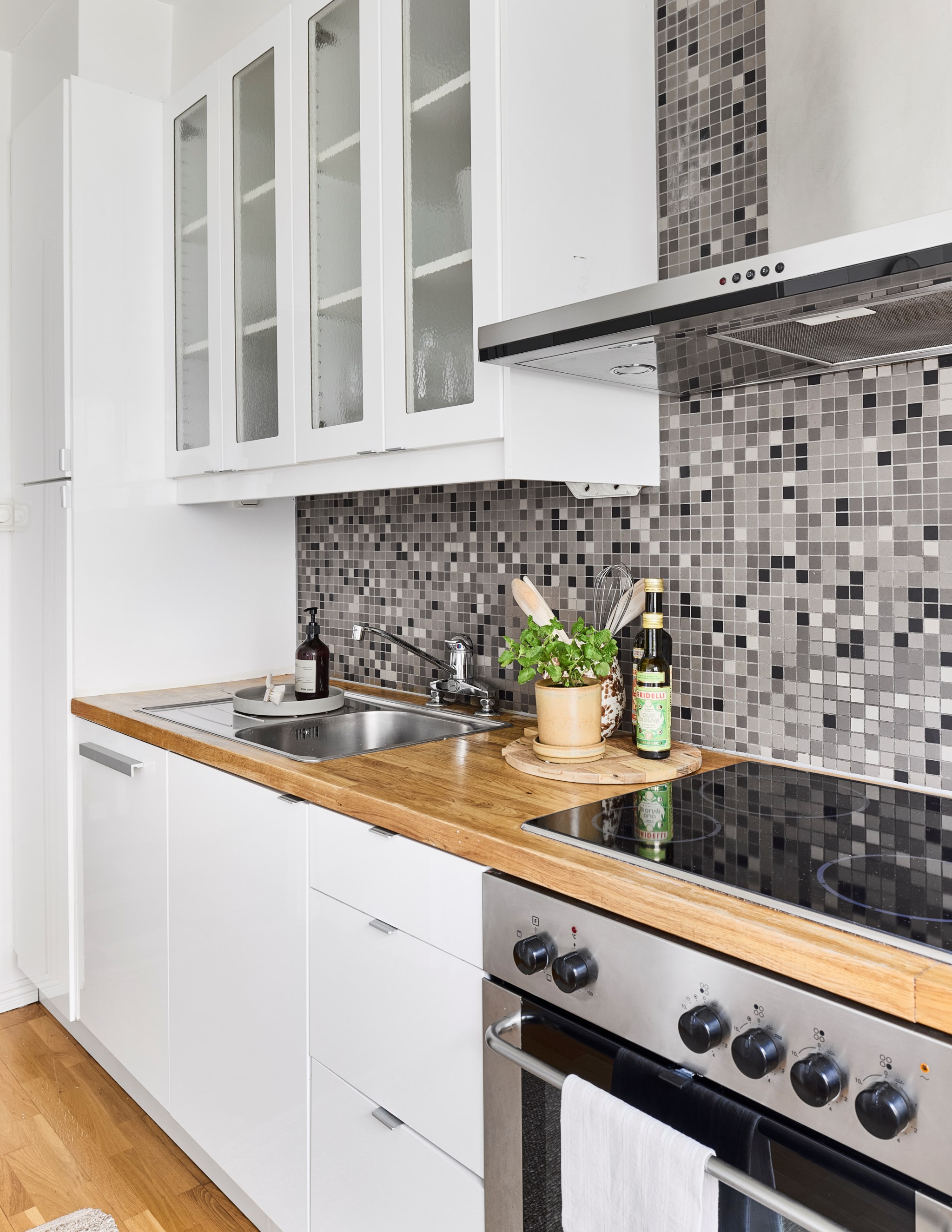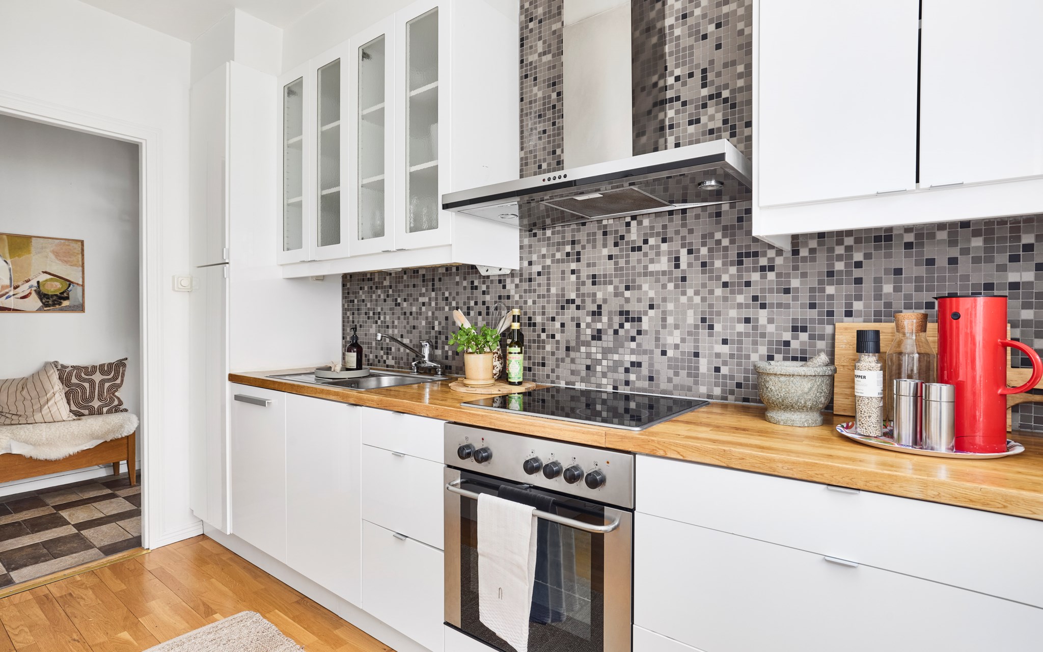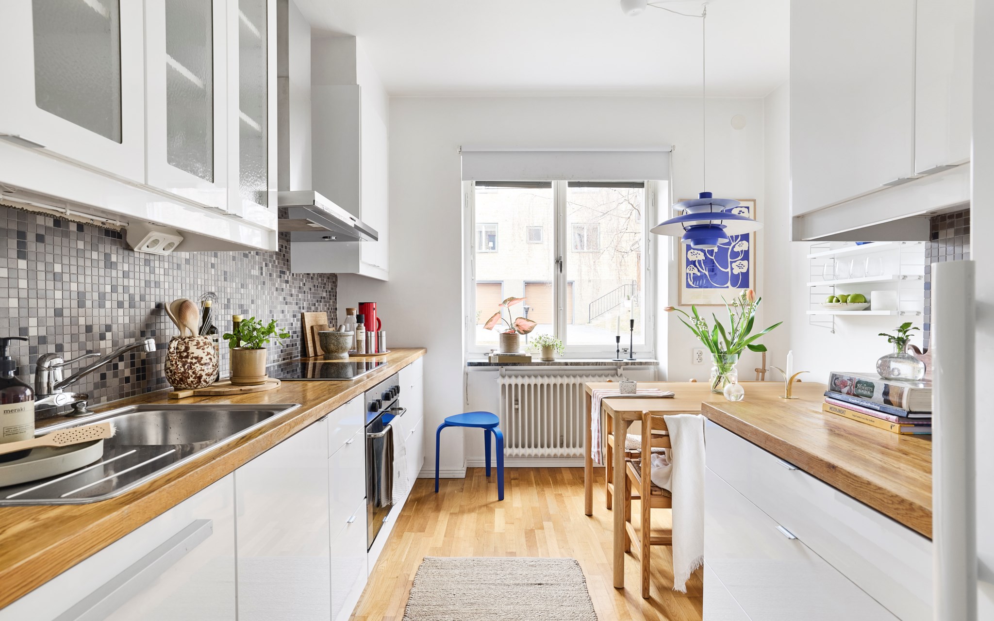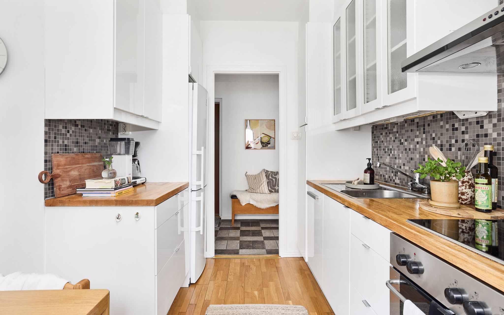 Inredningen är stilren i vitt med träbänkskivor som värmer upp helheten. Här finns bra med förvaring och arbetsytor på båda sidor, vilket gör köket smidigt att arbeta i. Planlösningen är klassisk och fungerar precis som du vill att den ska. Ett kök som gör vardagen enkel och som du lätt kan sätta din egen prägel på om du vill.