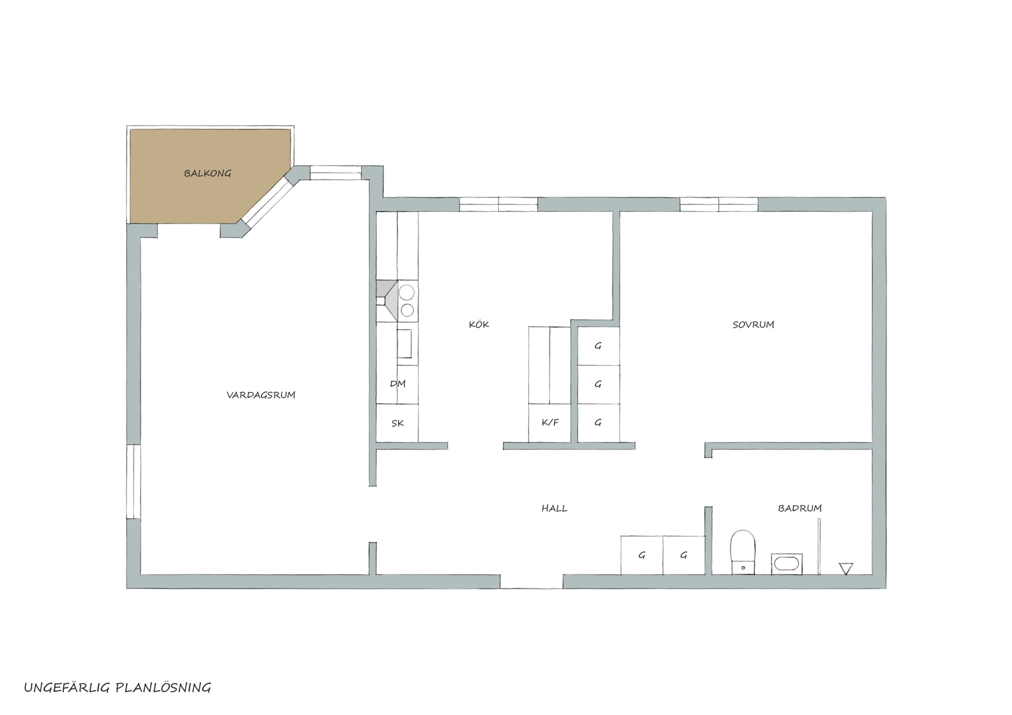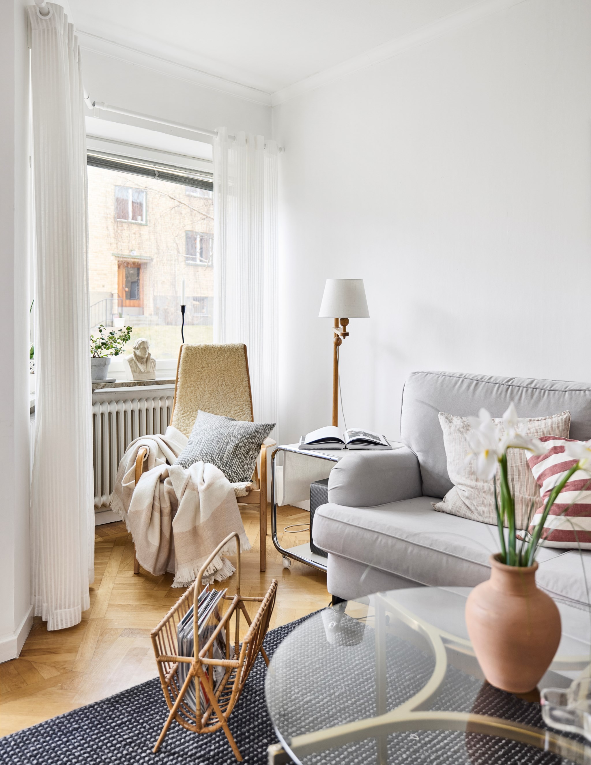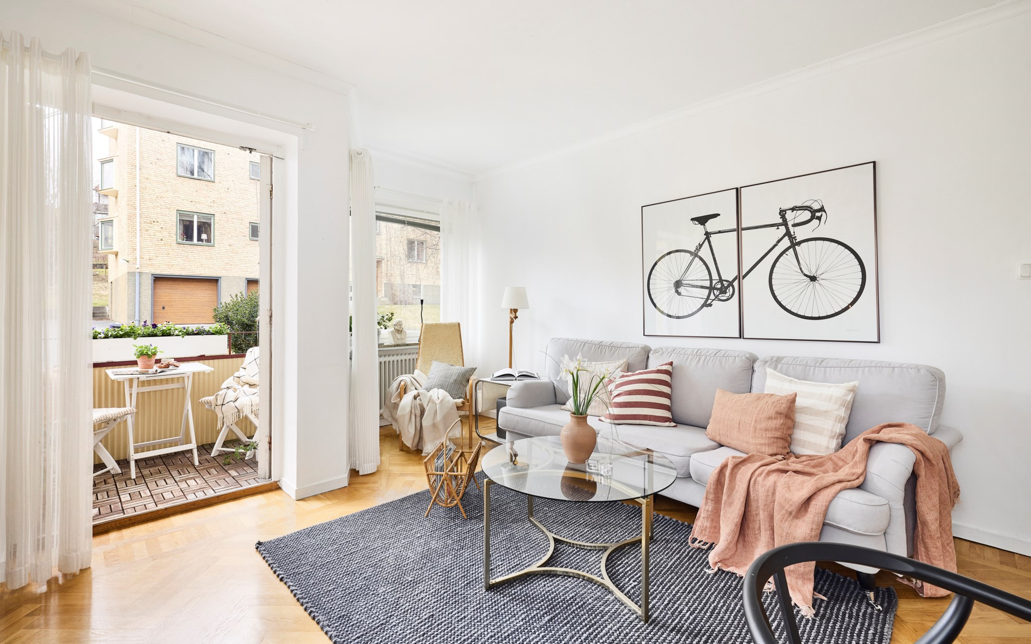Vardagsrummet ligger i ena änden av lägenheten och känns direkt öppet och inbjudande. Ljuset kommer in från två håll och tillsammans med dörren ut till balkongen får rummet en fin rytm över dagen. Här finns gott om plats för både soffhörna och matbord utan att det känns trångt. Fiskbensparketten ger karaktär och binder ihop rummet på ett lugnt sätt, medan de stora fönsterpartierna håller känslan lätt. Det är ett rum att vara i, oavsett om du har vänner över eller bara vill sjunka ner i soffan efter en lång dag.
