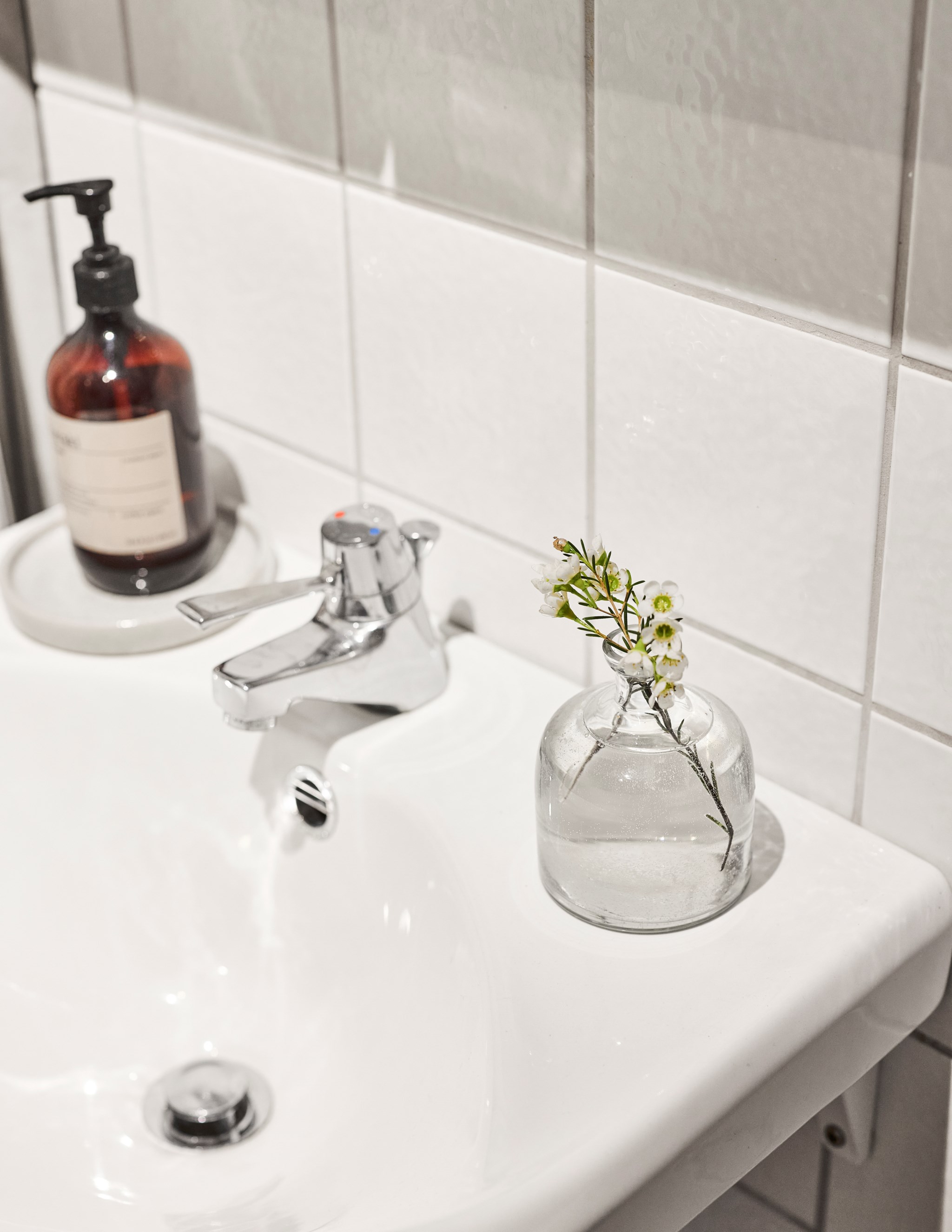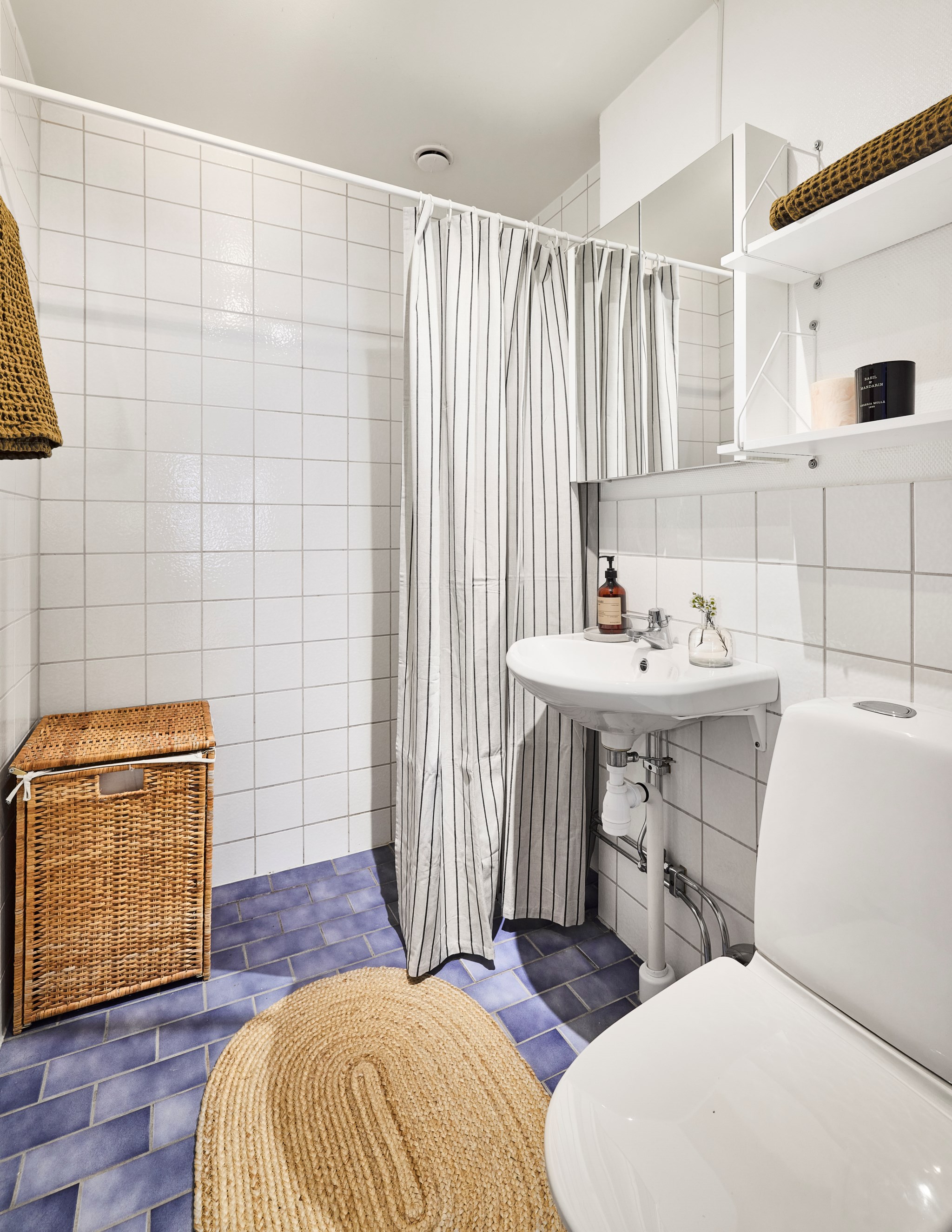 Badrummet nås direkt från hallen och är enkelt och rakt på sak. Här finns det du behöver, utan att ta upp mer plats än nödvändigt. Dusch, wc och handfat ryms i en planlösning som gör rummet lätt att använda i vardagen. Kakel på väggarna och klinker på golvet ger en tålig bas, och ljusa ytor tillsammans med textilier och detaljer gör det möjligt att sätta en mjukare känsla.