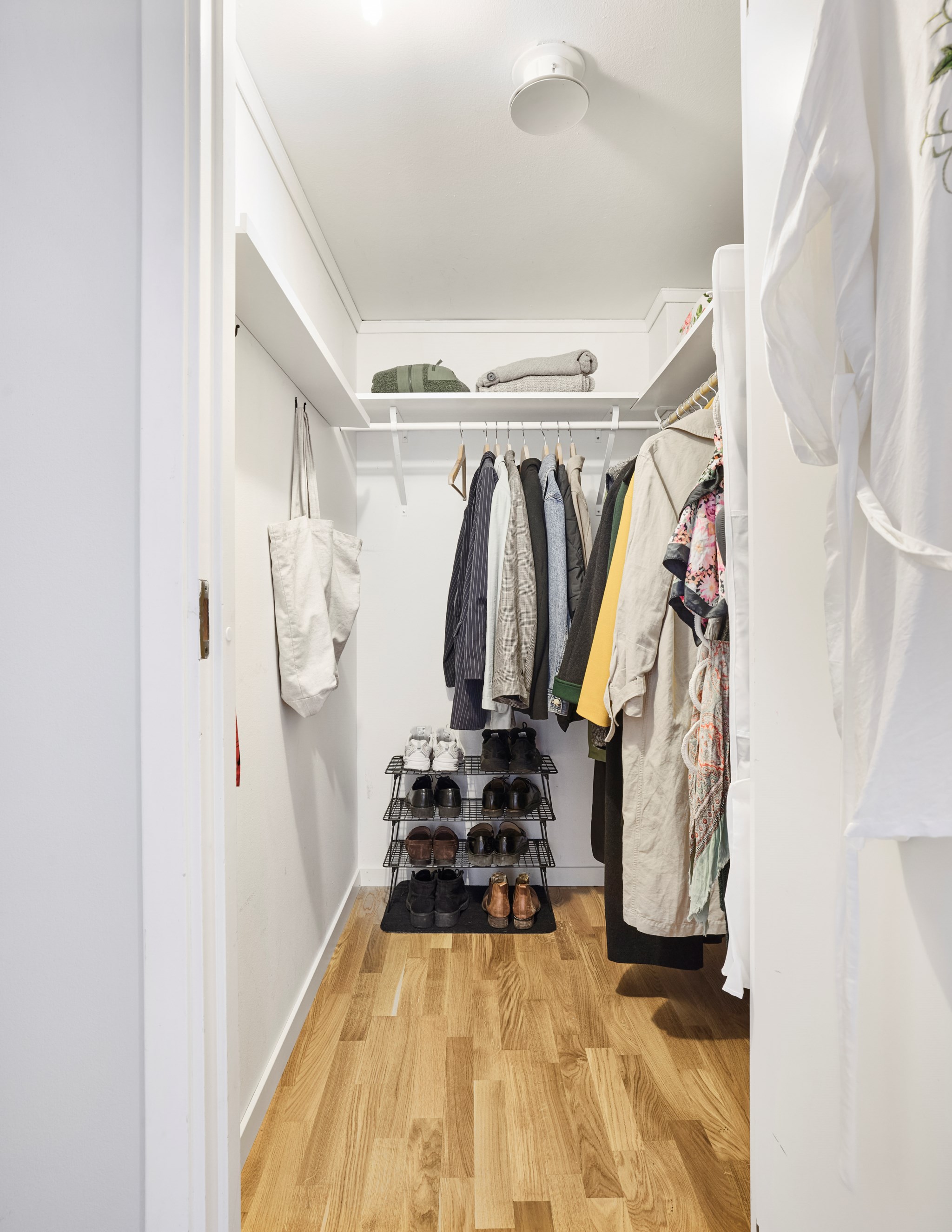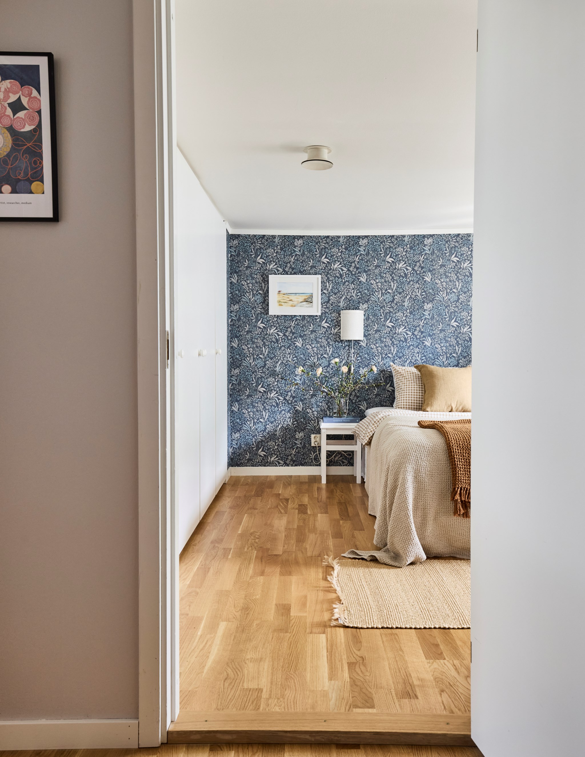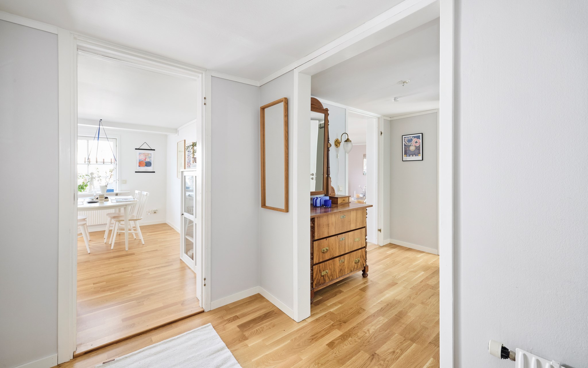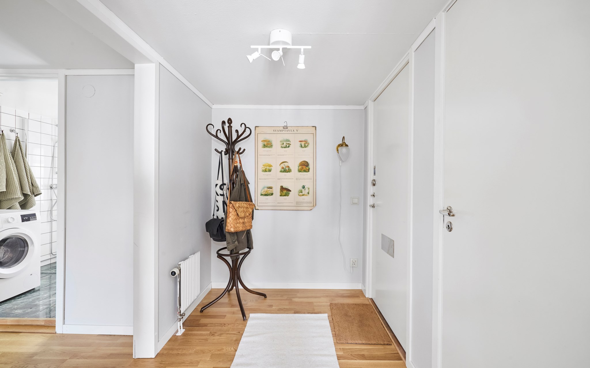 Som sagt, här får du i princip egen ytterdörr mot den stensatta gården eftersom grannen sällan på entréplan alltsom oftast använder sin entré från andra sidan huset. Den riktiga hallen hittar du en trappa upp, och med en klädkammare inom räckhåll för den ordningsamme dessutom. Ekparkett på golvet, precis som i resten av lägenheten. In mot sovrum och vardagsrum har du ytterligare en liten hall som dessutom är möblerbar.