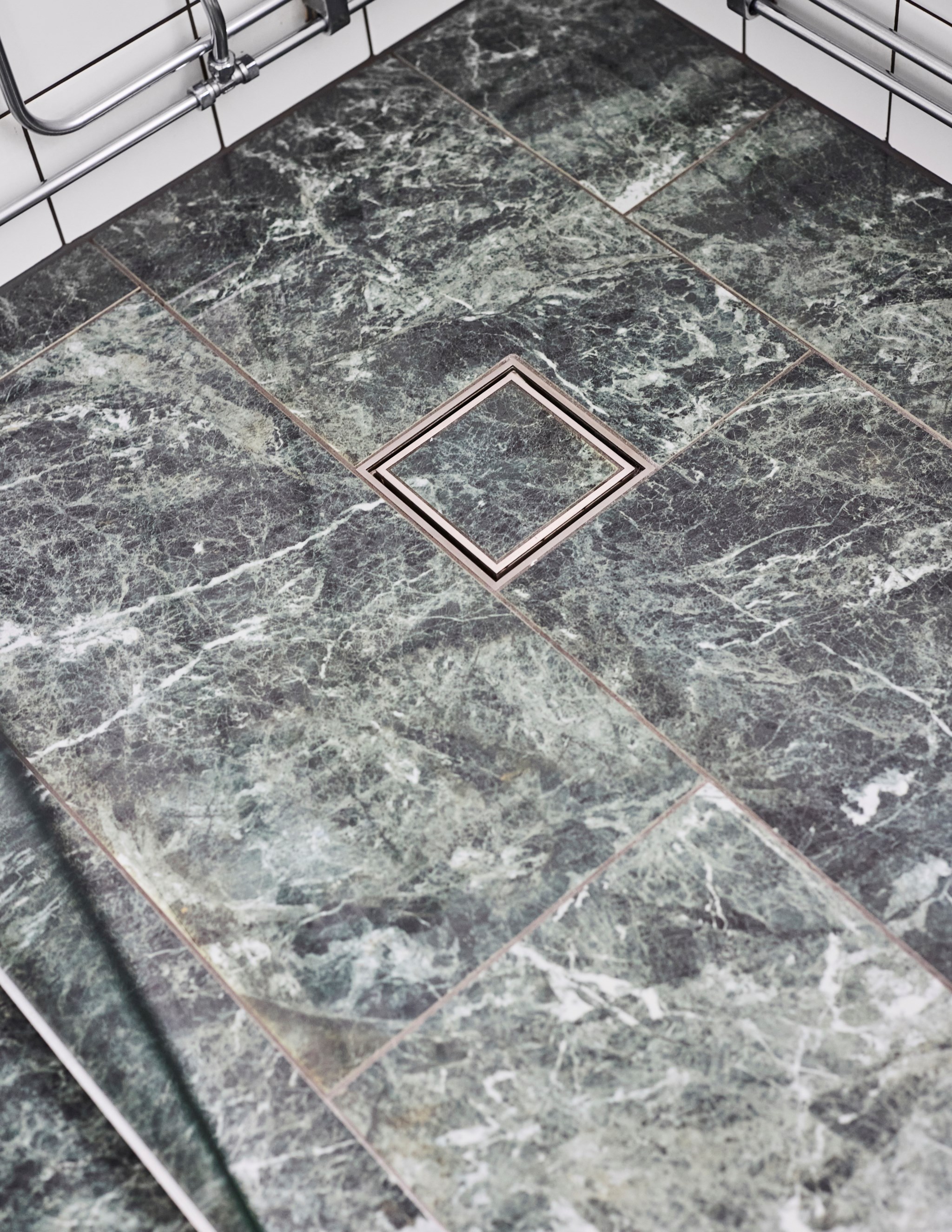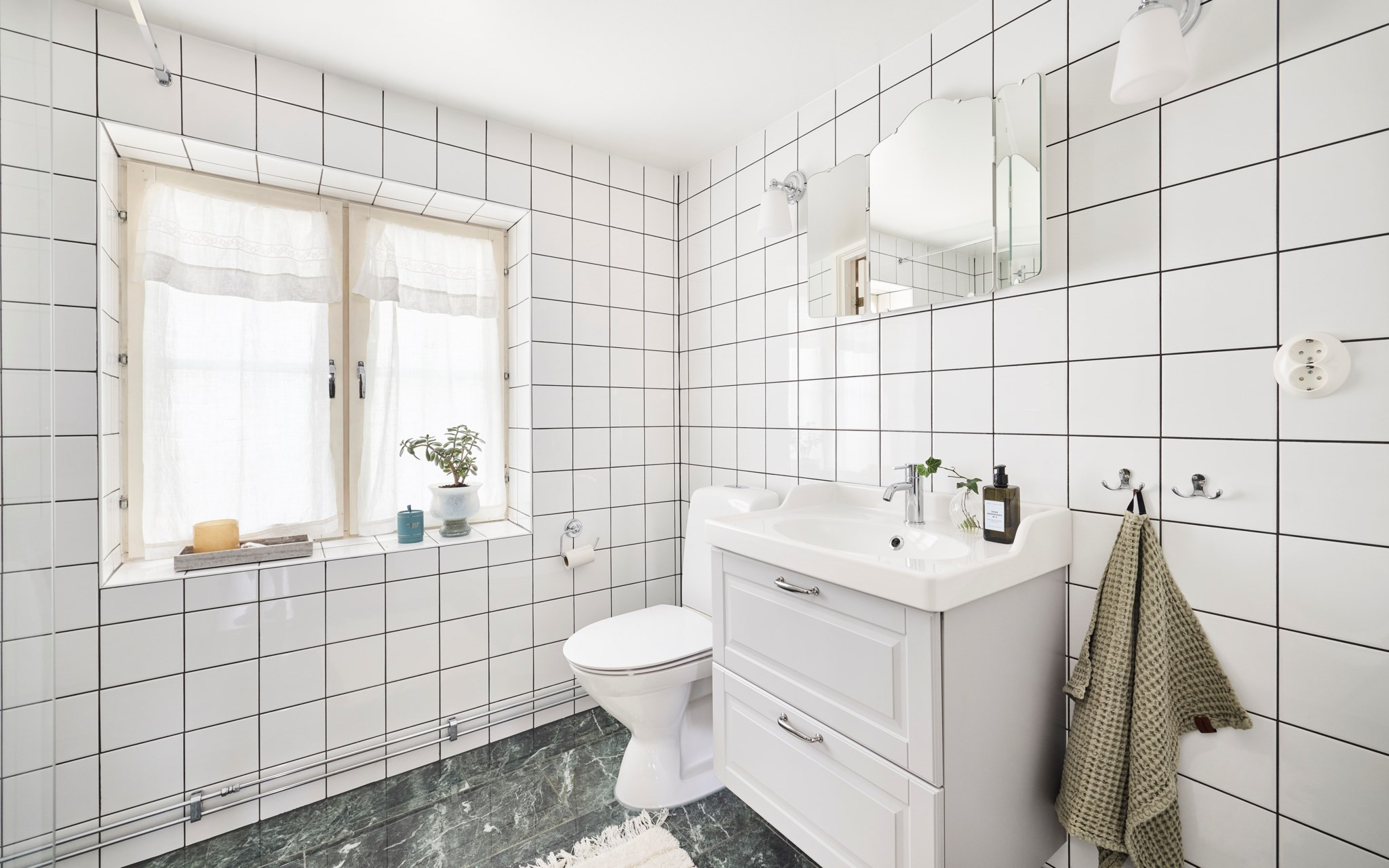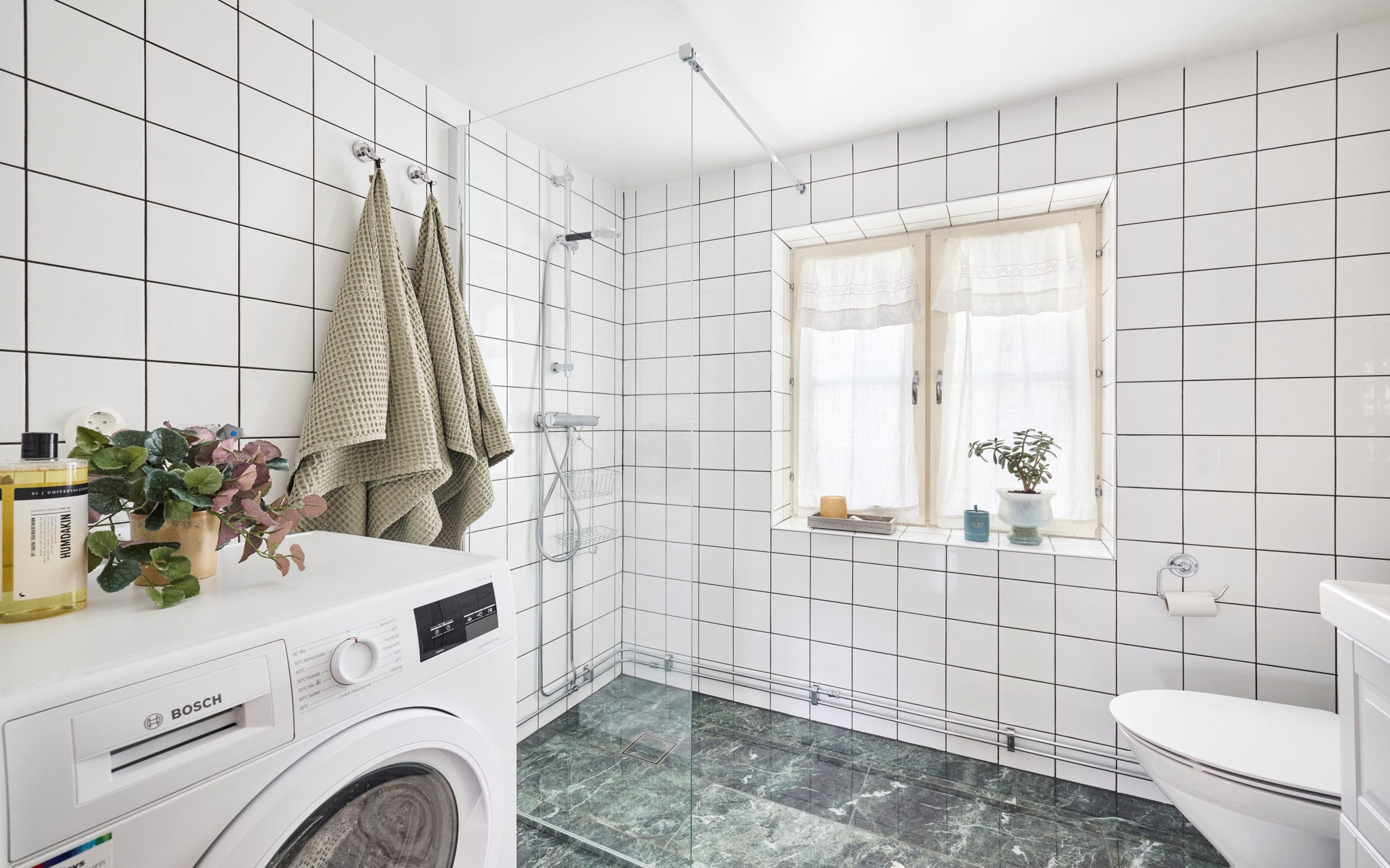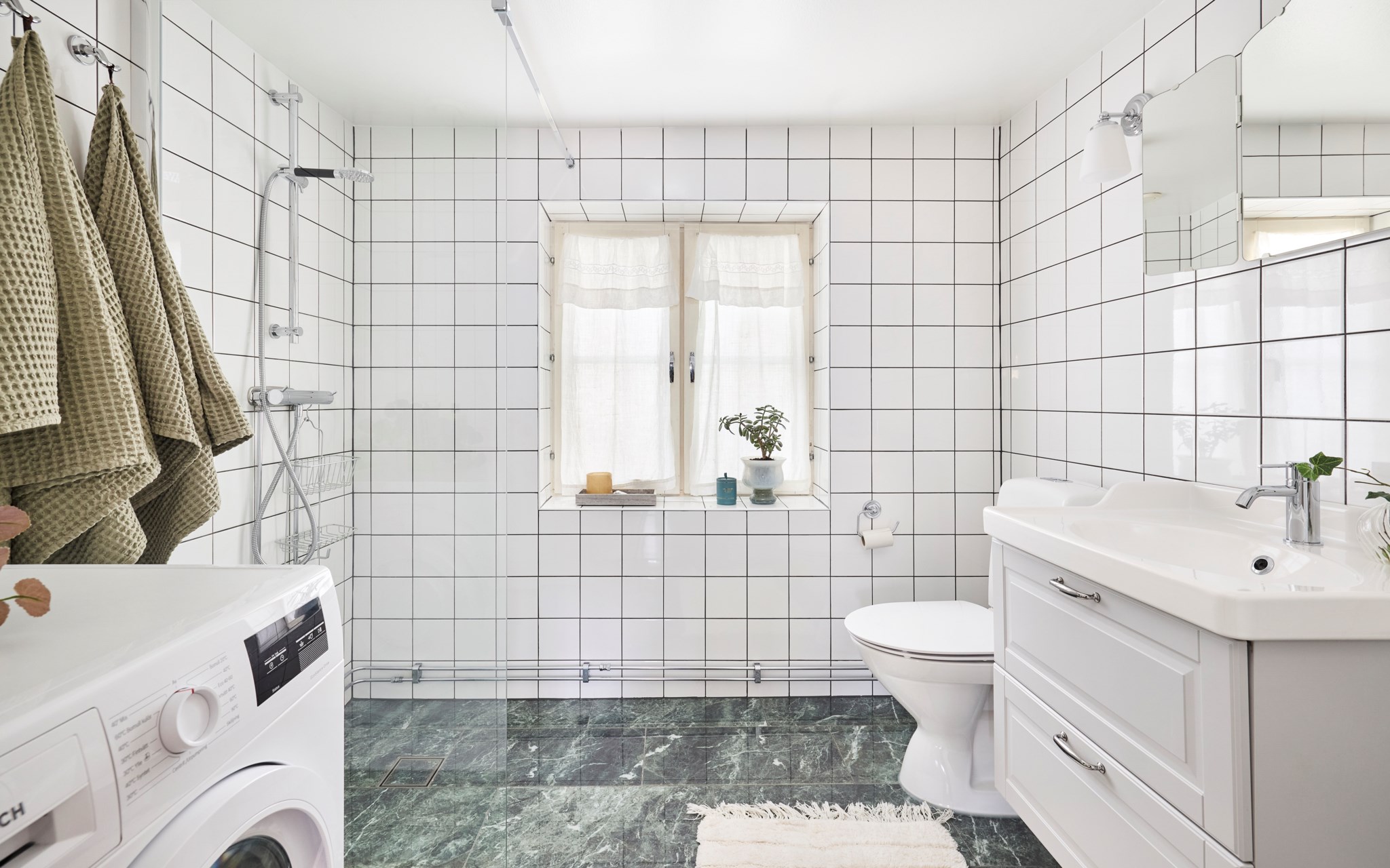 Högsta betyg för val av klinker, kakel och komod i stilren kombination, men med egen knorr som passar husets stil och ålder väl. Kakel i 15x15-format är alltid rätt och riktigt, och blir aldrig omodernt. Golvet ser ut som blänkande marmor, men är alltså en tålig klinker som är betydligt mer praktisk än sin förlaga. Tål slabb och stänk från schampo och andra skönhetsprodukter utan ett enda spår sätter sig. Enkelt att svabba och bara torka av. Eldriven golvvärme redo året runt om du vill, så även tvättmaskinen.