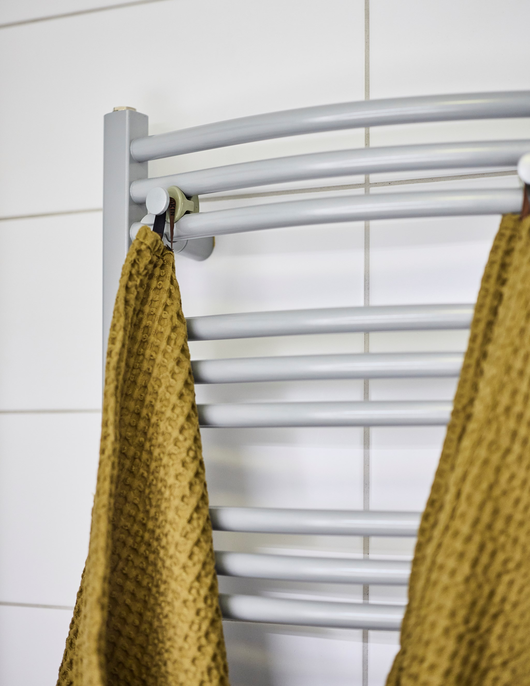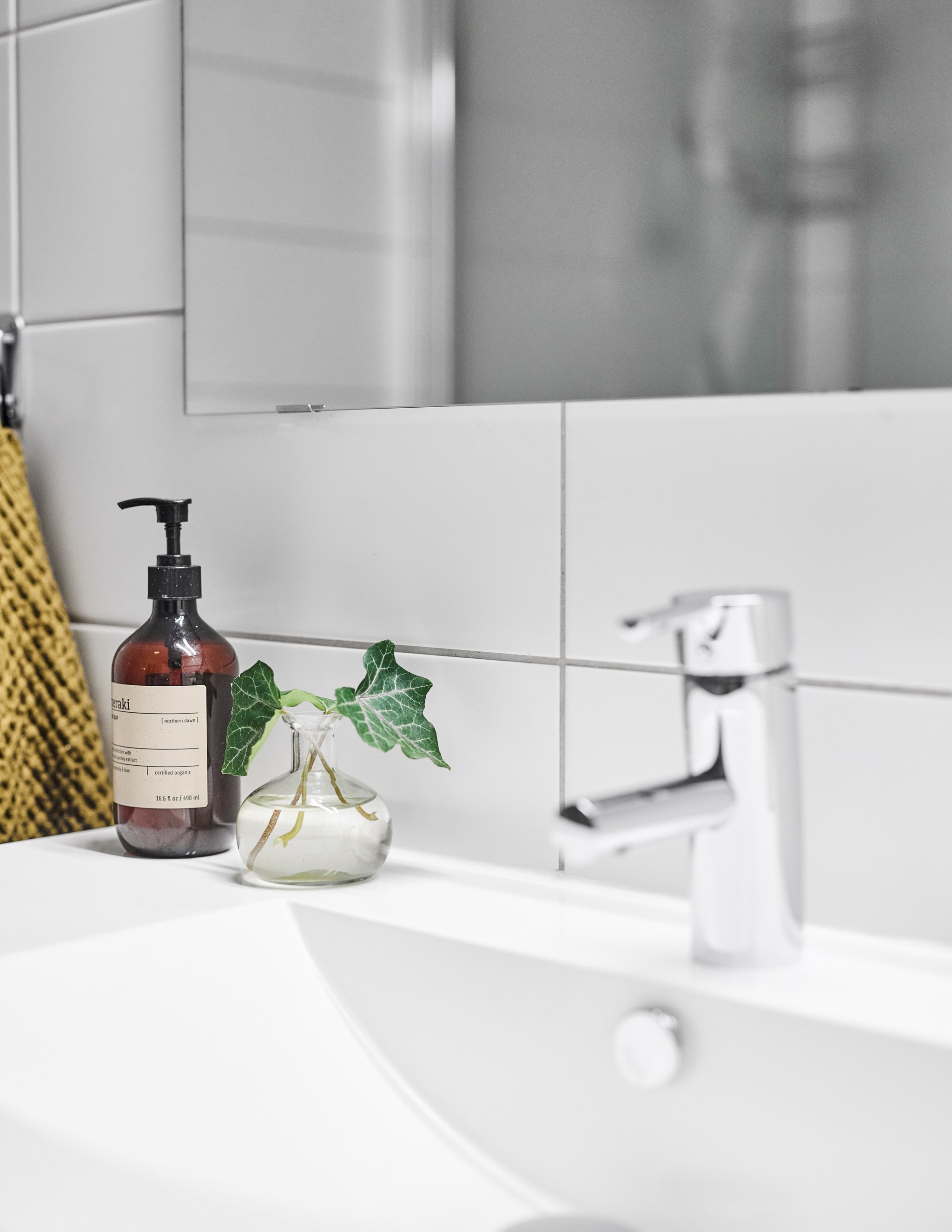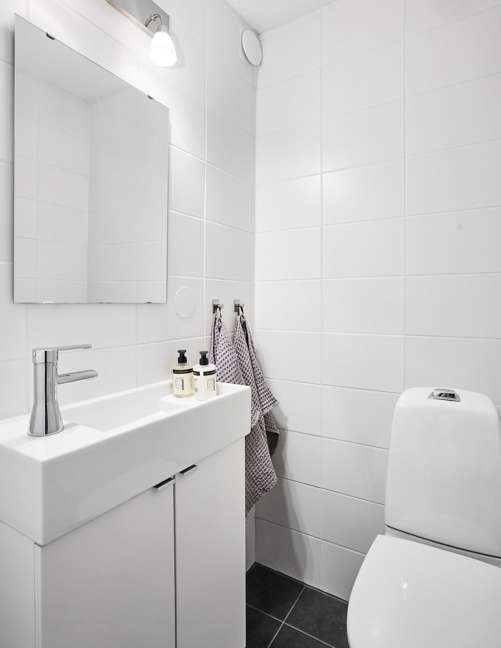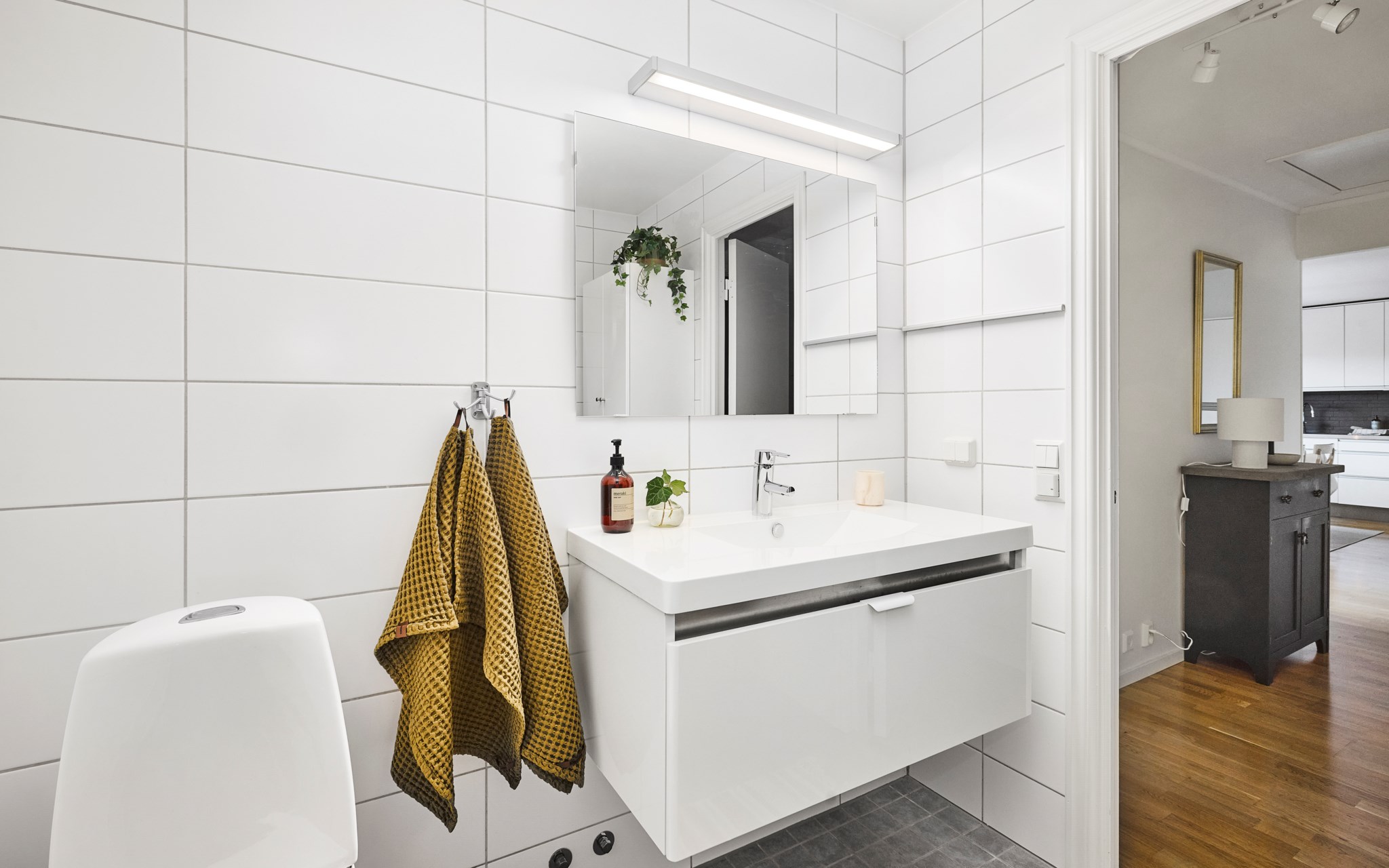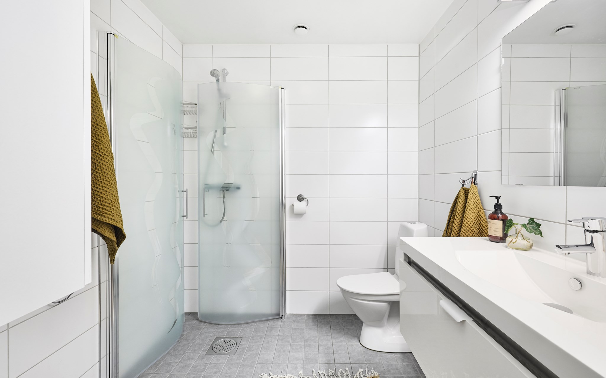 Stora badrummet hittar du en trappa upp med duschen bakom dubbeldörrar i glas. Vitt slätt kakel blir liksom aldrig omodernt eller daterande från en speciell tid. Bra att det är vitt som gäller även i tvättstugan och på gästtoaletten. Ännu bättre att det är samma gråsvarta klinker på golvet dessutom. Särskilt som det är samma grå platta som även ligger i hallen nere utanför gästtoaletten och tvättstugan. Enhetliga golv har en märkbart lugn inverkan på sinnet och hur man upplever ett hem. I badrummet uppe ligger det även golvvärme under plattorna. Att det är betongbjälklag i huset känns direkt om du stampar lite med hälen i golvet. Alla våtutrymmen i bästa skick dessutom.