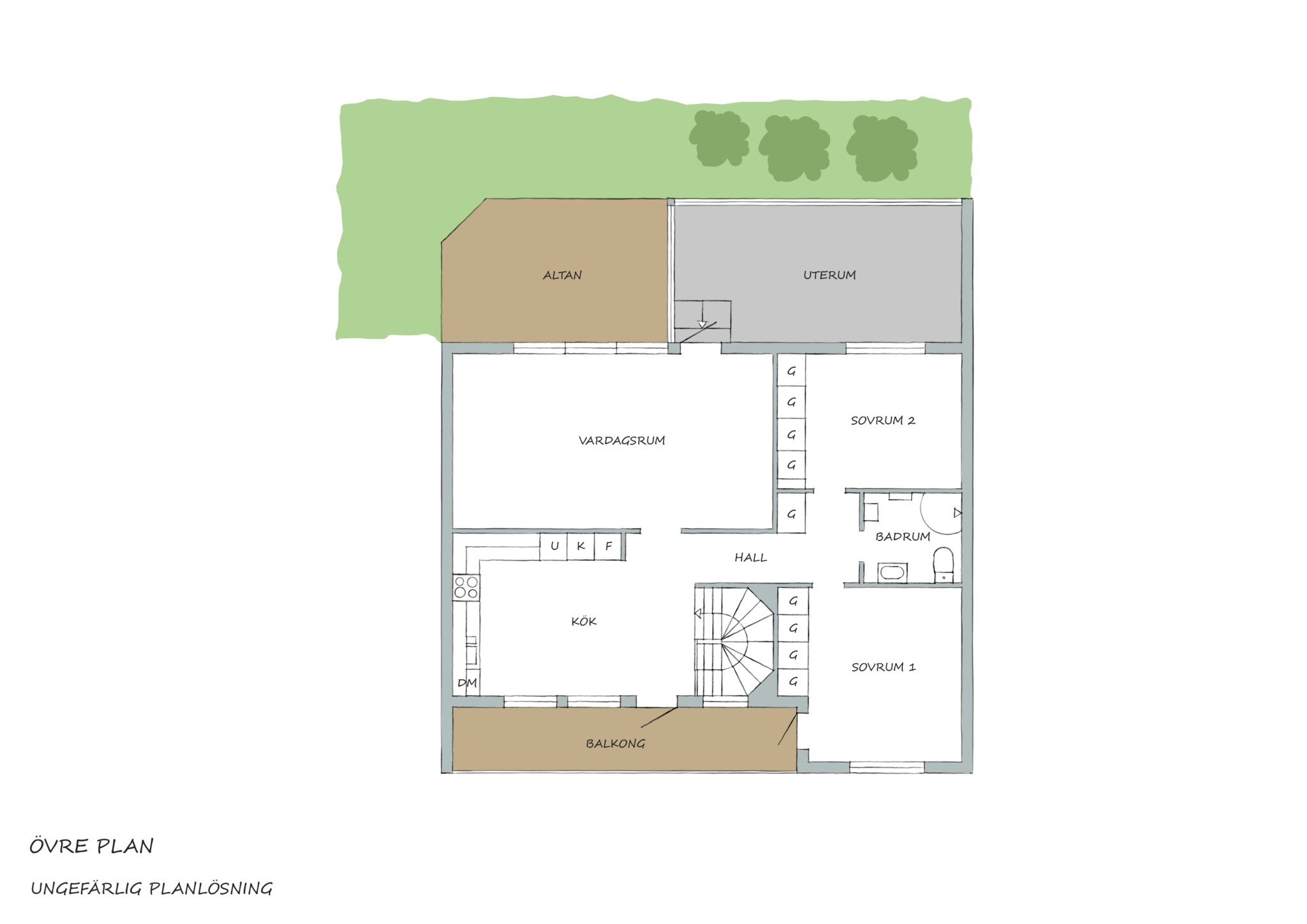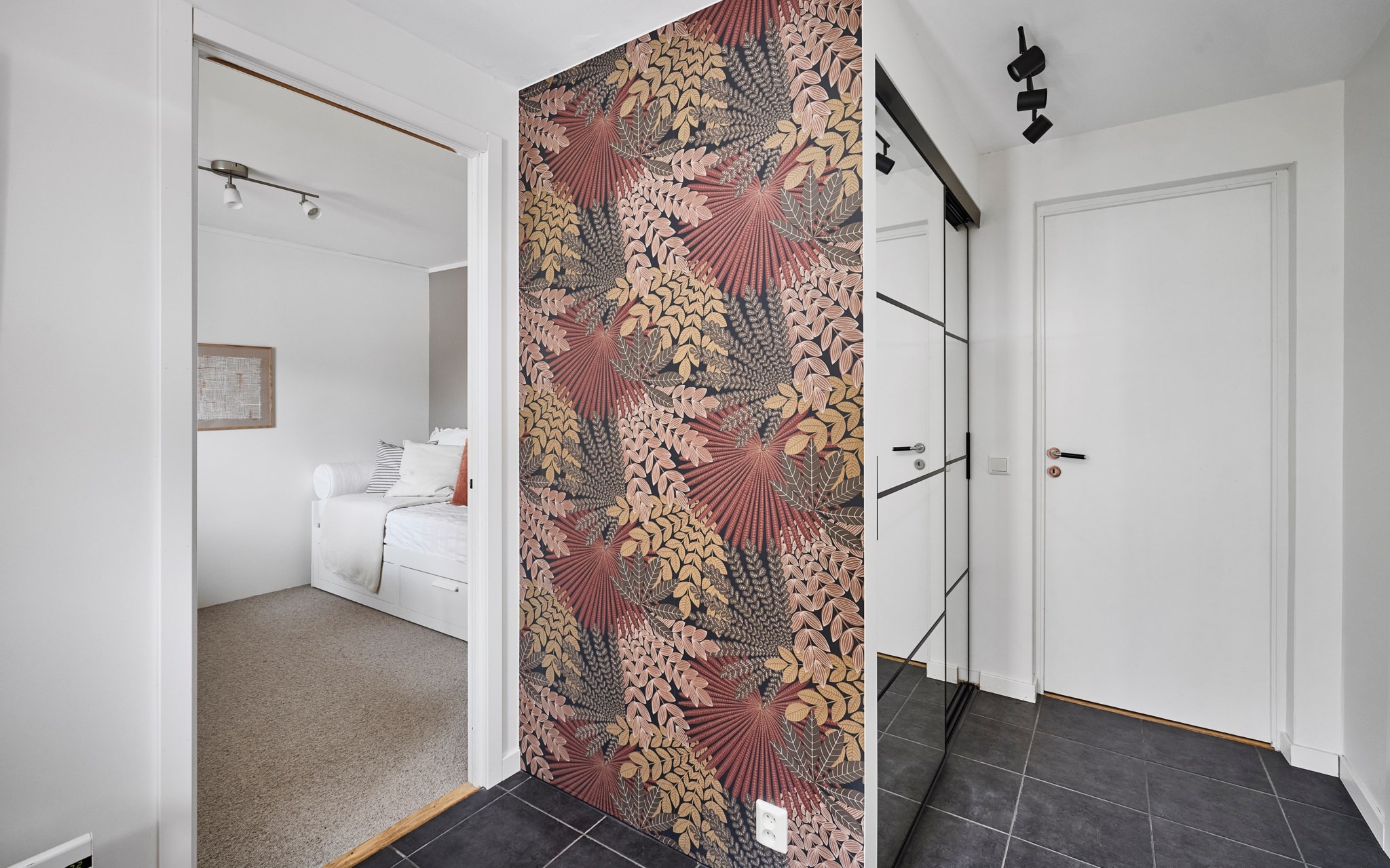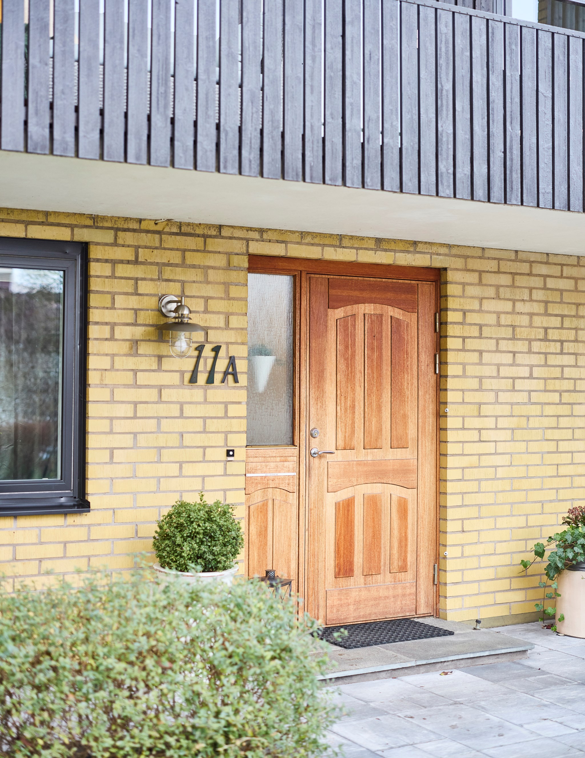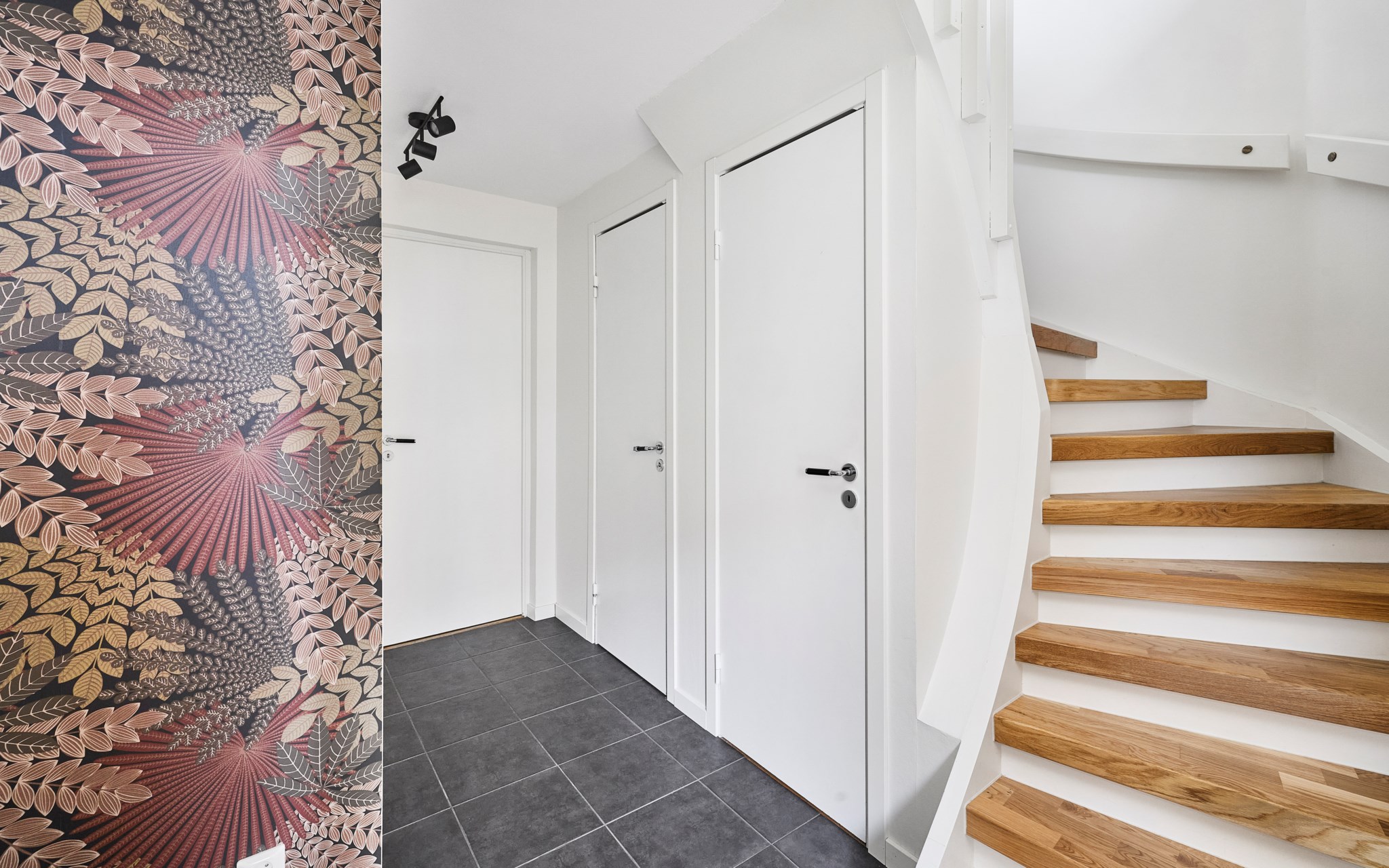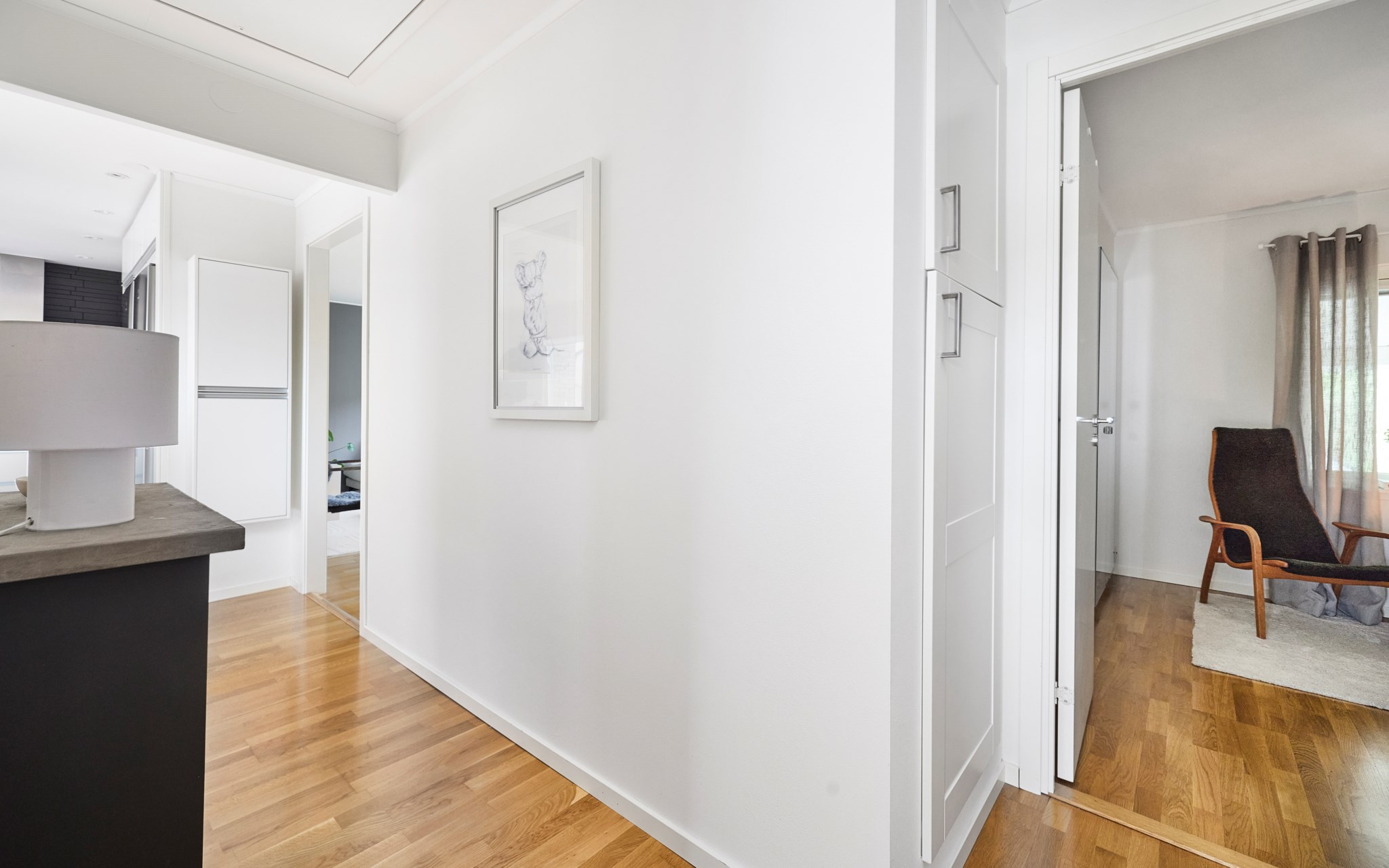 Nyare klinker på golvet som fortsätter hela vägen in mot källaren. Ytterdörren är dock den gamla rejäla i teak. Skjutdörrsgarderoben trollas bort med fin tapet, och under trappan trollar du bort en armé av skor i smarta skoställ. Trappan är precis som huset fint förnyad med steg i ek. Ja, hela 1970-talet känns faktiskt helt bortrollat här. Sovrum eller arbetsrum in till vänster och gästtoalett och tvättstuga hittar du rätt fram.