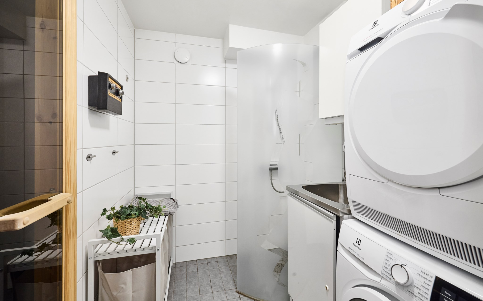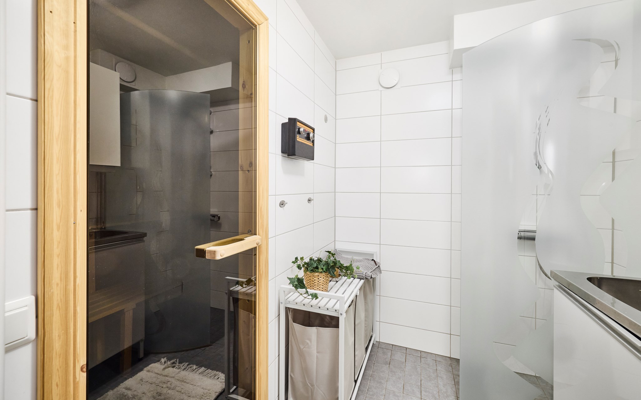 Nedervåningens dusch samsas med tvättstugan och renoverades, likt husets andra våtutrymmen, kring 2010. Bastun som ligger i anslutning är förvånansvärt stor och rymmer hela familjen, om ni inte är fööör många. Planera genast in bastukvällar, det är bra för både hyn och hjärtat. Kan torsdagar jämna veckor passa?