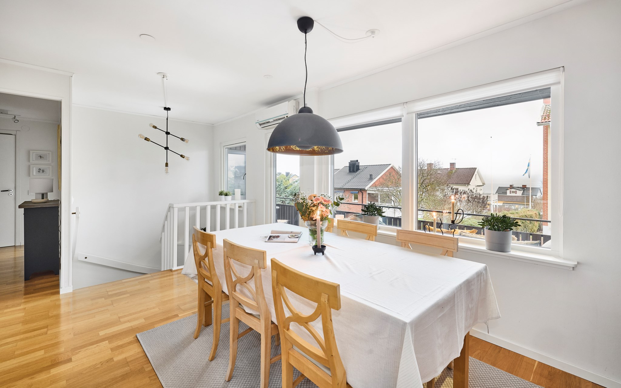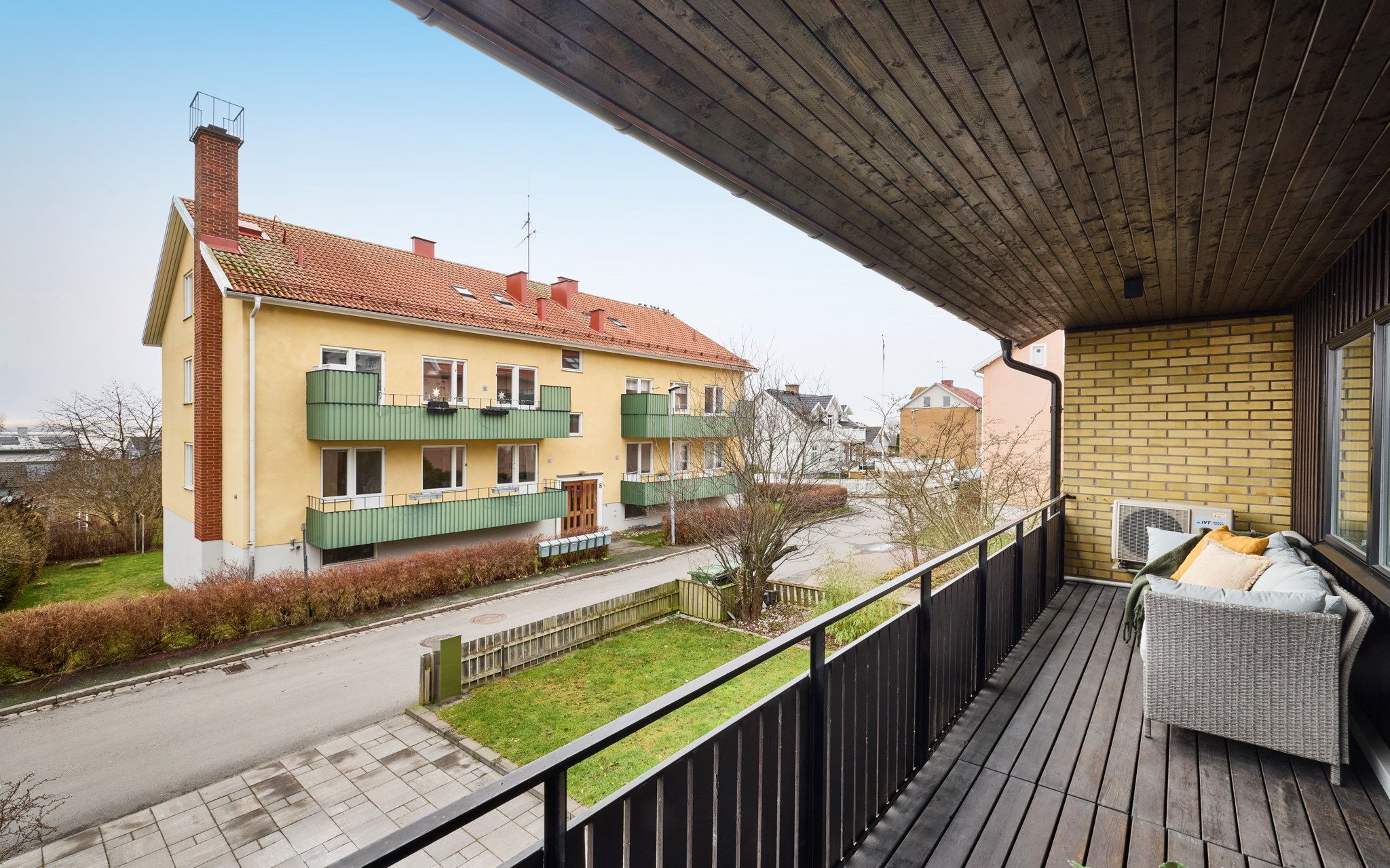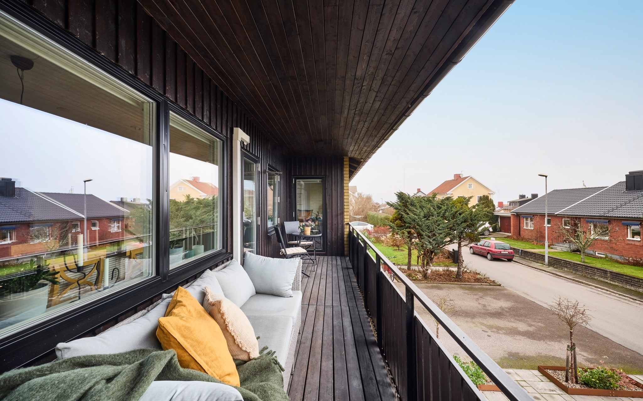 Sommartid finns det alltid en skön plats utomhus, vare sig du vill sitta i solen eller skuggan. Solälskaren börjar dagen här på balkongen, med morgonsolen över Vättern. Gillar du sval skugga smyger du ut här efter lunch och kan stanna hela eftermiddagen med en god bok utan att vara rädd att träffas av några heta strålar. På kvällen är det fantastiskt att sitta här och se ljusen tändas i Huskvarna. En allround-balkong i all sin enkelhet, kan det bli bättre?