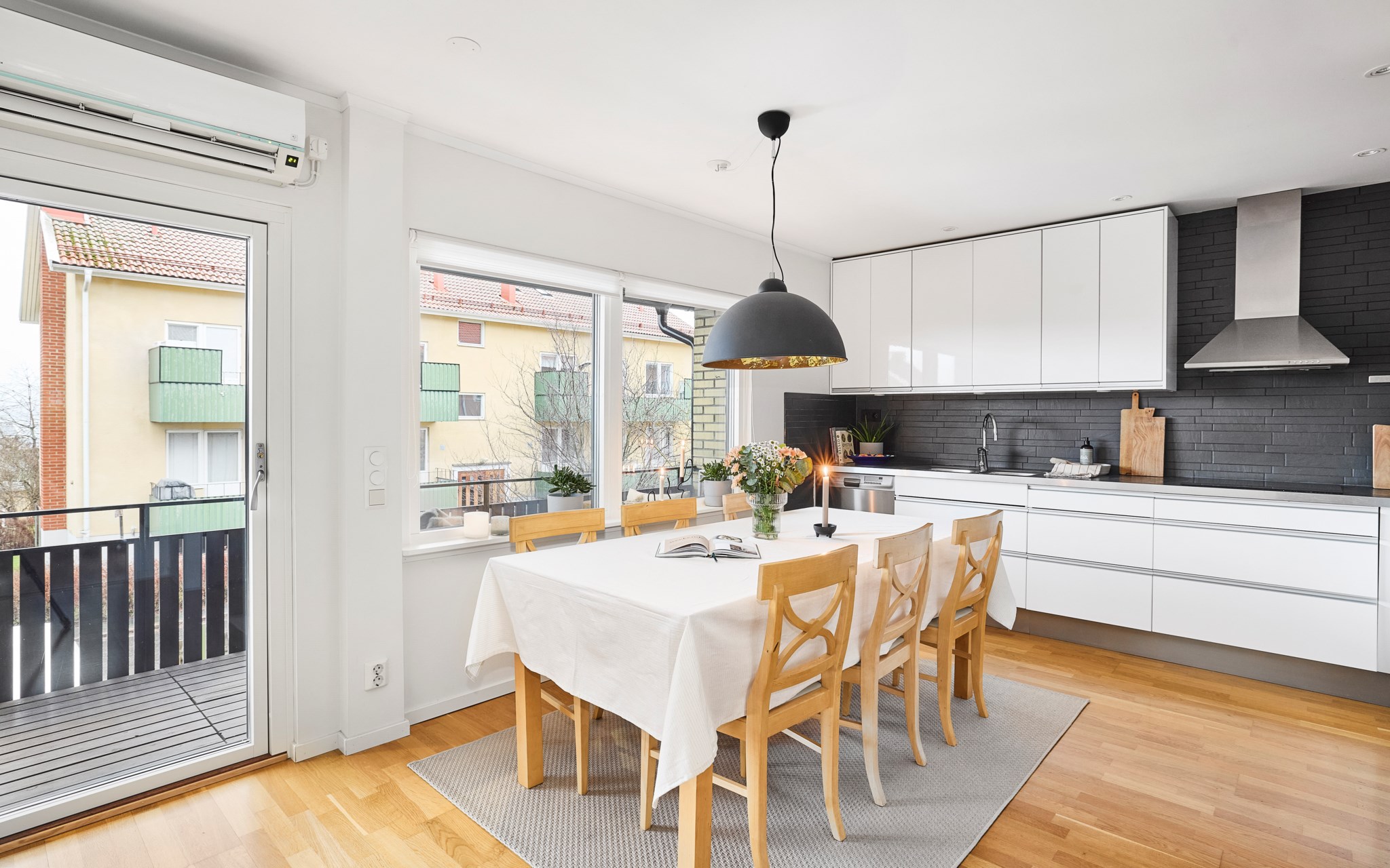 Här kommer morgonsolen spegla sig i högblanka vita luckor och lådor. Bänkskivor i mörkt laminat och kakel i samma tonfall ungefär. Även köket känns som nytt men renoverades av en tidigare ägare och alltjämt i nyskick. Nuvarande ägare har dock bidragit med ny ugn och ny kyl och frys. Om du vänder blicken bort från köket så har du Vättern i siktlinjen mellan husen och ännu mer av himlen där ovan. På golvet samma ekparkett som du först satte fötterna på i trappan och sen i alla rummen uppe. Dörr ut till långbalkongen de dagar morgonrodnaden lockar till frukost. Balkongen ligger under tak hela vägen utanför köket.