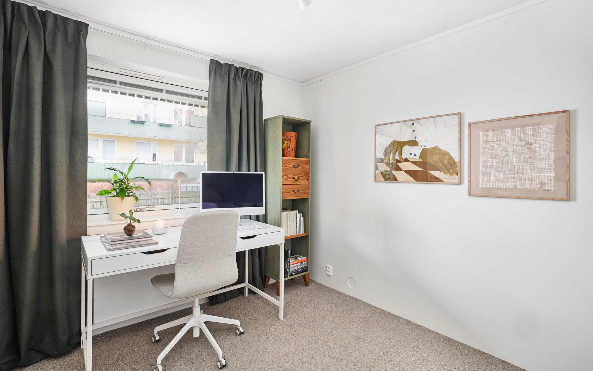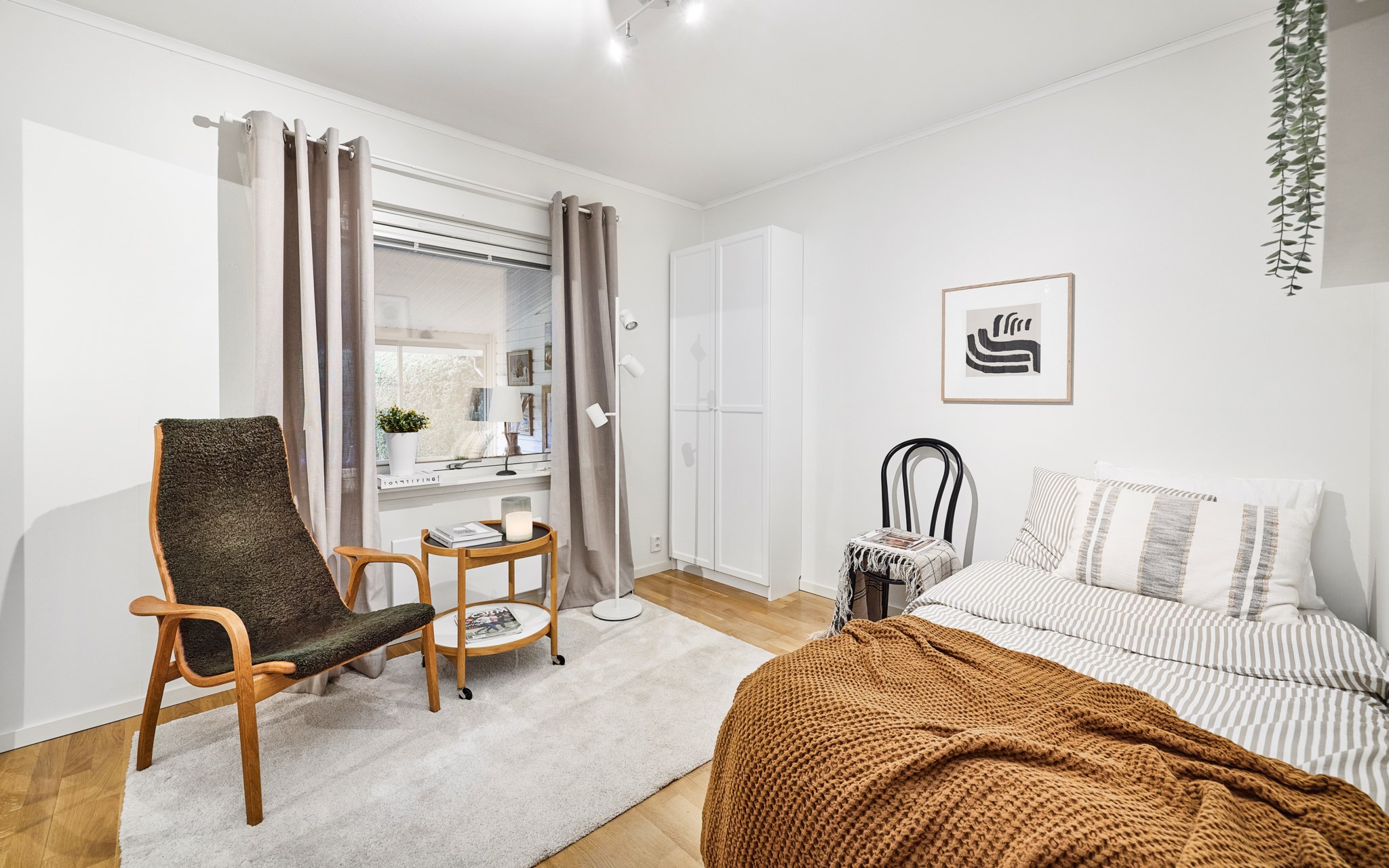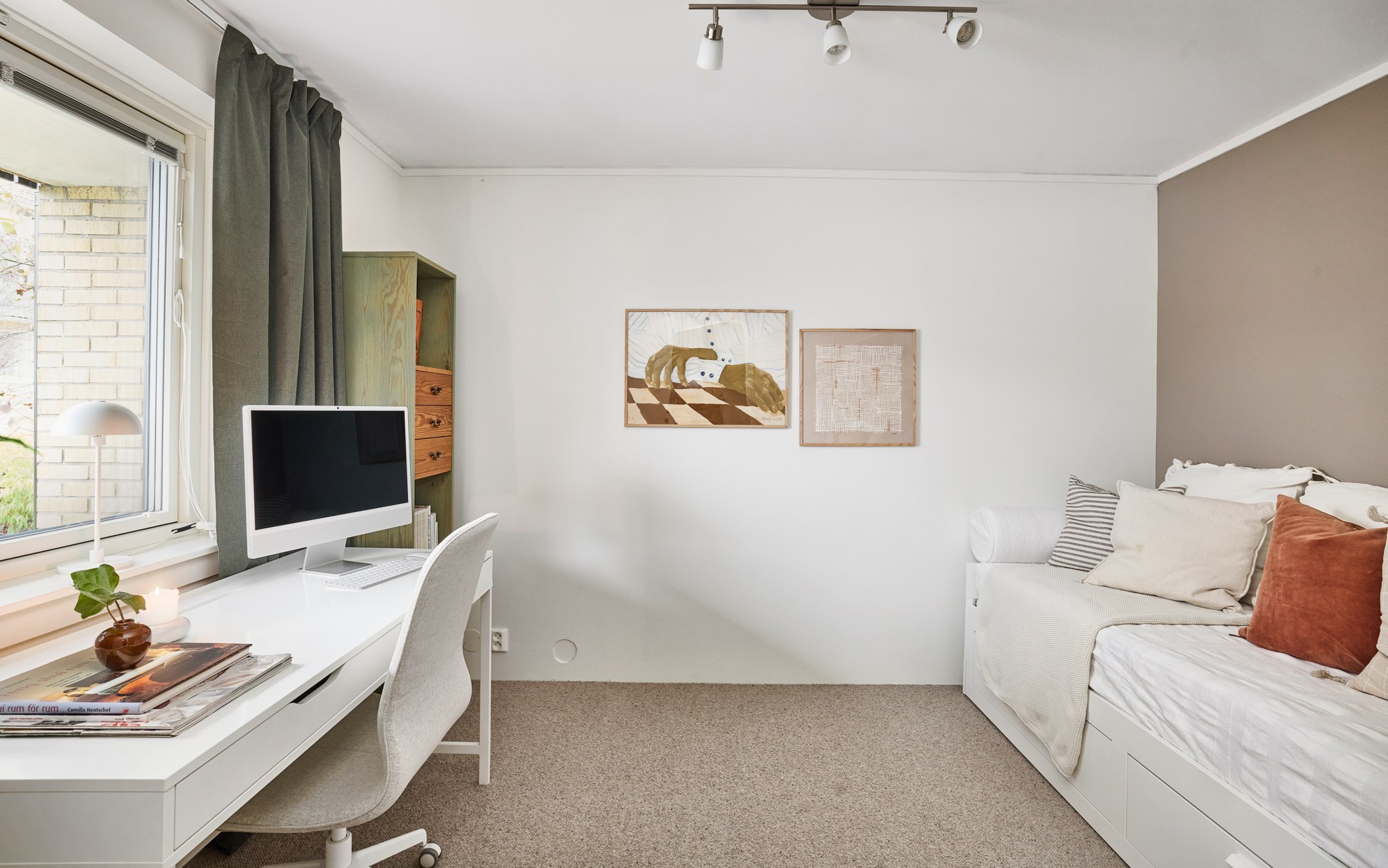 Tre sovrum som huset disponeras i dagsläget, två uppe och ett nere. Stora sängkammaren vetter mot Vättern, ett brett fönster där som nyfiket öppnar en siktlinje ner mot sjön så att du snabbt får ett hum om vind och väderläge. Det något mindre sovrummet har fönstret mot baksidan av huset och trädgården, men med uterummets glas däremellan. Samma fina kvistfria ekparkett i båda rummen och samma som ligger även i vardagsrum och kök. Enhetligt alltid bäst, som sagt. Sovrummet nere har nuvarande ägare använt som arbetsrum. Här ligger en ny mjuk matta på golvet som dämpar ljudet under Teams-möten och värmer fötterna. Stor skjutdörrsgarderob här nere. Hobbyrummet längre in i huset har ett fönster i gaveln och kan fungera som gästrum.