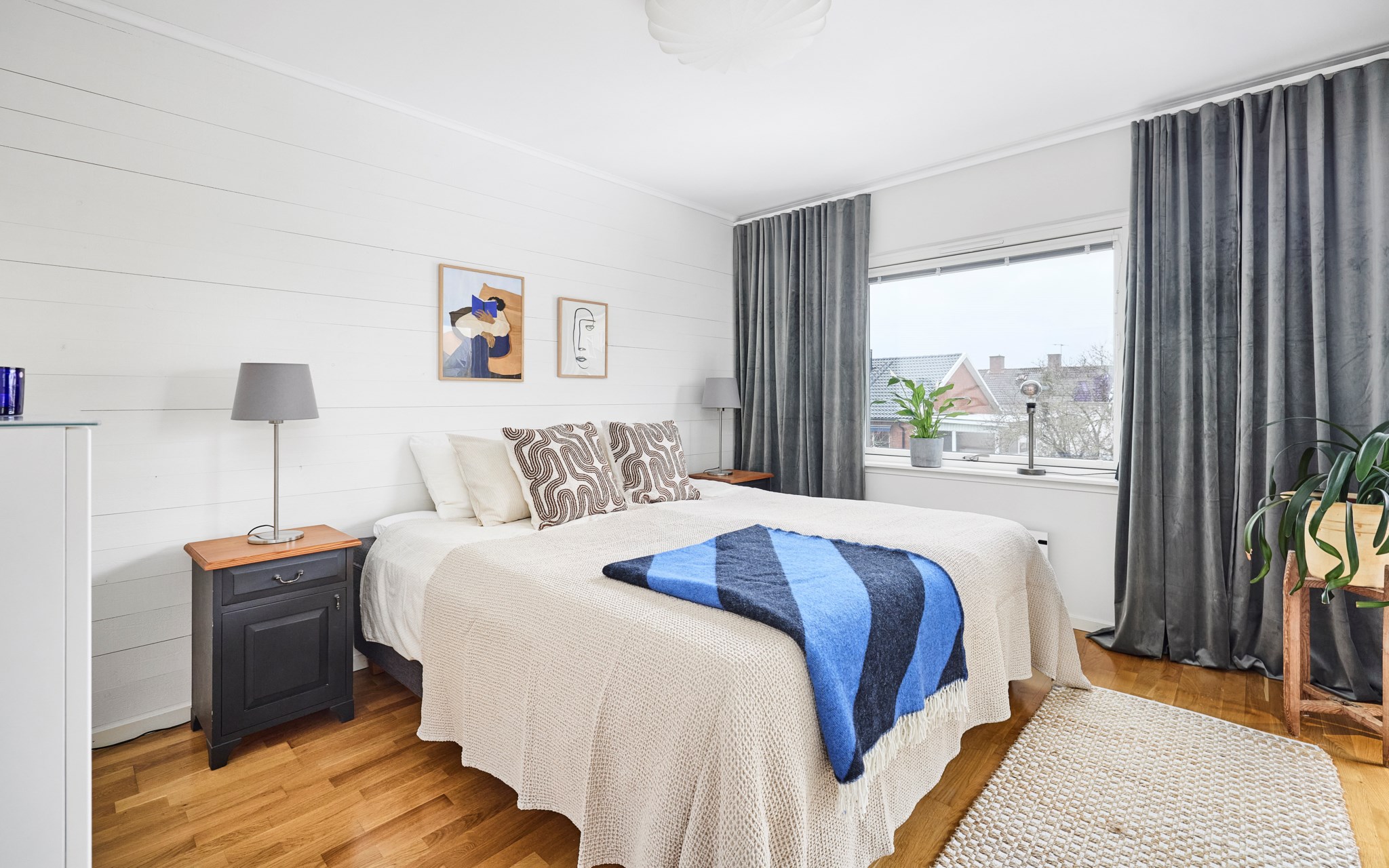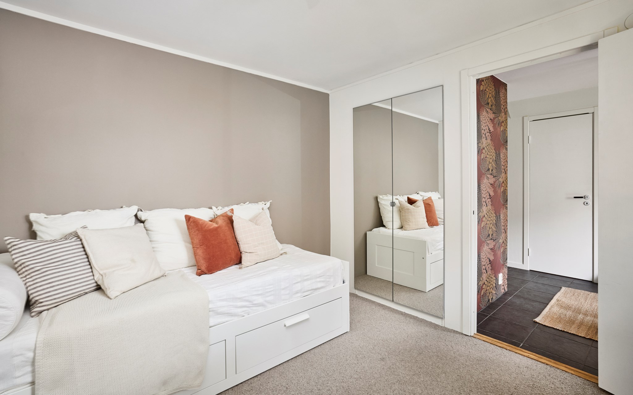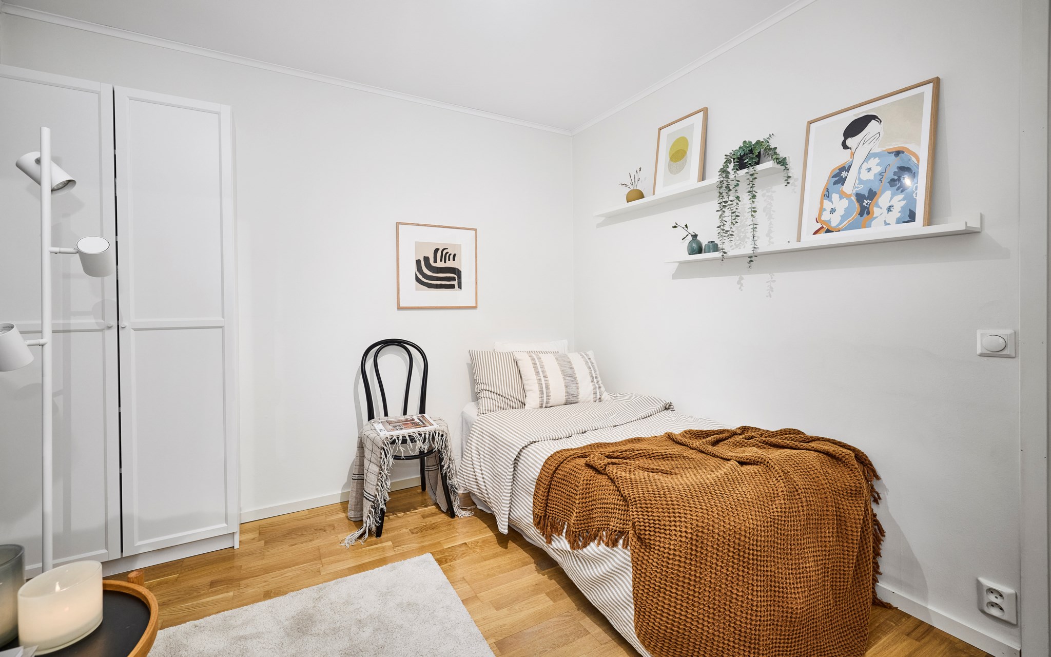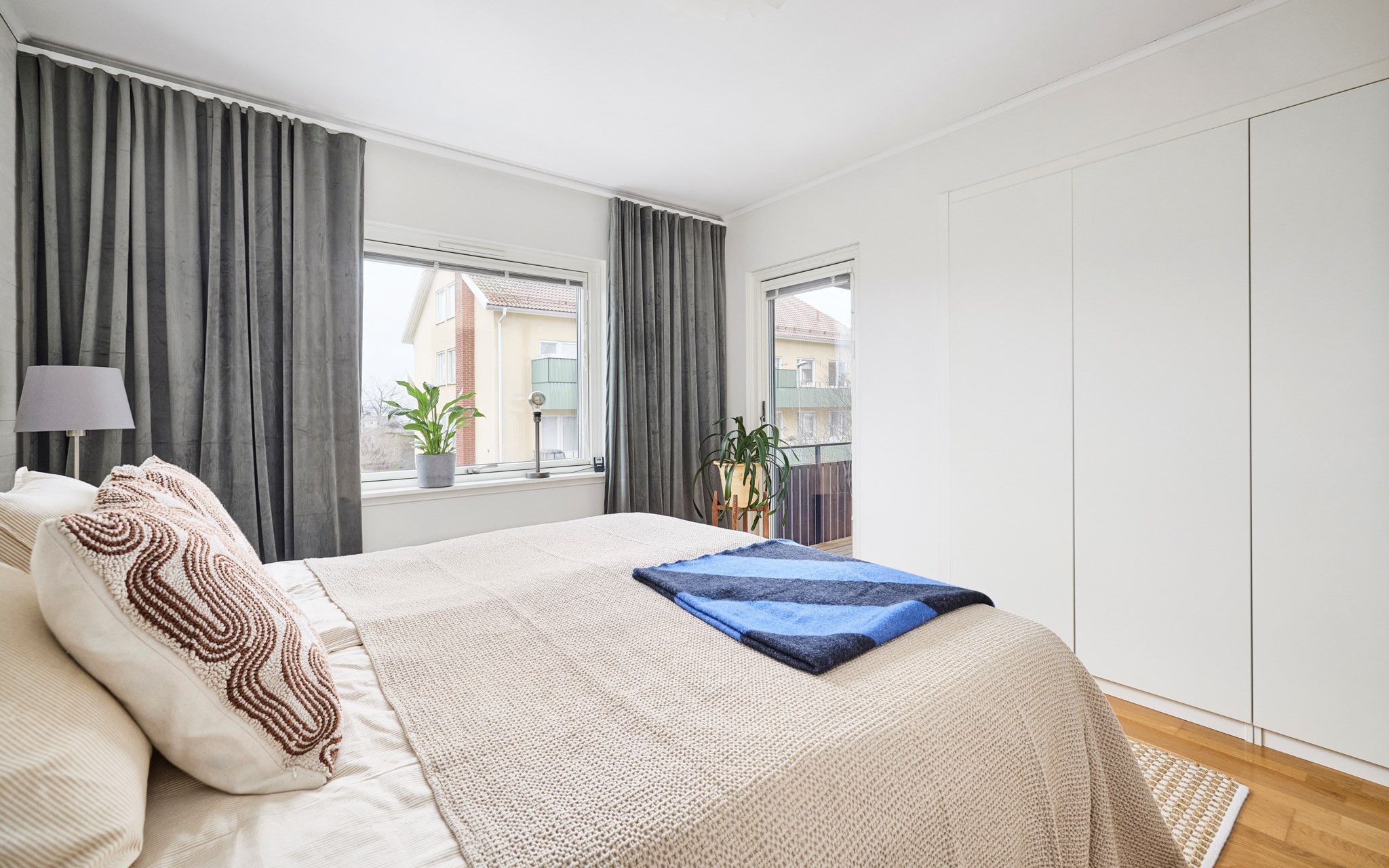 Tre sovrum som huset disponeras i dagsläget, två uppe och ett nere. Stora sängkammaren vetter mot Vättern, ett brett fönster där som nyfiket öppnar en siktlinje ner mot sjön så att du snabbt får ett hum om vind och väderläge. Det något mindre sovrummet har fönstret mot baksidan av huset och trädgården, men med uterummets glas däremellan. Samma fina kvistfria ekparkett i båda rummen och samma som ligger även i vardagsrum och kök. Enhetligt alltid bäst, som sagt. Sovrummet nere har nuvarande ägare använt som arbetsrum. Här ligger en ny mjuk matta på golvet som dämpar ljudet under Teams-möten och värmer fötterna. Stor skjutdörrsgarderob här nere. Hobbyrummet längre in i huset har ett fönster i gaveln och kan fungera som gästrum.