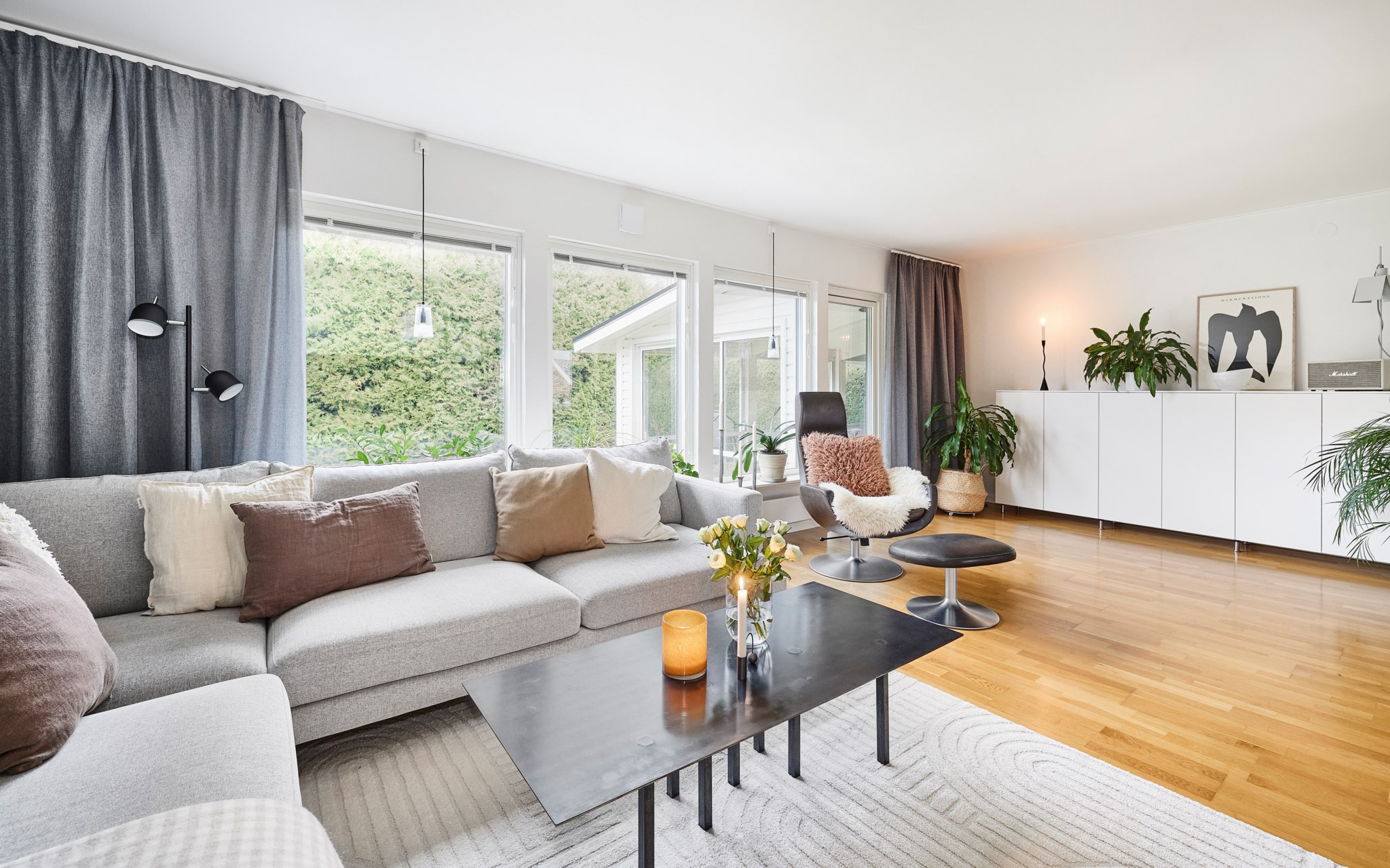 Precis som i köket, har vardagsrummet tre fönster och en dörr. Fast här mot baksidan av huset alltså. Parketten på golvet enhetligt samma som på hela övervåningen. Soffa och matsalsbord, inga problem med plats, som synes. Dörren leder faktiskt inte direkt till trädgården, utan du må passera det inglasade uterummet först. Insynsskyddet från gatan är massivt grönt året runt. En tujahäck som hägnar in hela trädgården till ett privatiserat revir.