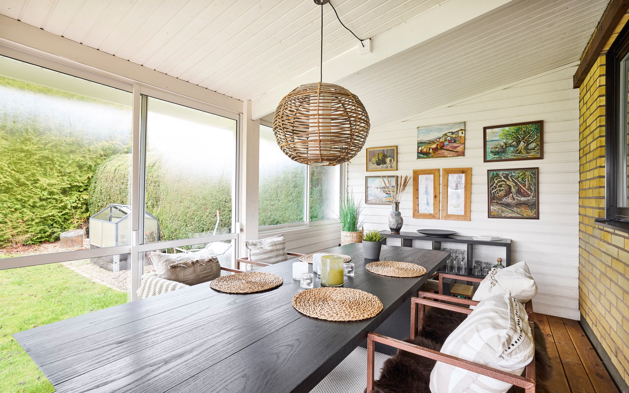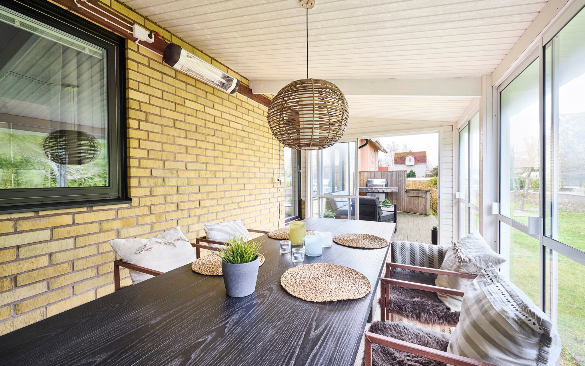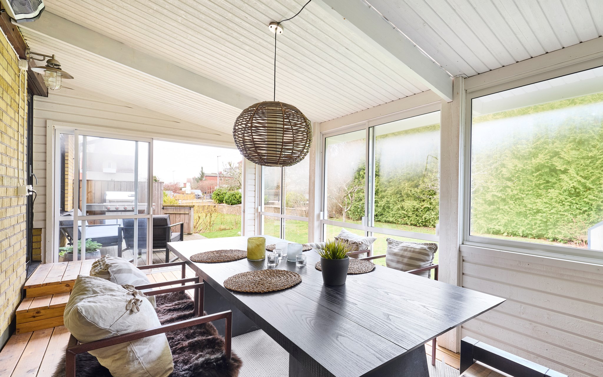 Stadigt och stort byggt av tidigare ägare. Taket helt täckt så att solinstrålningen blir någorlunda behärskad de soligaste dagarna på sommaren. Att i princip allt går att öppna och skjuta bort är också tacksamt dessa dagar. Svensk sommar är dock lynnig så därför har det säkrats upp med infravärme om solen strejkar. Utanför uterummet har du ett stort trädäck dessutom, som har solen på sin sida från lunch till kväll ungefär. Om du håller häcken toppad på sansad nivå blir kvällen soligare och längre.