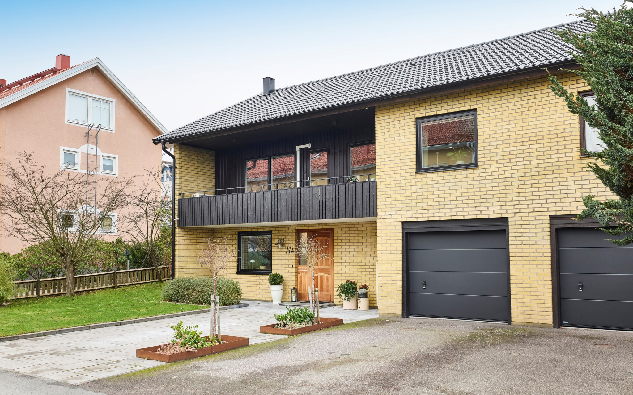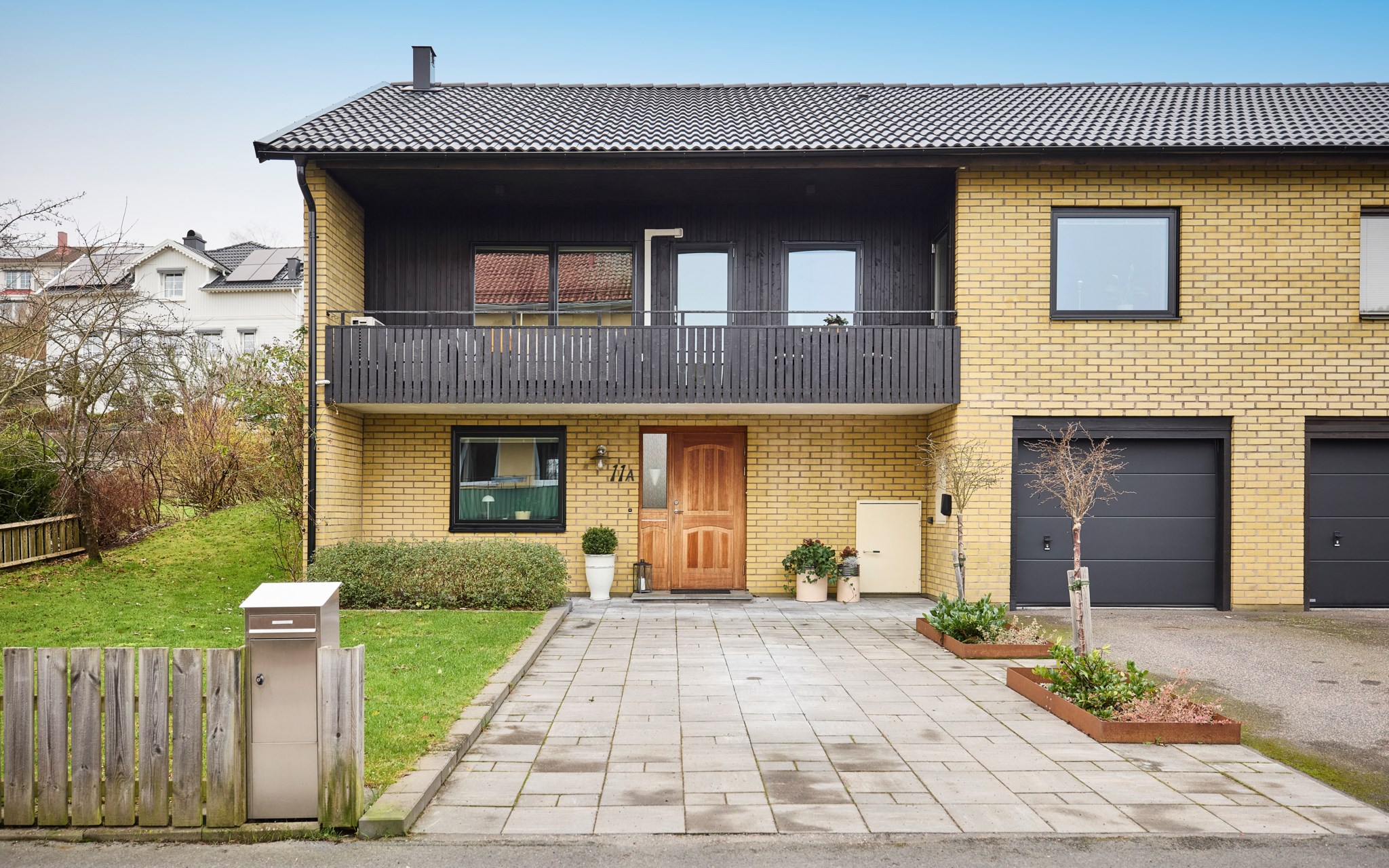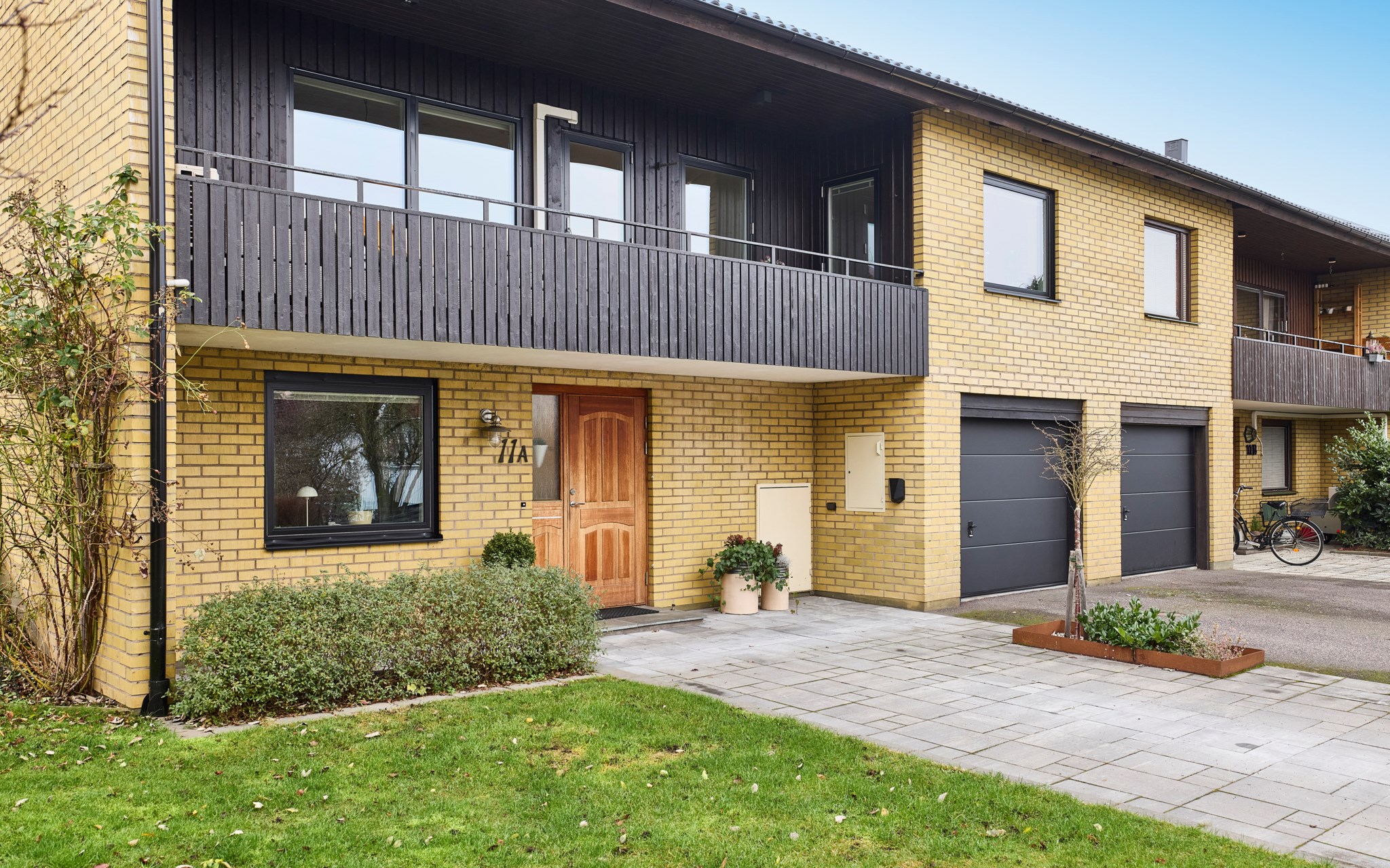 Ett parhus byggt 1973 i suterräng på nedre Bymarkens sluttning. Tegelfasad och gjutet valv gör det till ett ovanligt rejält hus trots ett nättare format. Huset är klokt investerat under senare år med omlagt tak, nya fönster och ny garageport. Ett sovrum på entréplanet nere och två en trappa upp. Men sen har du ytterligare ett rum nere som kan fungera som gästrum, gym eller något helt annat som väcker ditt intresse och ryms inom fyra väggar. Stort uterum tillbyggt på baksidan som kan förlänga sommarkvällarna ända till oktober. Balkongen sträcker sig under tak utmed hela köket.