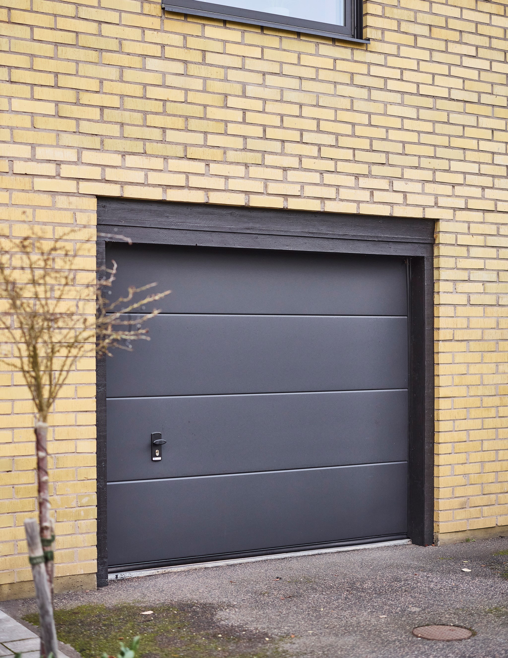 Du och grannens garage ligger vägg i vägg med varandra indraget i den gemensamma huskroppen. Fördel på två sätt – dels ökar den privata sfären och integriteten mellan husen då era entrédörrar får lite distans. Sen är alltid integrerade garage snyggast för helheten jämfört med alla fristående, tillbyggda garage som syns i våra villakvarter. Garaget i sig inte så dumt, plats för både bil och en del annat du vill pyssla. Arbetsbänk och hyllor inga problem, men visst kan det bli fullt om du har hamsterns samlingsinstinkter. Både grannens och din port bytta nyligen.