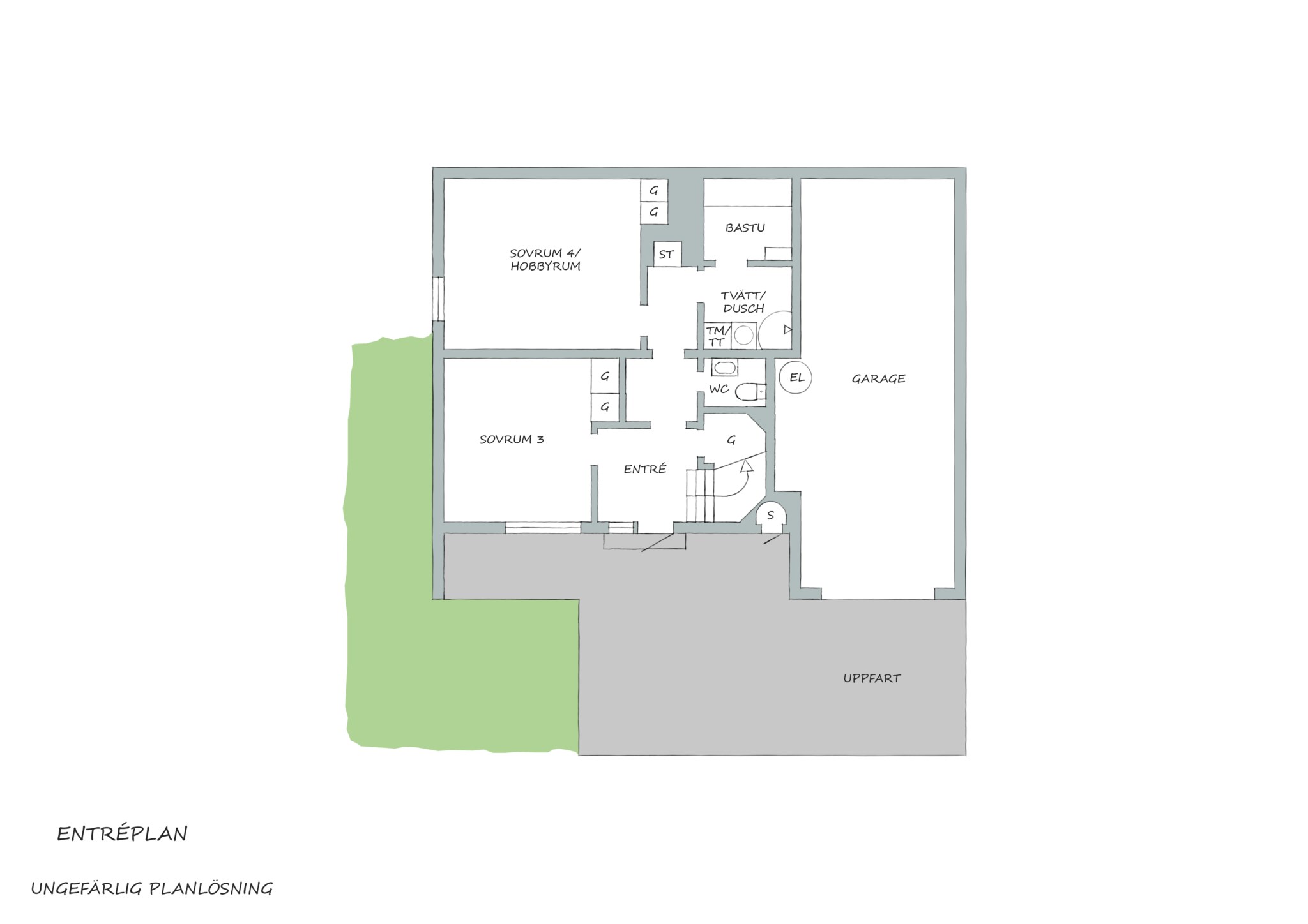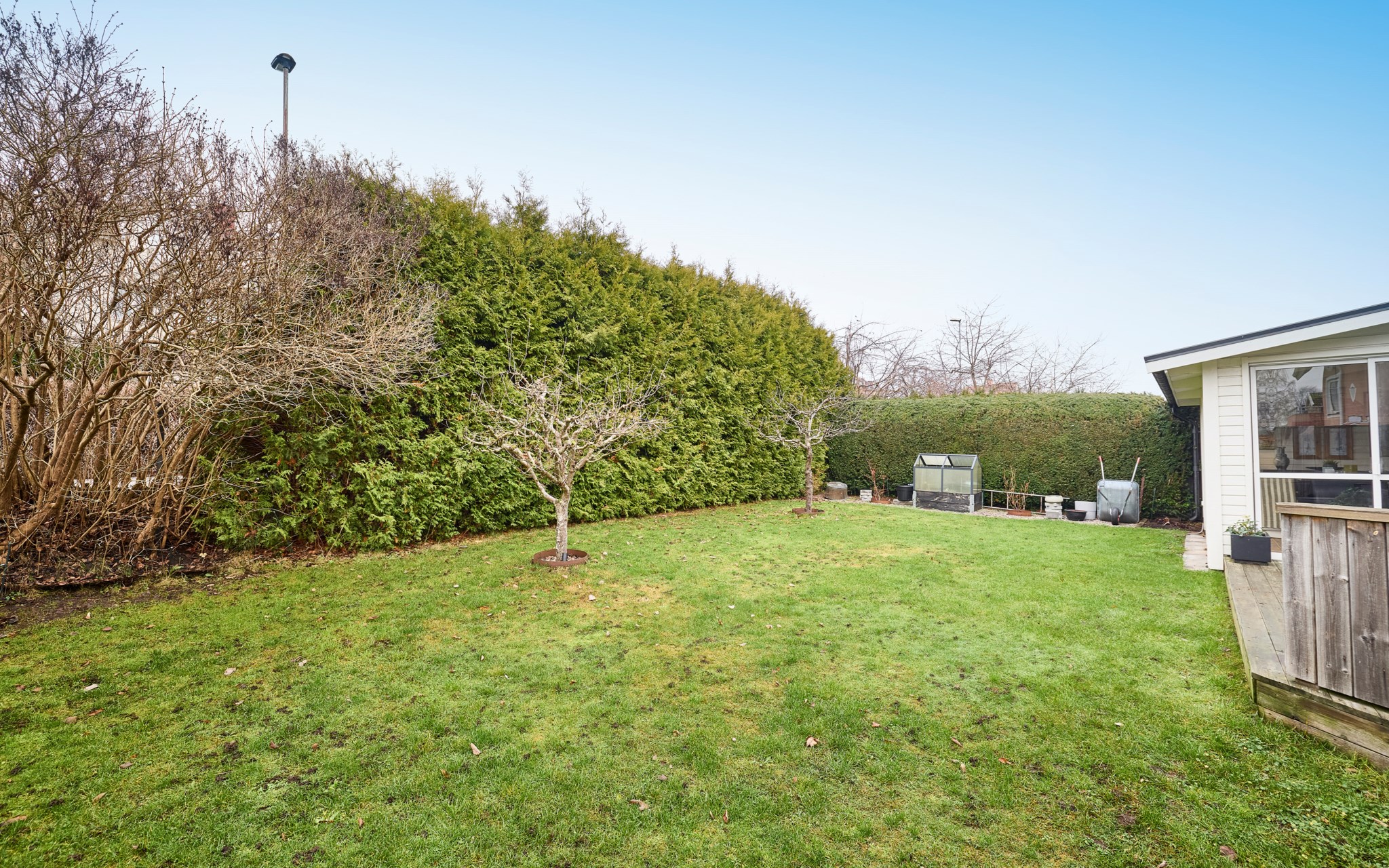 Fördelen med ditt södervända hus är att trädgården är frodig på alla sidor. Framsidan med ganska jämn fördelning mellan hårda och mjuka ytor. Två bilar parkerar lätt framför huset, och en inne i garaget så klart. Sen har du diverse prydliga träd och häckar. Rosenbusken tittar kärleksröd fram runt husknuten. Det söta och ätliga hittar du på baksidan av huset, och då i form av äpplen och björnbär, blåbär och vinbär, som allihop gör sig bra i söndagspajen inser du snabbt, men kanske inte alla på samma gång. Nuvarande ägare flyttade hit för att få ett smidigare boende och har därför satsat lättskött. För den som vill, finns dock många kvadrat gräsmatta som kan bli både blommigare och ätligare.